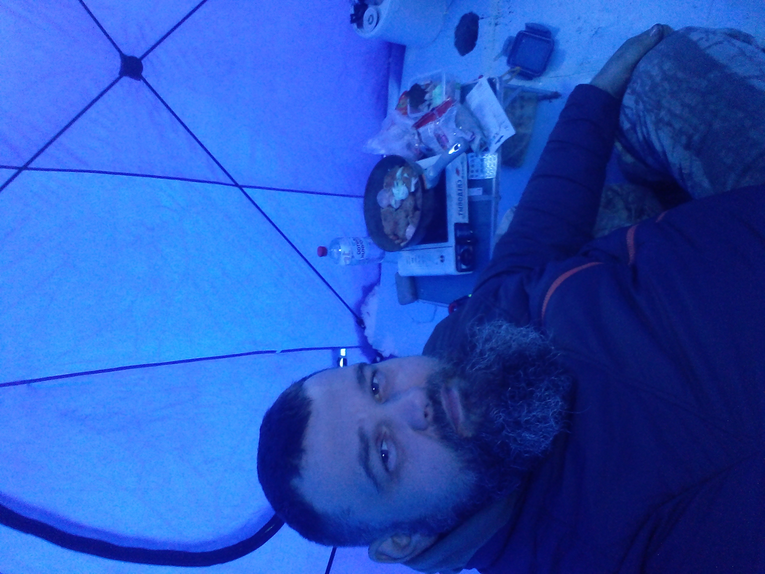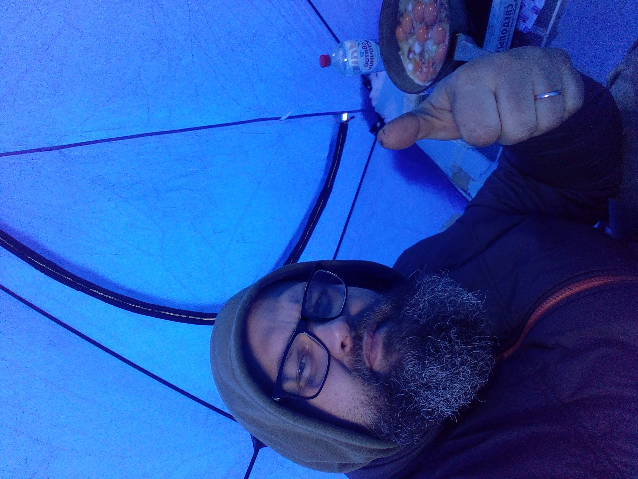 И вот, я у цели! Вернее, цель моего путешествия - русло, до которого ещё идти около километра. Укладываю скарб в сани и начинаю неспешный путь сквозь темноту. Сапоги с чавкающими звуками проваливаются в снежную «кашу», фонарик «выхватывает» из темноты чьи-то редкие следы – значит я уже не первый сегодня! По мере продвижения, охватывало чувство какой-то полной пустоты, будто бы находишься не рядом с миллионным городом, а в какой-то безлюдной снежной пустыне. Лишь пройдя с пол километра, замечаю где-то вдалеке несколько светящихся палаток в одной месте. Чувство пустоты резко улетучилось. Всё-таки человек по своей натуре - существо социальное.