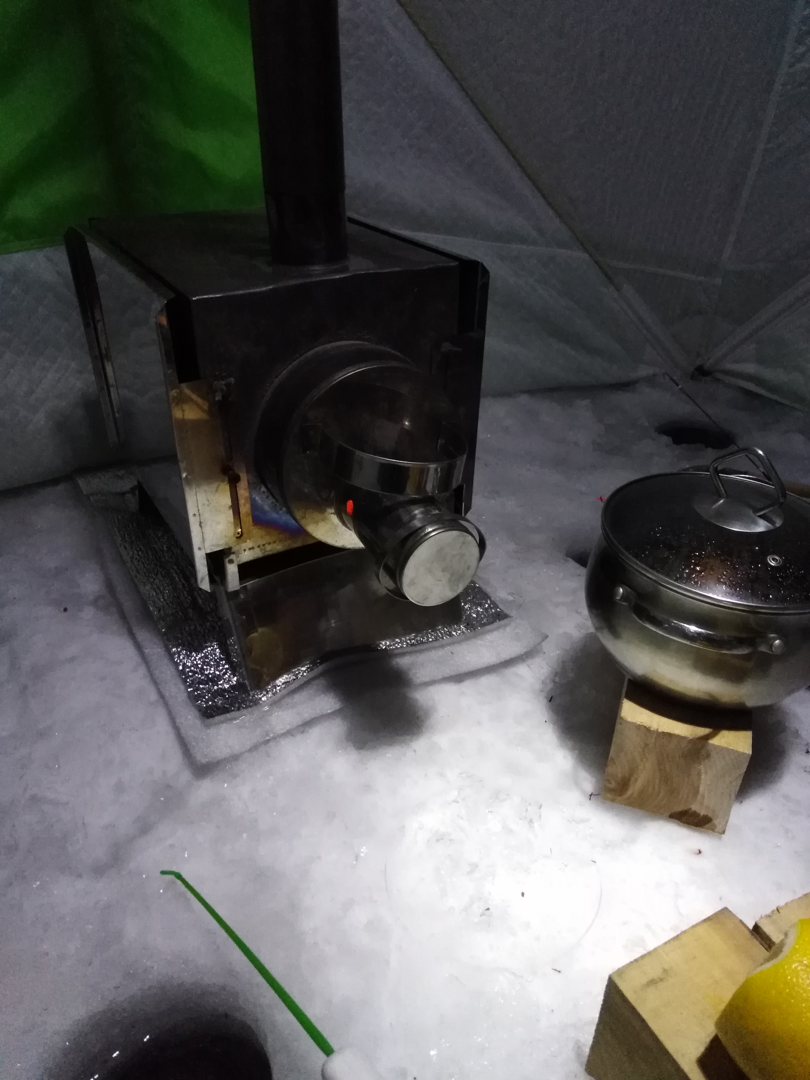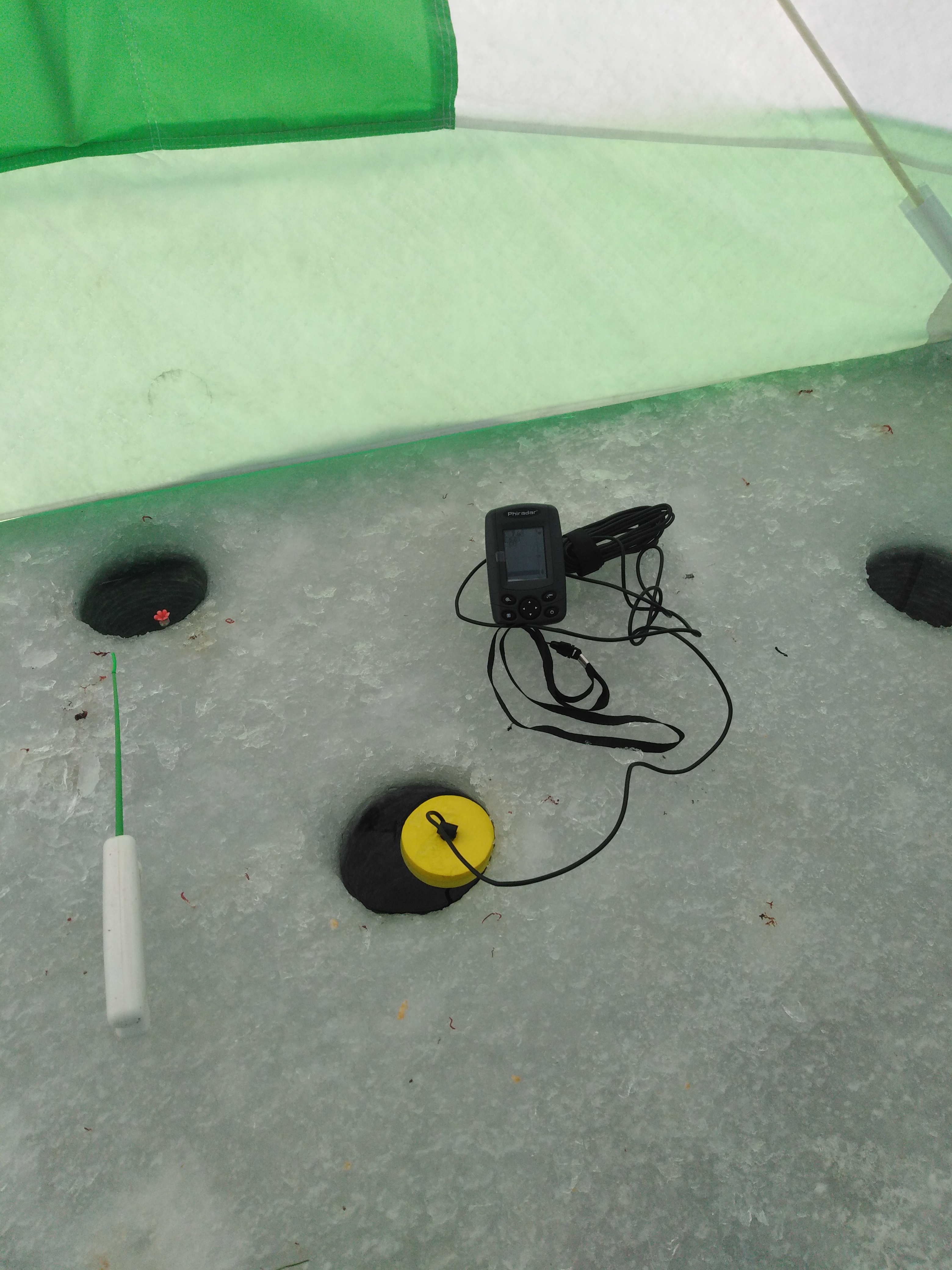 Наконец-то путешествие закончено! Глубина 7,8 м. Ставлю палатку и начинаю утренний закорм, который является очень важным моментов в зимней рыбалке. Опускаю по одной кормушке с кормовым мотылём в каждую лунку, настраиваю удочки с новыми сигнализаторами и замираю в предвкушении поклёвок.