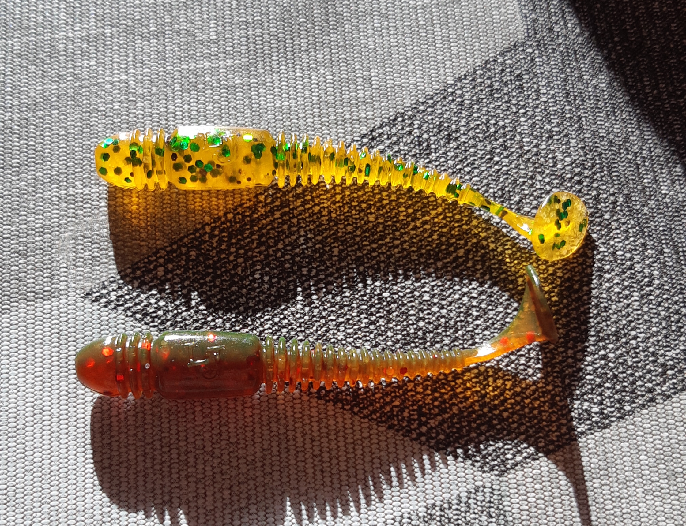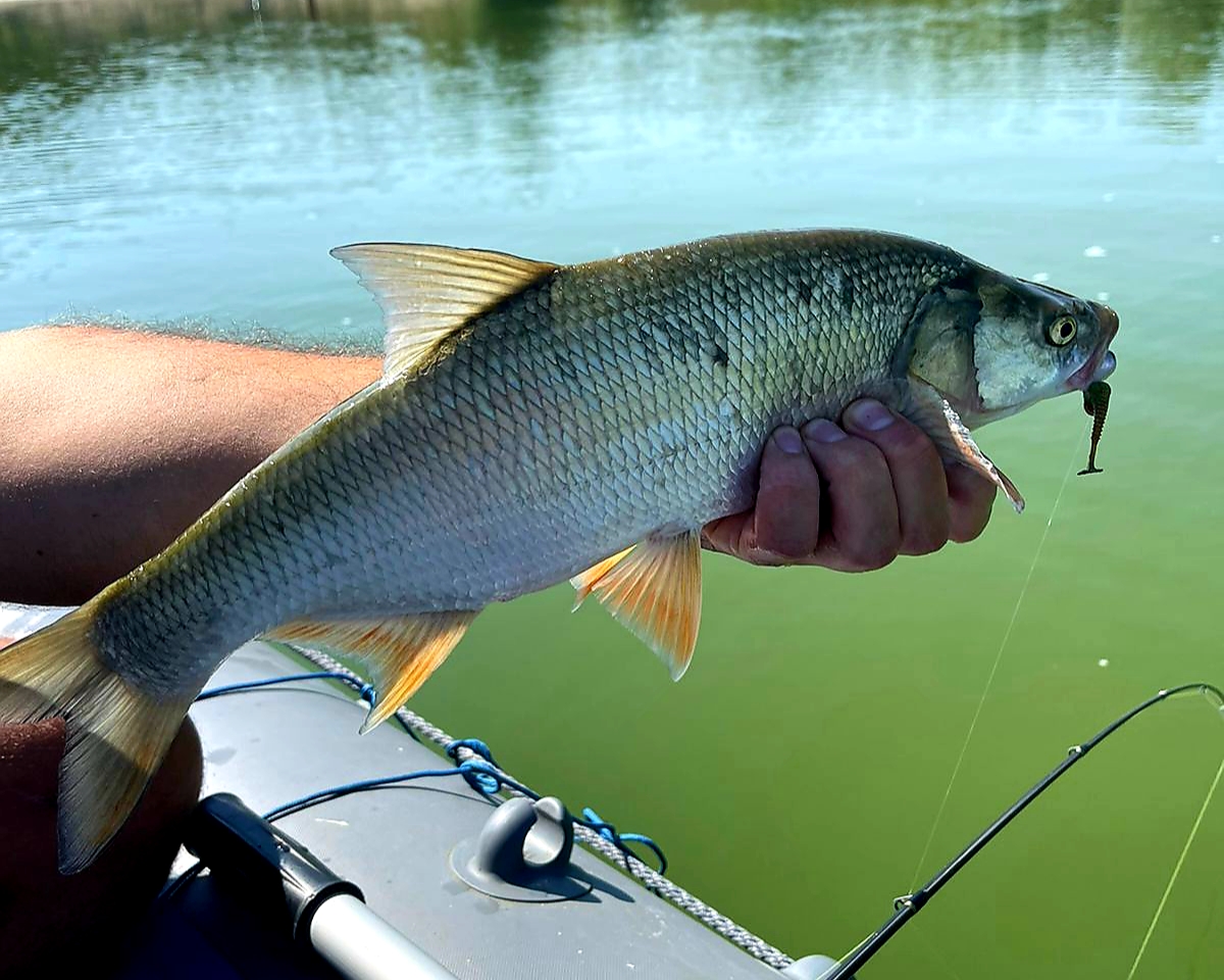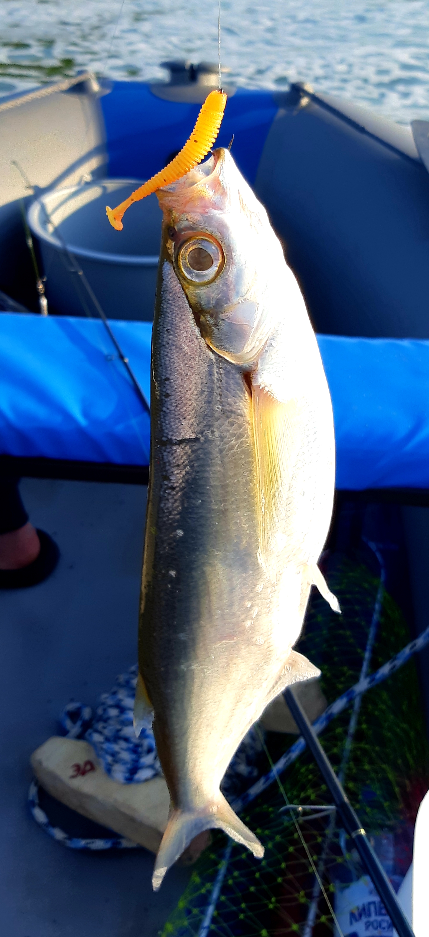 Забыл. Ловили на отводной, лучше всех работала Ларва 2.5 фиолет