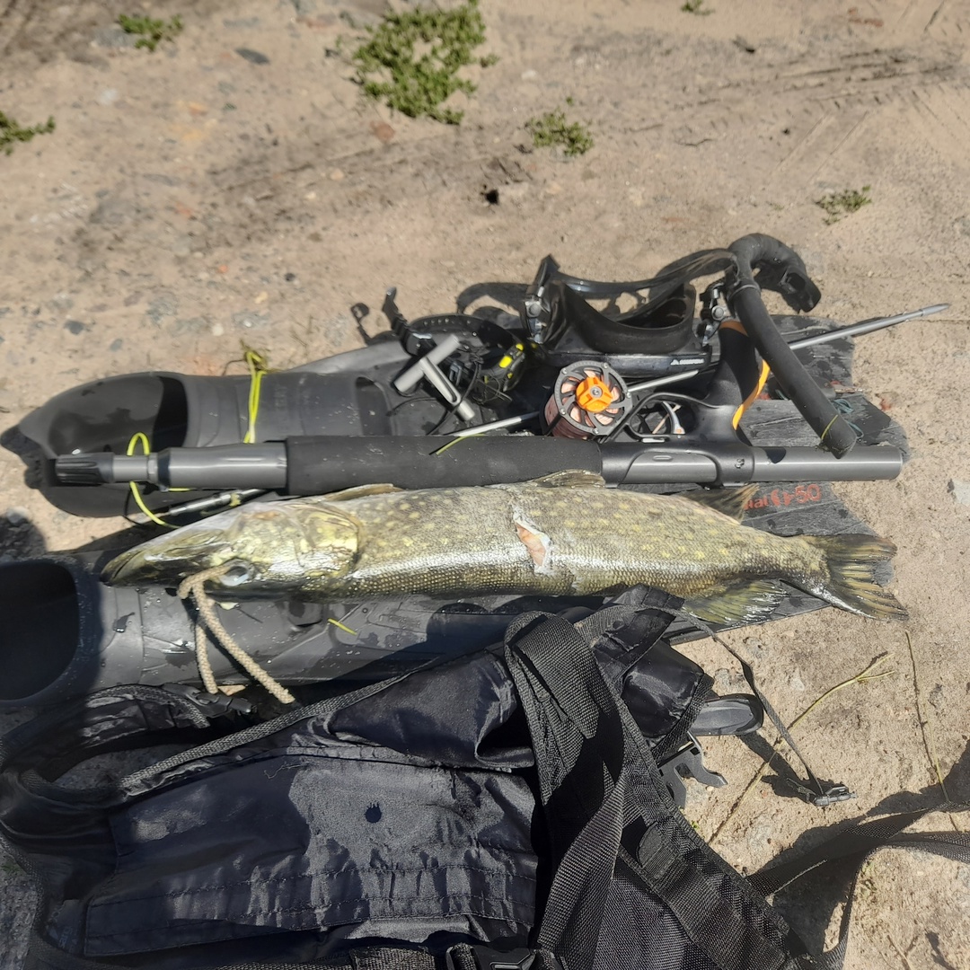 Сегодня утром плавал от санатория к яме между намытым островом и о. Горького. Меня интересовала та сторона ямы, которая не прилегает ни к одному из островов. Вдруг обитатели глубины выйдут кормиться на поля и станут моей добычей. Не знаю, может, ночью так и было бы, а утром получилось скорее наоборот. Иду по бровке на 2-3 м и ныряю по свалу. Метрах на 7-8 обдаёт холодом, а видимость падает сантиметров до 30. Родники. Отворачиваю от мутняка и вижу на 5-6 метрах щуку, отдыхающую после охоты на мелководье. Выстрел и всплытие. Линь идёт тяжело, похоже, гарпун воткнулся в дно. Вот так вытягивать гарпун вместе с рыбой рискованно, может порваться и уйти, особенно щука, она совсем мягкая. Подтягиваю её и вижу, что её перехлестнуло линём. Надо совсем аккуратно, если что, дать ей и погулять. За 3 потяга она сматывает почти всю катушку, остаётся метров 5 линя или меньше, но - на катухе было 25 метров линя, плюс 4 метра основного. А глубина в яме метров 13. В конце концов усталая рыба ложится на дно, а потом даёт подтянуть и закуканить себя без проблем. Несмотря на то, что лепесток гарпуна не раскрылся, сидела она надёжно