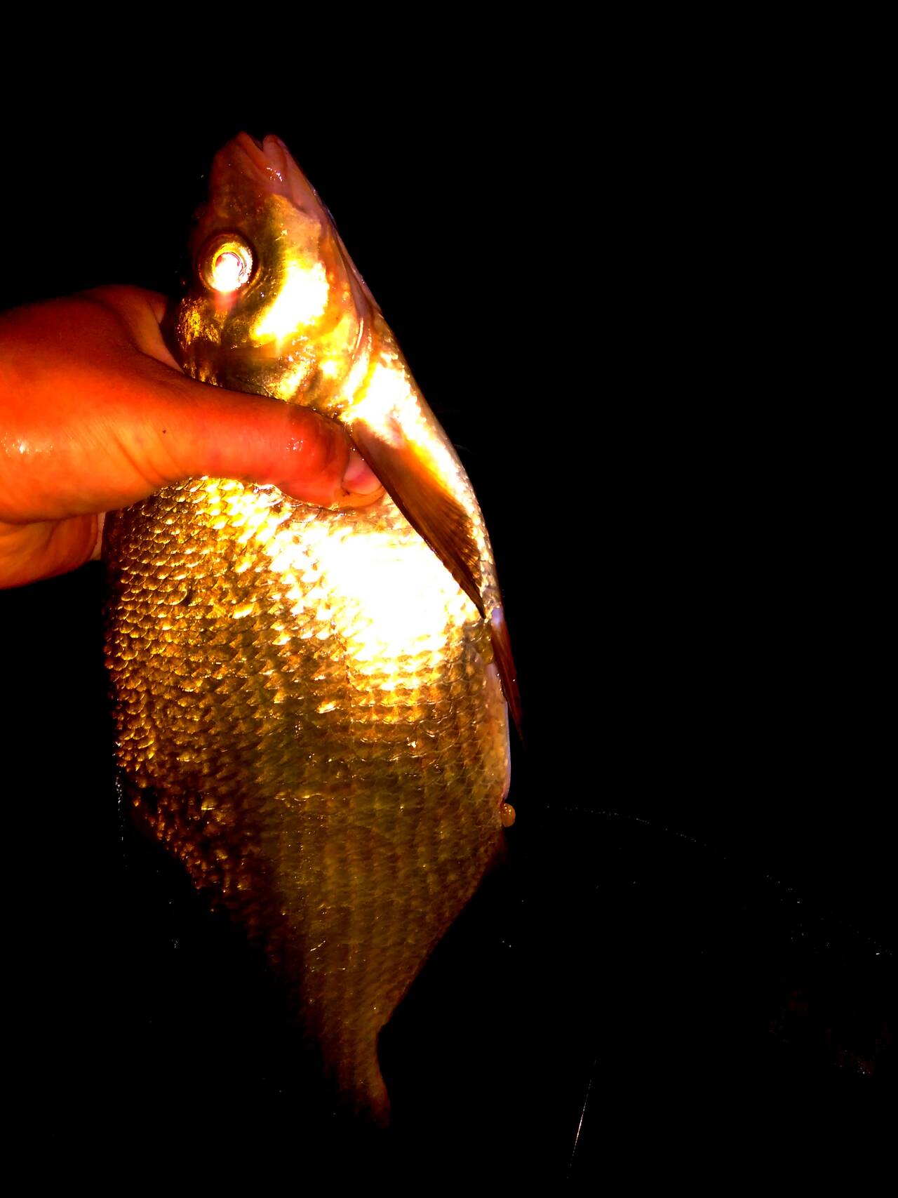 Берег крутоват, до воды около метра, неудобно подводить к подсаку. Минут 7-8 мы с ней занимались перетягиванием лески. Рыб упорно пытался зайти за дерево, но обошлось.