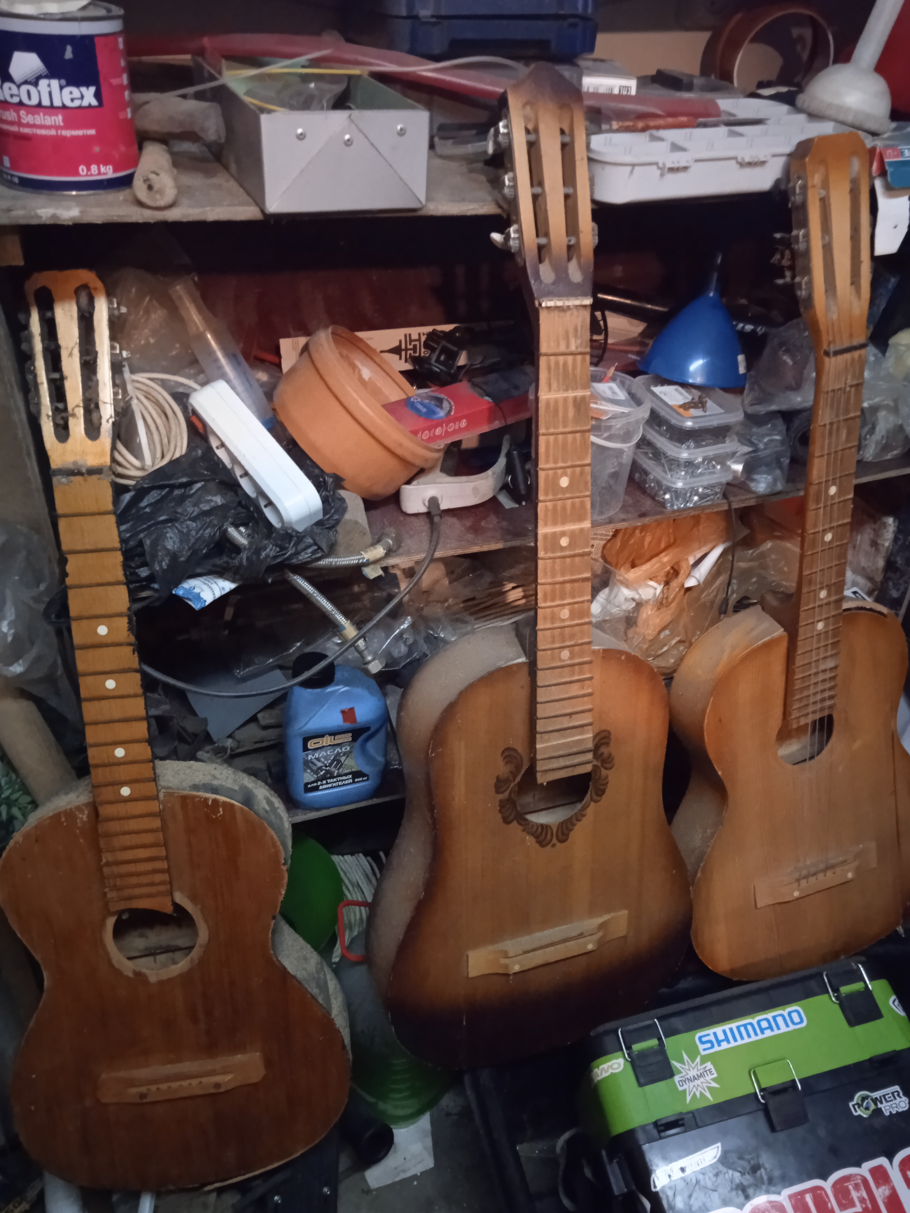 Мужики! Может кому пригодятся, короче три гитары нашел в сарае. Они без струн, почти, деки рассохлись, грифы вроде целые, 6 или 7 струновые, не обратил внимания.