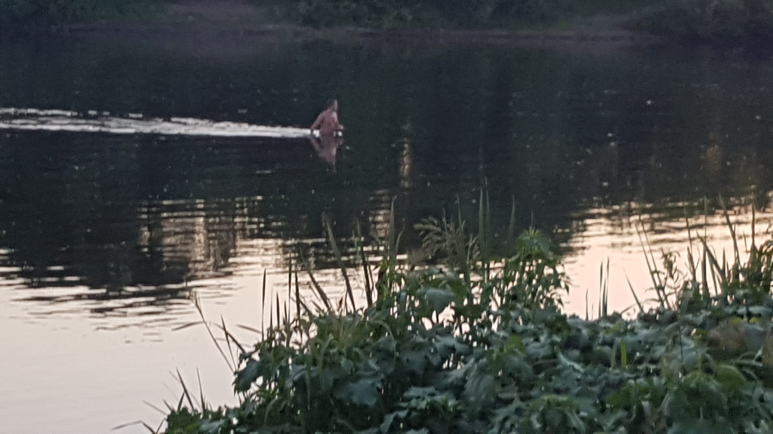 И тут выясняется, что забыли оба садка дома, с собой пару свободных ведер по 12 литров, жара за тридцать.Три варианта, выпустить или ехать мне в Шилово за садком, покупать , ну и третий, поехать домой с сазанчиком.Выбираем первый - сын в сапогах заходит как может по илу к воде и выпускает его, рыба стоит минуты три, не двигаясь, подталкиваем его подсаком и усталый после борьбы сазанчик уплывает. Жена смотрит на нас и говорит: "Раз забыли садки - быть хорошей рыбалке,"