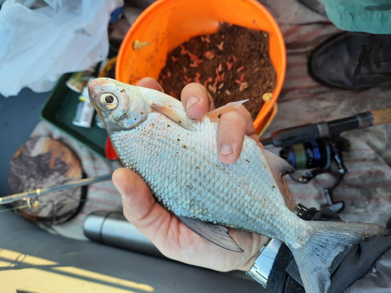 Итак, сегодня. Первый день неожиданного отпуска. Вчера хищников поймал, поэтому сегодня решил на бель с фидером. Свободных мест на берегу полно, но как известно, лучше клюет под тем берегом... Качаю лодку, мешаю прикормку с кормовым мотылем  и в бой.  Поклевок море на каждом забросе. Но это лишь проделки лаврушки, которая сразу отправлялась за борт. Нормальную рыбу дождался только, когда перешел на навозного червя. Т.к. забыл подсак, несколько подлещей слил у лодки. Зато подкилошный карась спасовал.  В 8-00 запасмурнело, подул холодный ветер, и без того капризный клев сошел на нет.