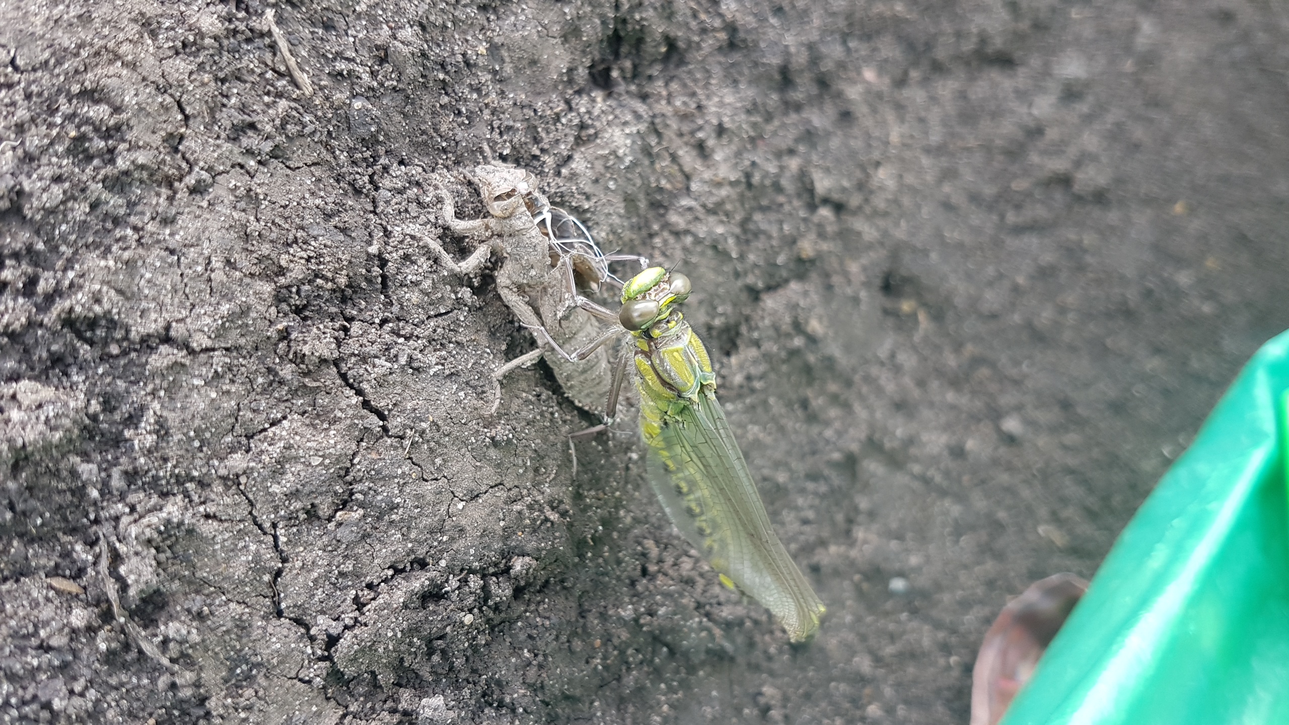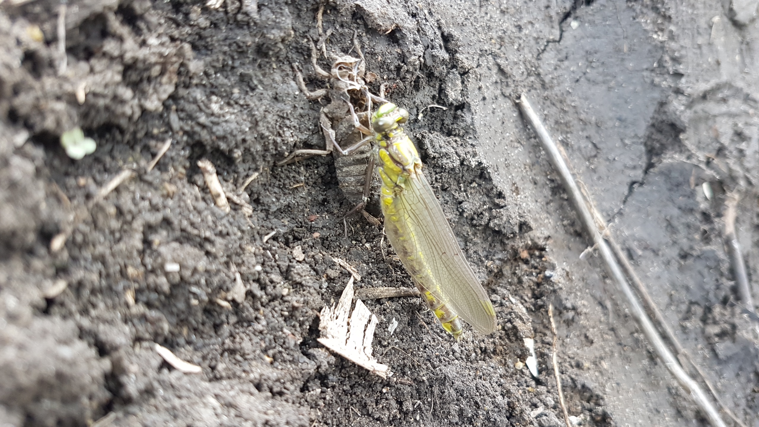 Первый раз видел выход личинки стрекозы из воды на берег. Вышла из своей 'скорлупки', обсохла и полетела.