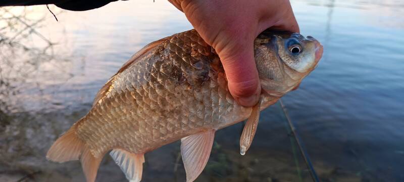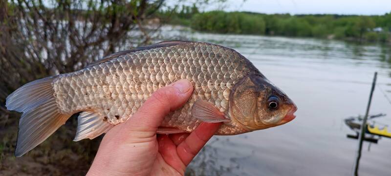 Неспешно разбираю фидер, остатки прикормки с прошлых рыбалок и червь с опариком на 14 крючке летят в воду. Дистанция около 25 метров, после третьего заброса удилище начинает плясать на стойке. Помня по прошлым рыбалкам о ночных разбойнках (норках, лисах и ондатрах), пойманный до темноты пяток карасевичей был отдан соседям, сам после принятия вечернего "чая" ухожу спать в машину. Ночка выдалась теплой и соловьиной. Подъем в 4 утра, замес свежей прикормки ( три вида Дунаева + немного кукурузы+ горсть перловки + полпачки дешёвого Геркулеса). Заброс заклипсованого с вечера фидера с патерностером и тут же поклёвка - сход! До восхода солнца клевало на каждом забросе, но реализация хромала, припарковал трёх неплохих карасиков. Пригревать начало сразу после семи утра, а в 10 уже жарило по летнему. Рыба начала капризничать, поклёвки стали реже, но зато увеличился размер - меньше 400 грамм рыб не было, самый крупный потянул на около семисот. До двух дня наскирдовал десятилитровое ведёрко, больных (с красными пятнами на плавниках и чешуе) топил сразу, но их было не много. Выездом доволен, всем НХНЧ!