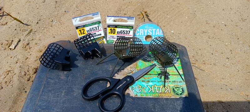 Покидав маркерный груз остановился на небольшом приямке с ракушкой между отмелью и береговым свалом. Дистанция получилась около 20 метров, на которой кормушка 80 грамм уверенно держалась. С поводками и крючками не мельчил, поставил 0,18 леску и довольно крупные «червячные» крючки с бороздками на цевье. Монтаж, как обычно – скользящий, быстро вяжется и ничего не путается. Прикормку замешал с ярко выраженным чесночным оттенком, сдобрив небольшим количеством консервированной кукурузы и мелкого 2-х мм пелетса, оставшегося ещё с прошлого года.