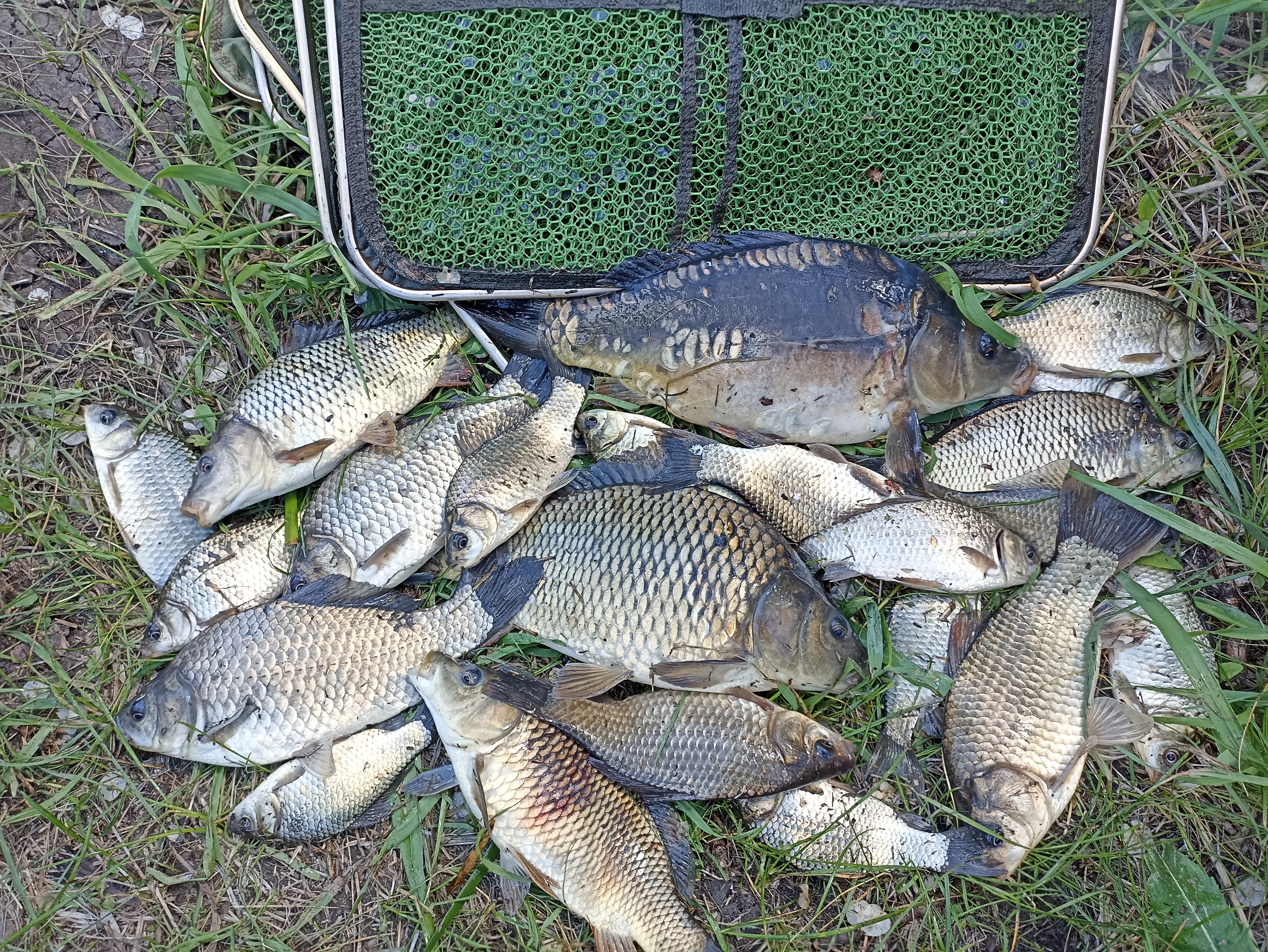 Приветствую коллеги! Сегодня в компании друзей навестили пруд, тот что на въезде справа. Ловили исключительно на поплавки, насадка стандартная - бутерброд кукуруза + пару опариков. Карась по всему пруду устроил нерестовые игрища, прибрежная растительность прям кипела от женихов с невестами Клевало весело, в основном караси, но иногда проскакивали и карпята. Взял двух самых пузатых на поесть, остальных выпустил расти дальше: