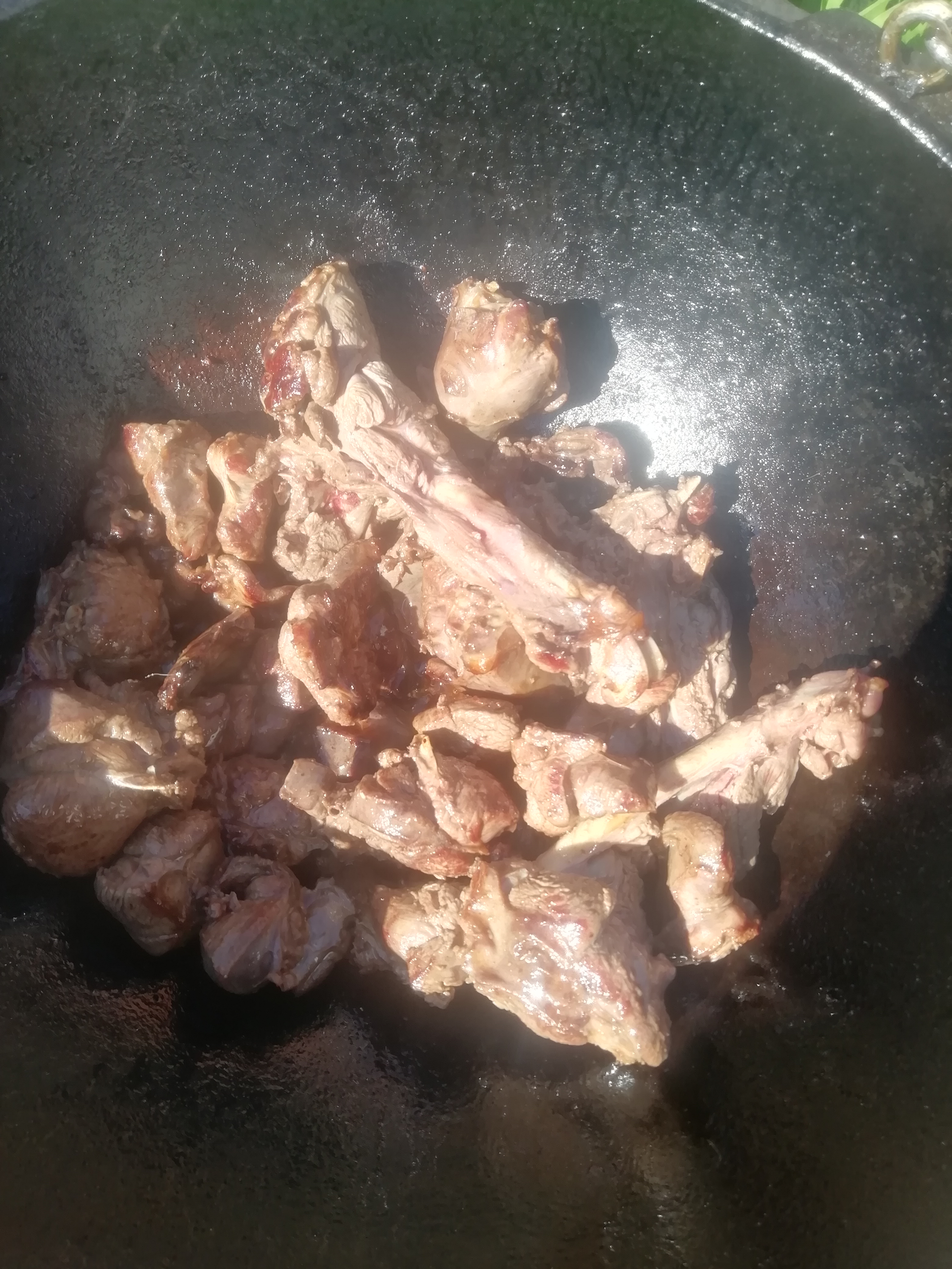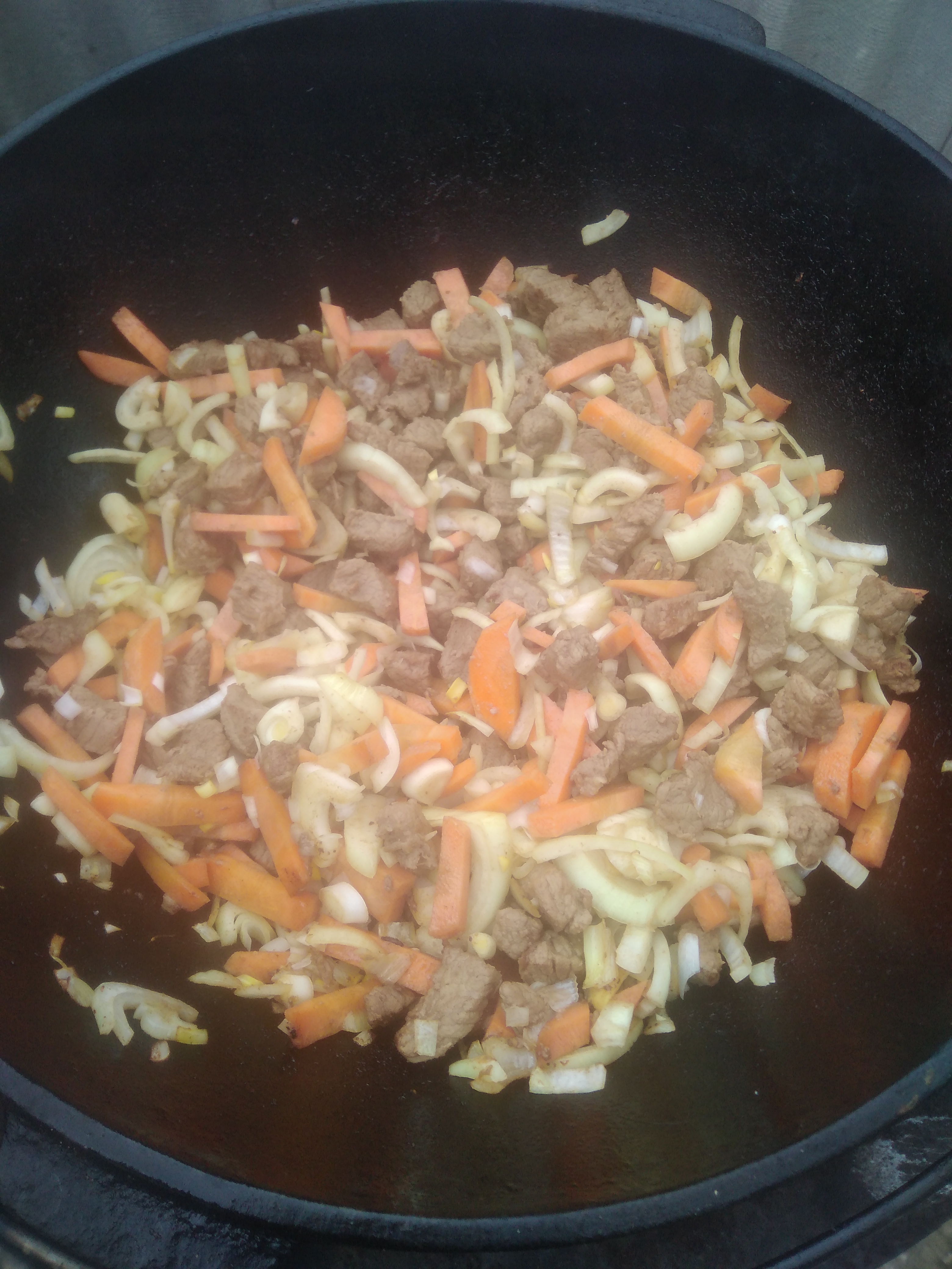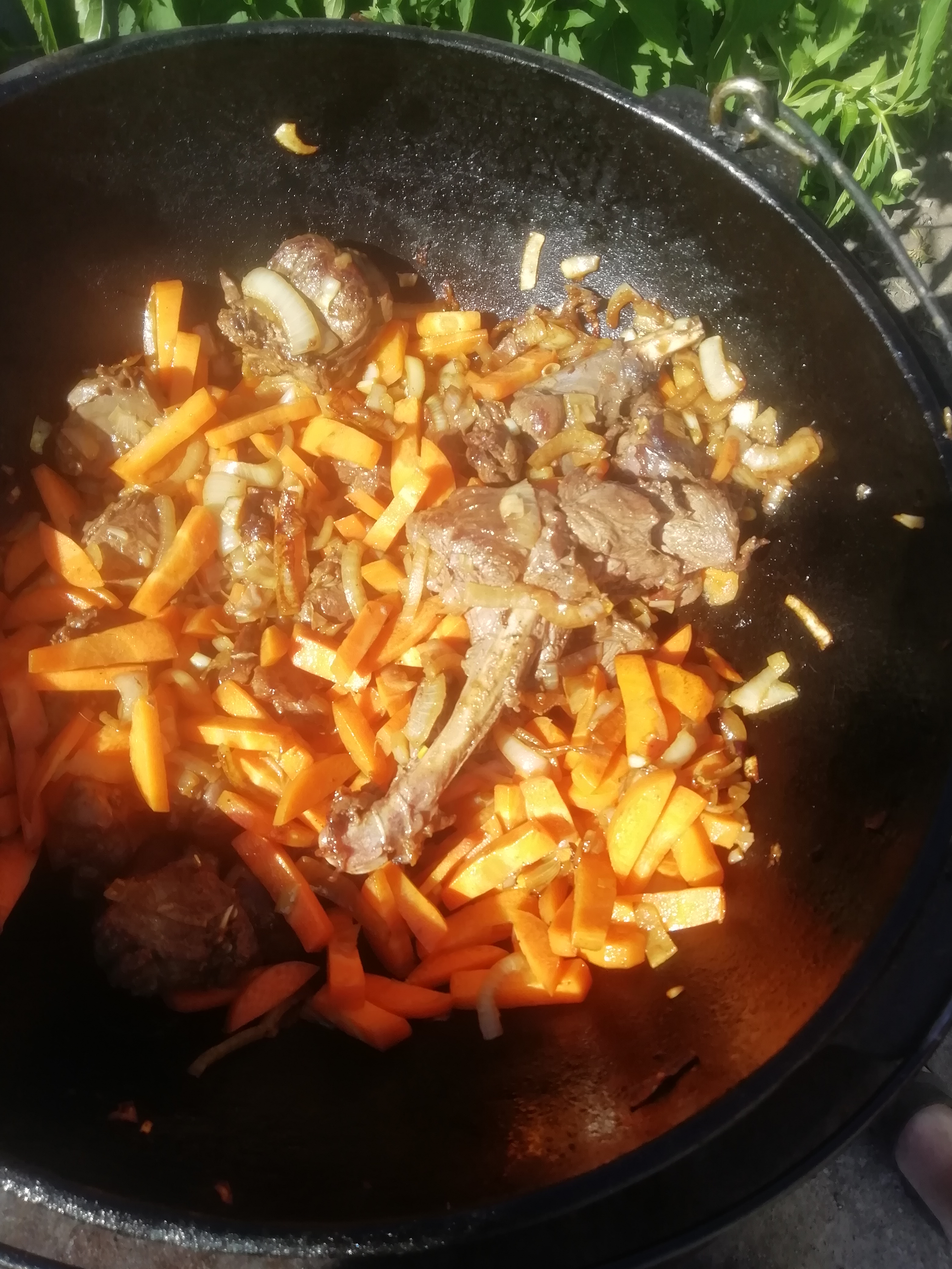 Мясо в масле обжаривал в казане, убрал в кастрюлю, потом кортошку молодую не чищенную в этом же масле до полуготовности, сверху обжаренне мясо, лук, перец, и под крышкой до готовности.
