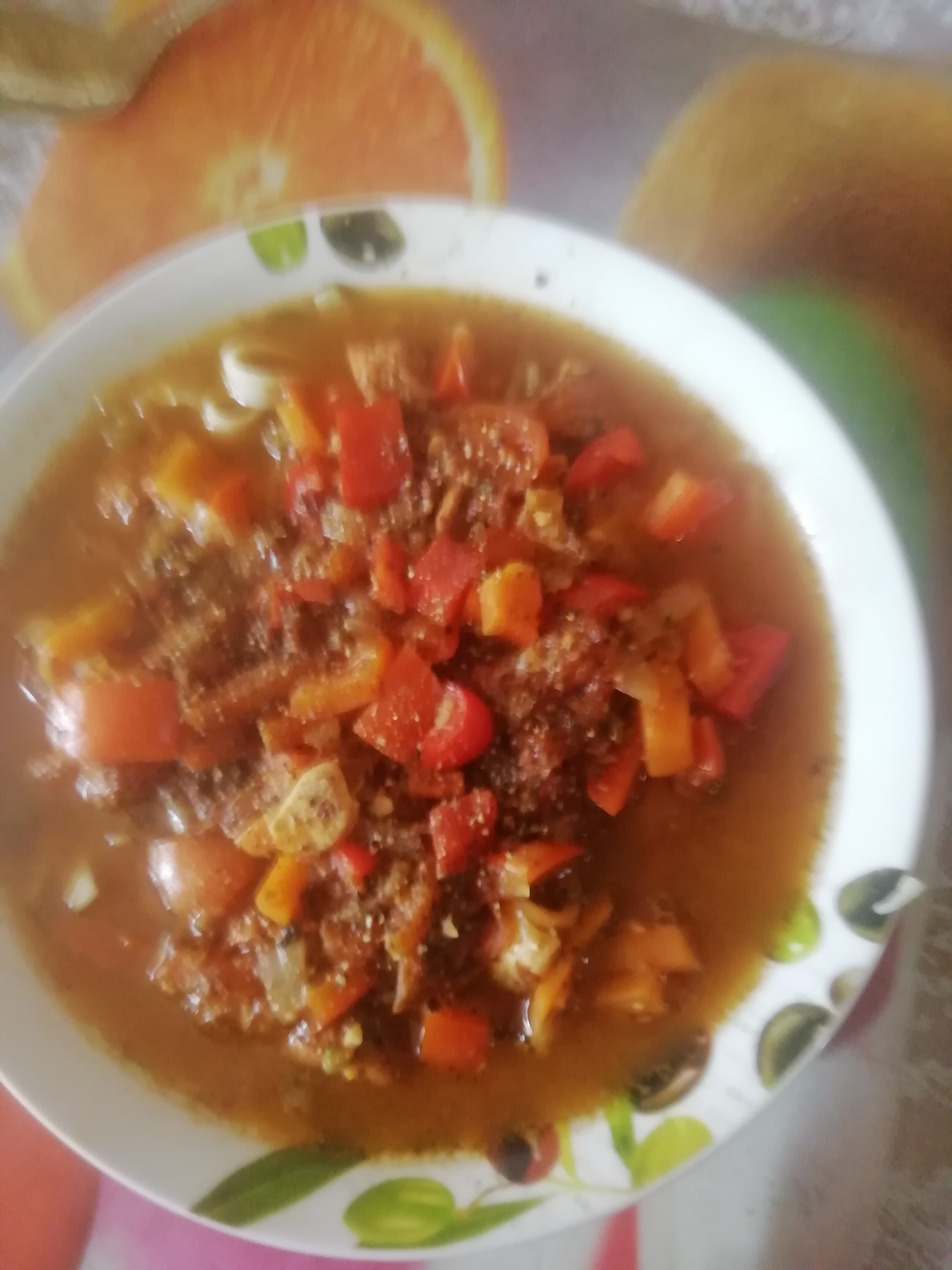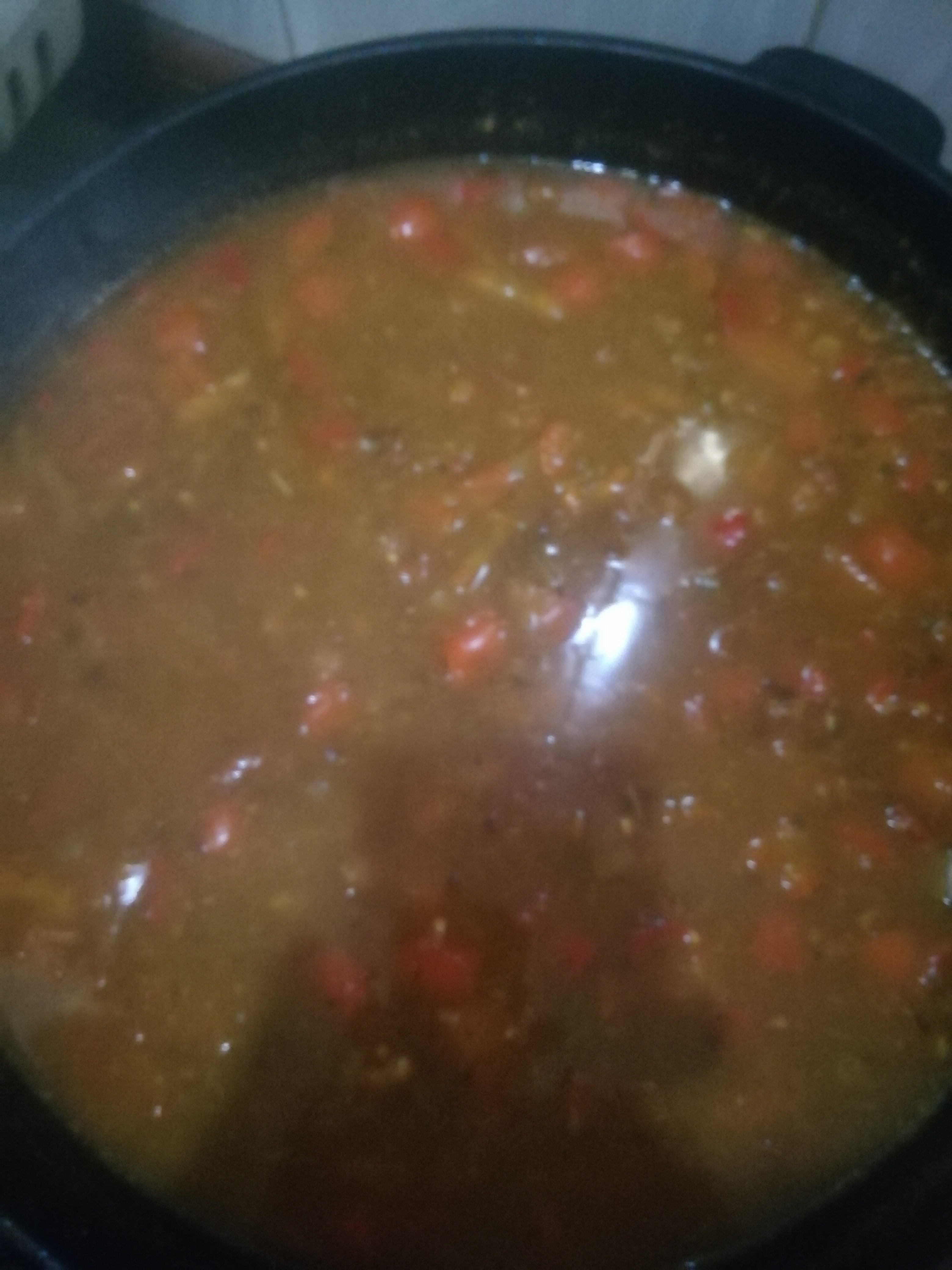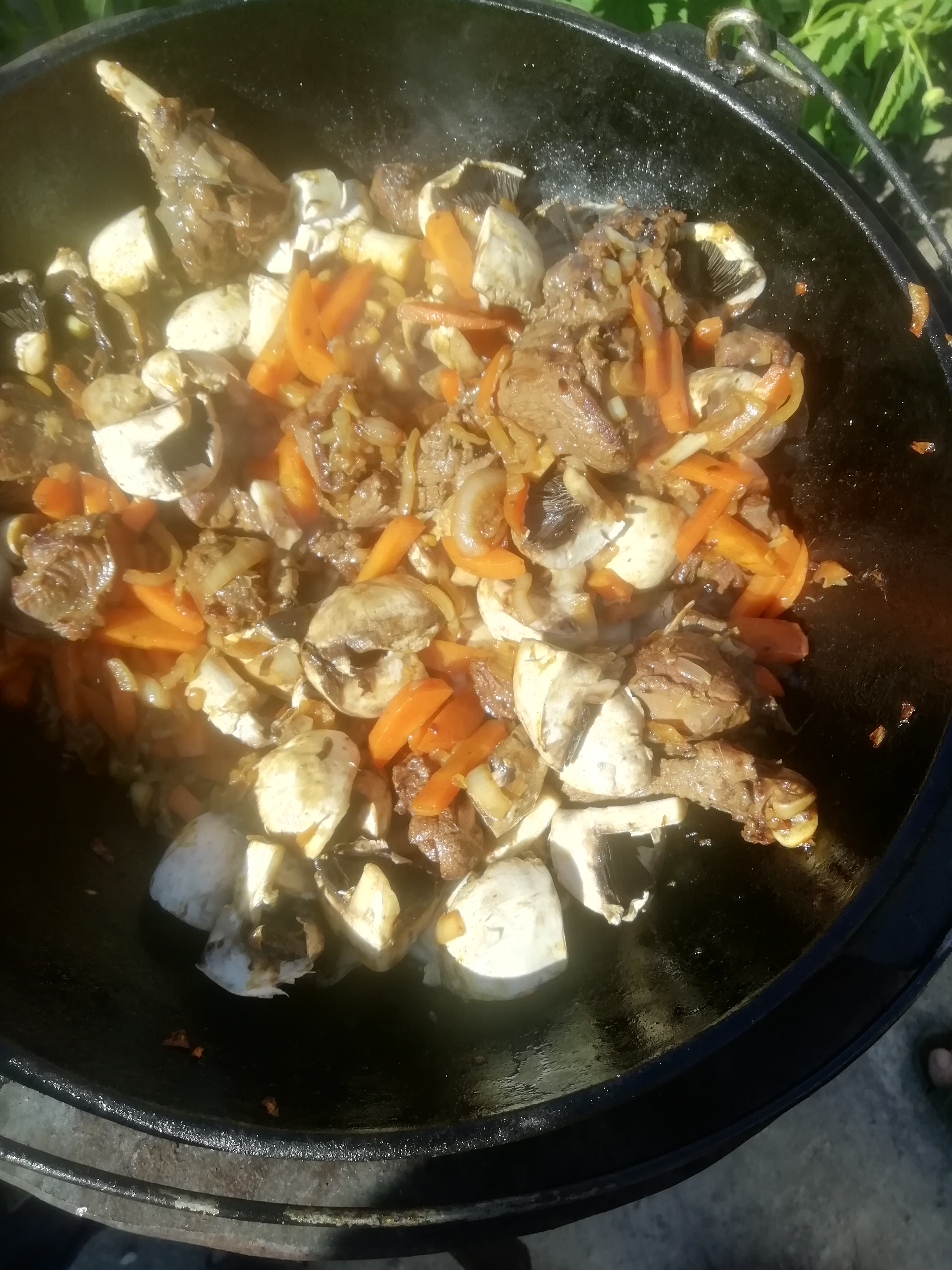 Мясо в масле обжаривал в казане, убрал в кастрюлю, потом кортошку молодую не чищенную в этом же масле до полуготовности, сверху обжаренне мясо, лук, перец, и под крышкой до готовности.