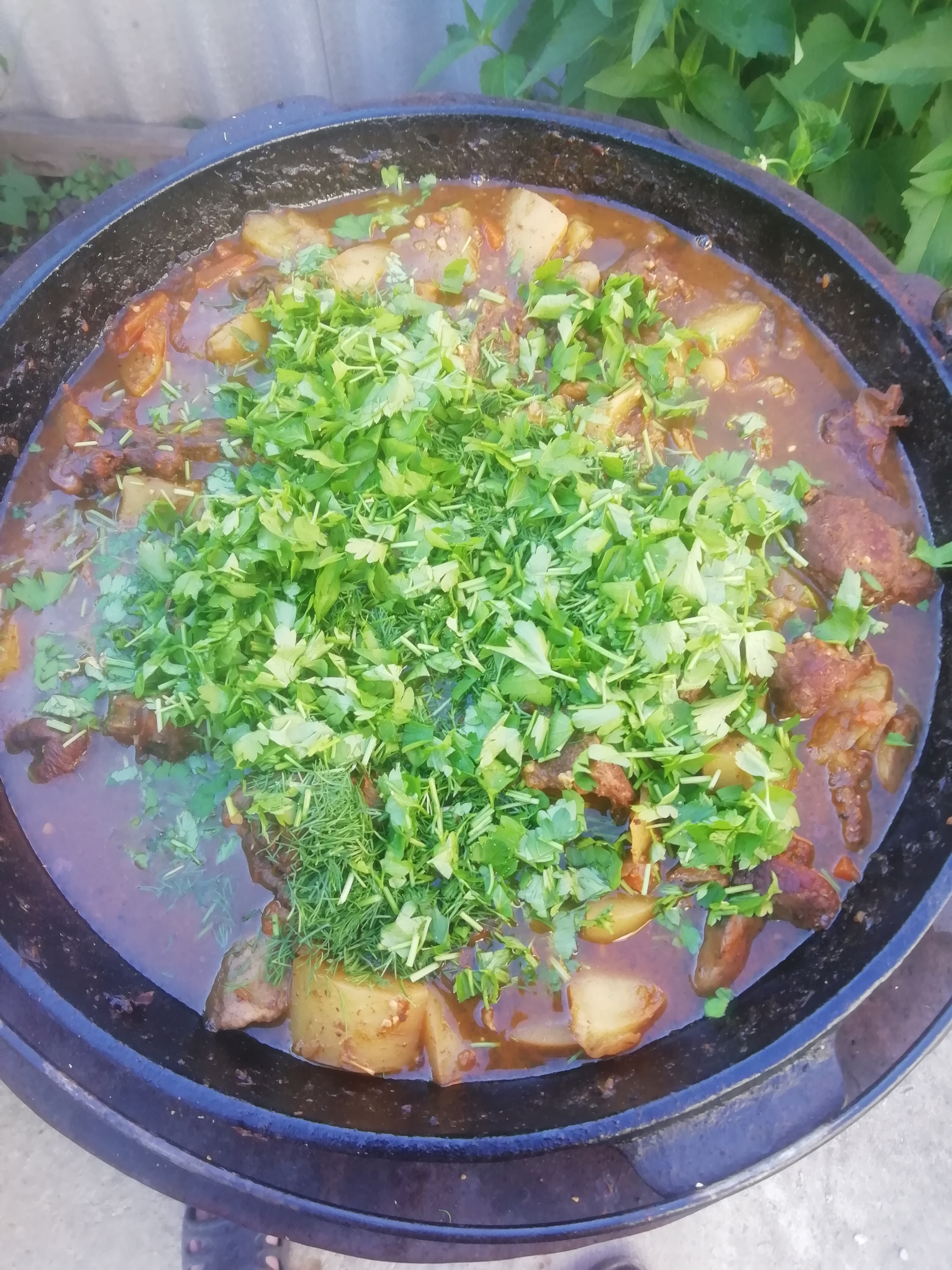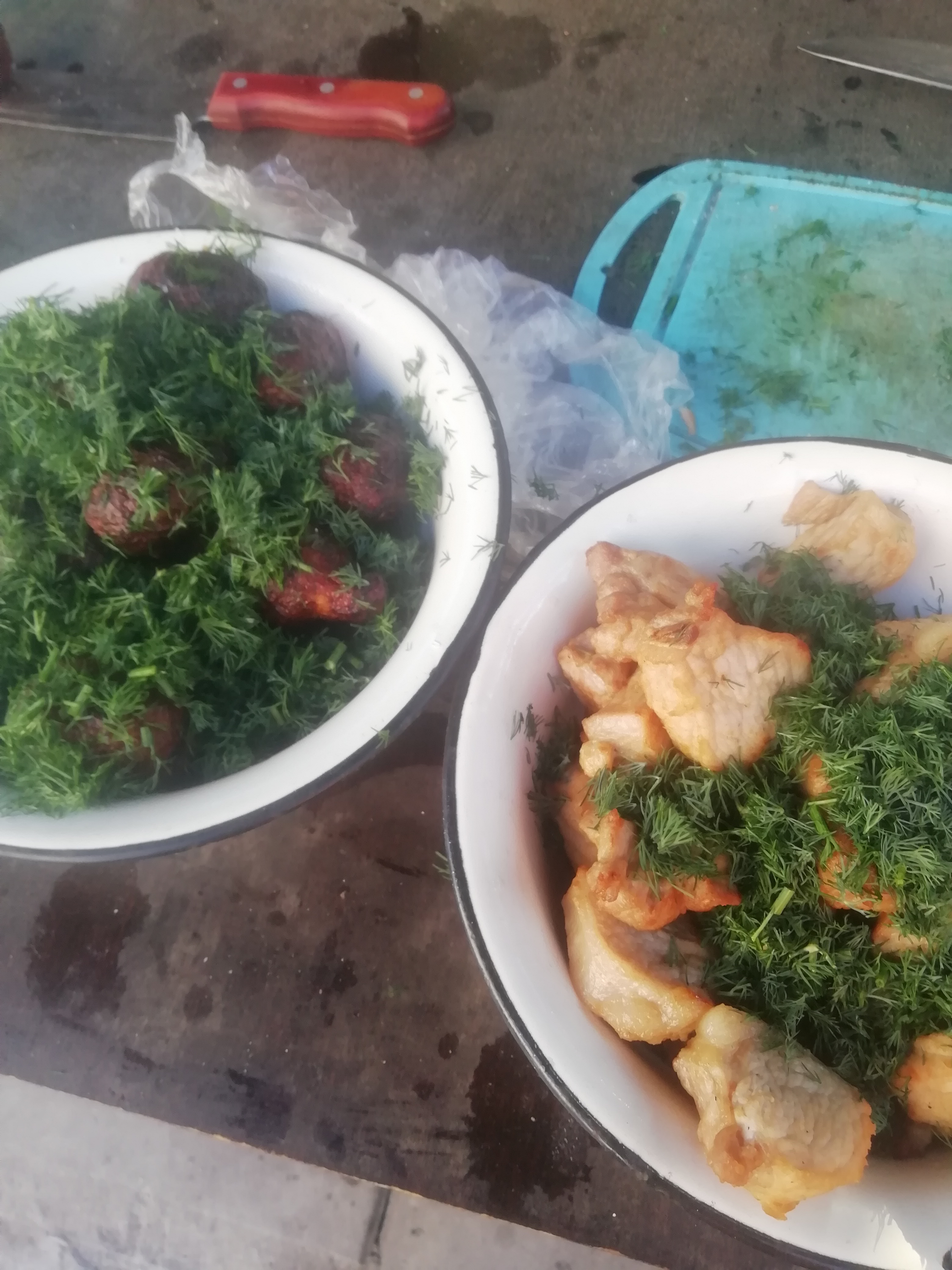 Наверно завтра в баню сделаю по простому , картошку молодую , в казане обжарю целиком , потом так же мясо ...и зеленью посыплю , и .....так и сделаю ...
