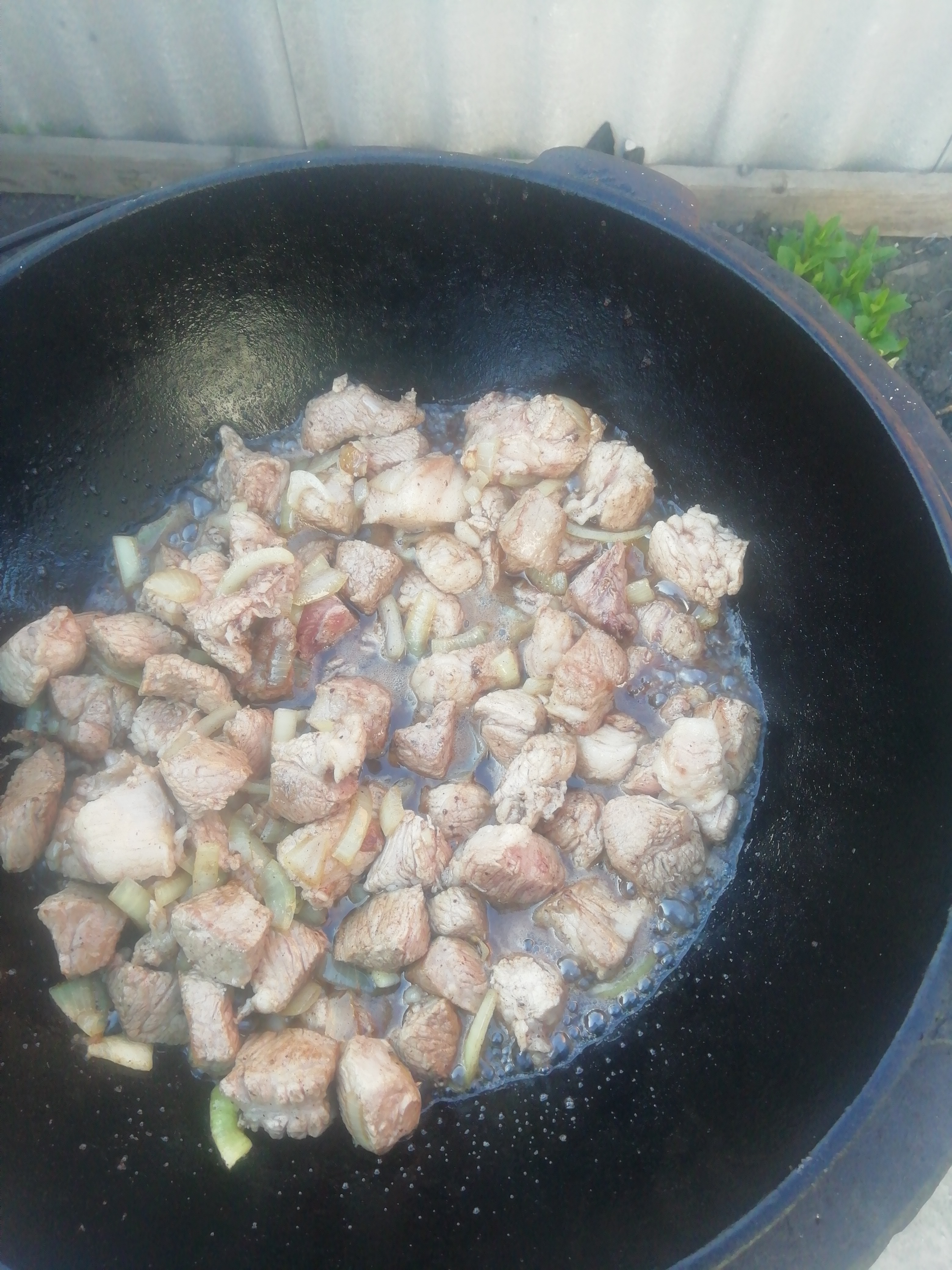 Доливаем подсолнечное масло , и обжариваем мясные ребра , добавляем лук , и все до готовности , потом возвращаем туда картошку , и всё томится без огня , чисто от жара казана ....