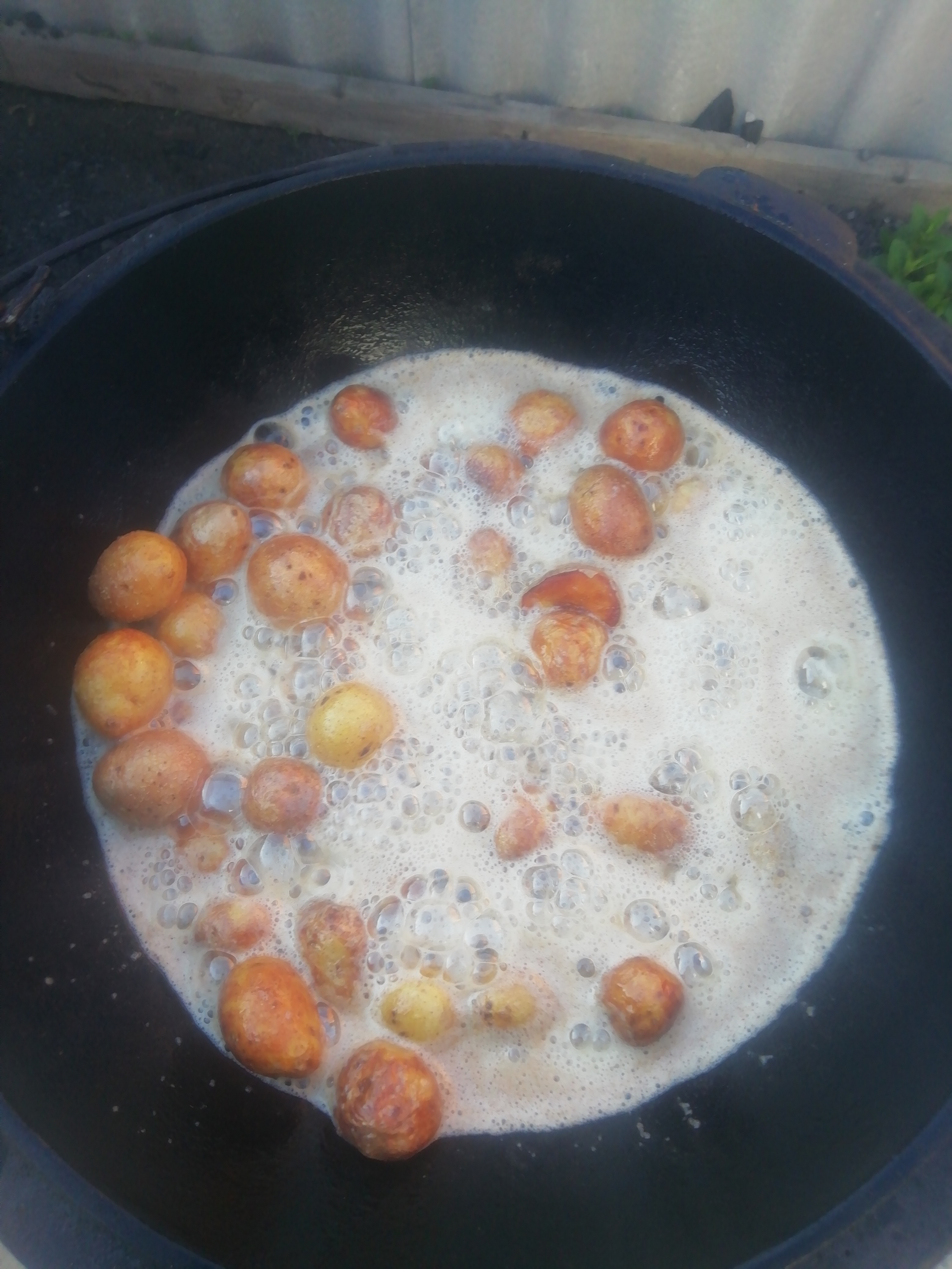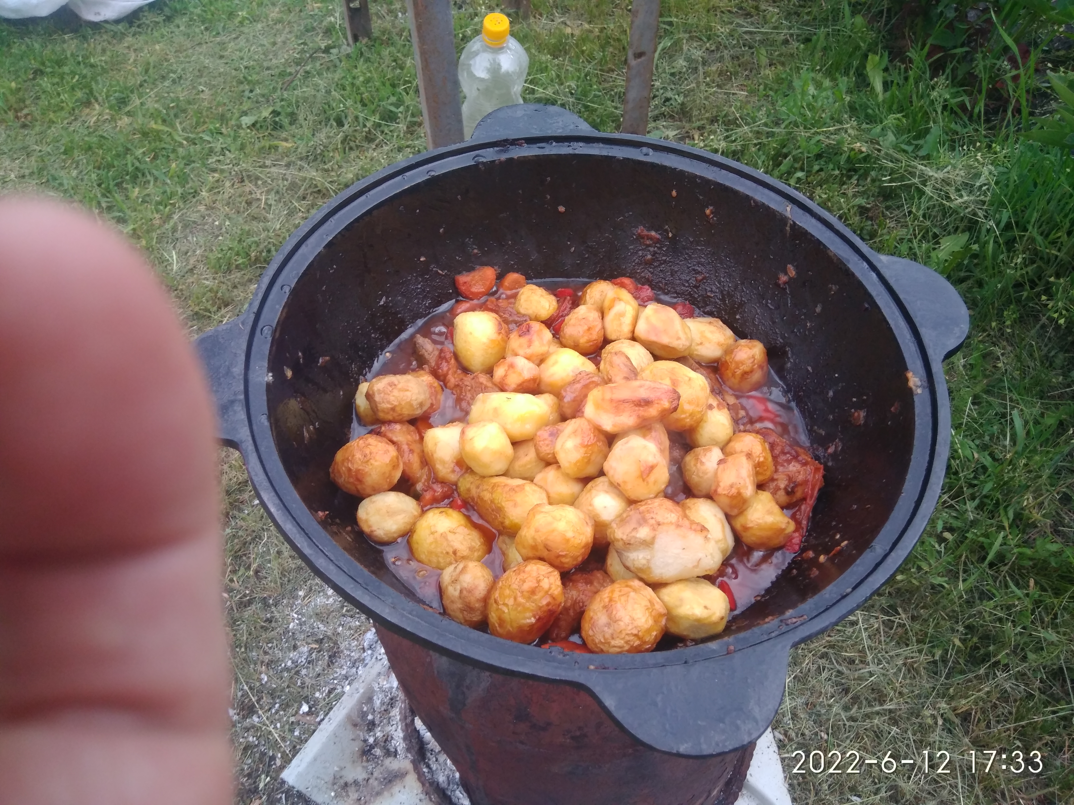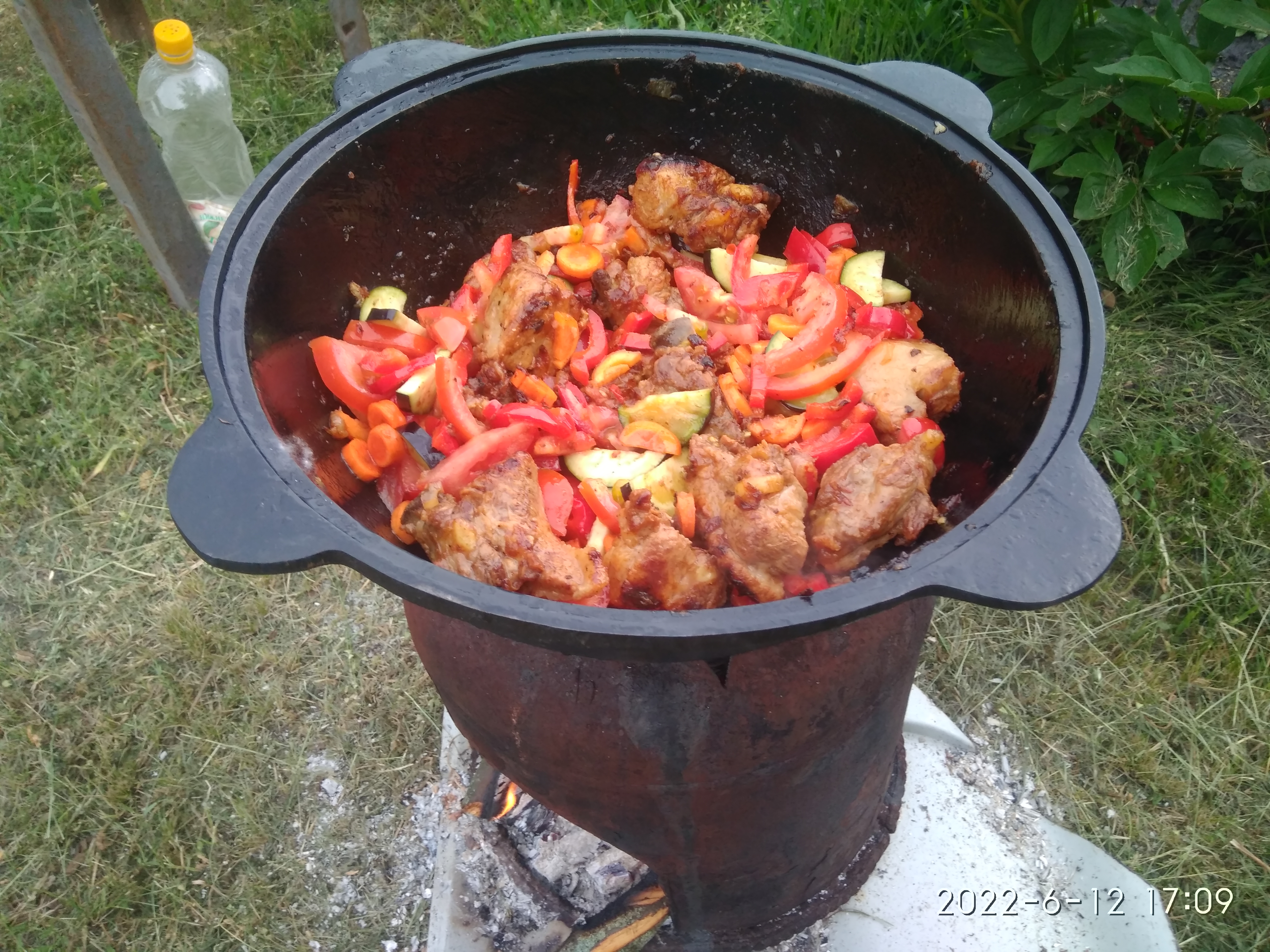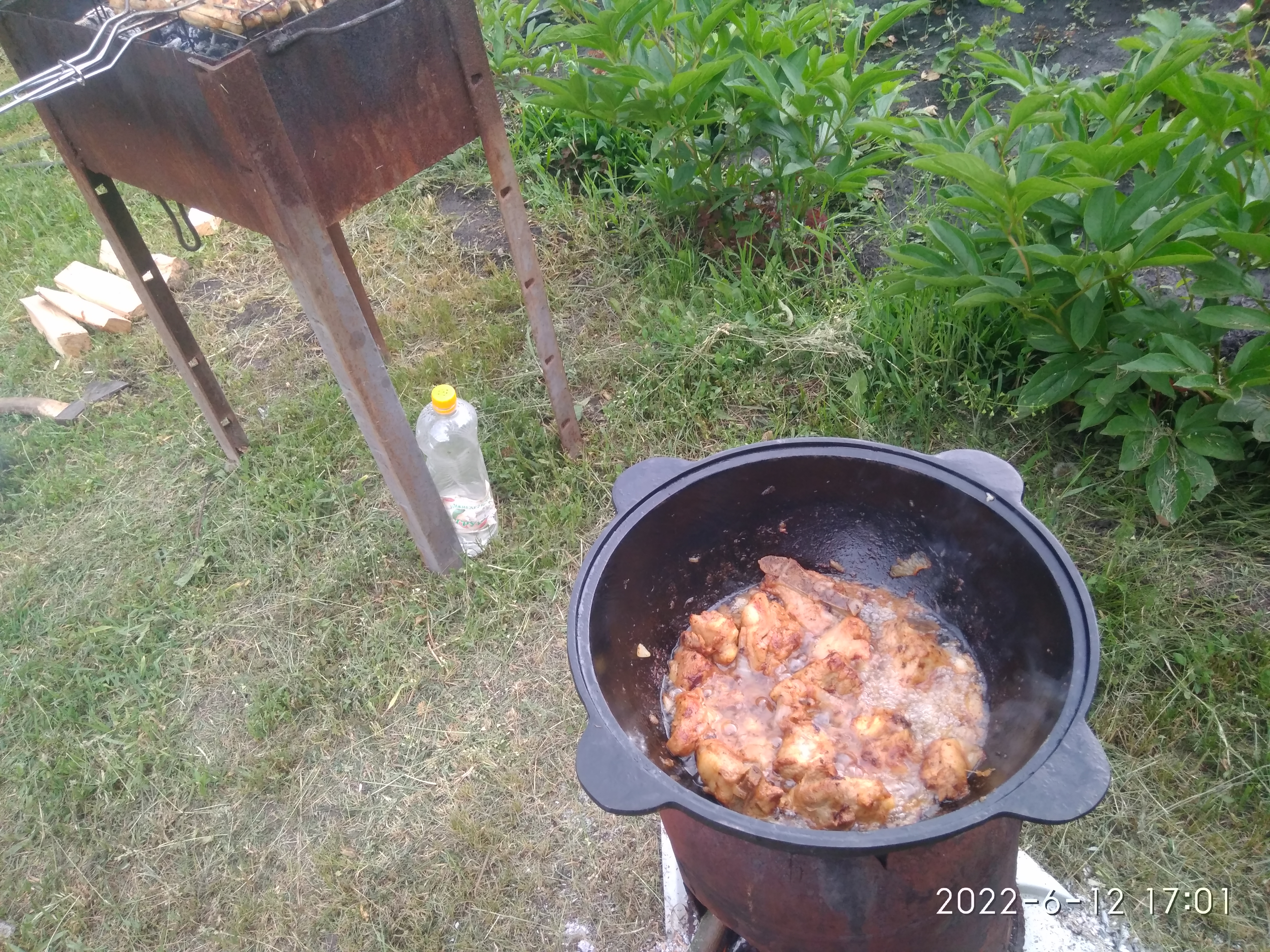 Сегодня кучу вкуснях готовили на огне. Рыбу жарили в казане в масле, овощи на мангале.... На последок оставалось пожарить куриный и свиной шашлык. Решили кинуть по кусочку свинины и курятины в казан после жарки рыбы. Курятина (бедро с костью) не впечатлило, очень долго прожаривалось, на решетке все же быстрее как минимум.