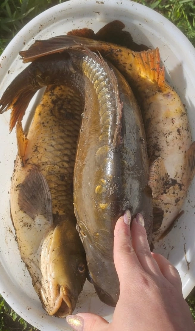 Всем привет! Сегодня в компании двух товарищей побывал на этом прудике. Приехали с самым рассветом. Водоём встретил двумя кошками с дружелюбными намерениями, одной собакой с не очень дружелюбными намерениями (бодро гавкала из дома) и охранником безо всяких намерений и эмоций. Оплатили по 200 рублей. Спросили - на какой пруд идти? На маленький или большой? Охранник направил на маленький, на большом говорит: "верховка не даст ловить". Затевать научную дискуссию и выяснять, кто такая верховка - не стали, и дружно потопали на маленький прудик, благо топать предстояло всего метров 50. На пруду уже сидело 3 человека, но пока без признаков клёва. Из опроса присутствующих, уже здесь не в первый раз, рыбаков, удалось выяснить, что рыболовная фортуна одаривает любителей подлёдного лова не слишком густо, карасик с ладонь и мелкий карпик. Но так, как ладони у всех разные, твёрдо настроили себя на крупняк (что уже половина дела)! Забуриваем несколько лунок недалеко от бережка, прикармливаем зимней прикормкой Дунаев Лещ, расставляем удочки и начинаем ждать. Я расчехлил 2 свои ходовые удочки с леской 0,08 и тульскими мормышками 3,0 (более тяжёлая артиллерия лежала наготове в машине). Саня развернул поплавочку и ещё одну с крючком и мормышкой. Серёга, как самый опытный, ничего разворачивать не стал, а решил выждать и ограничиться дельными советами. Спустя непродолжительное время кивки начали подёргиваться, но выловить хулигана оказалось не так просто. Но всё таки первый небольшой карасик оказался на льду.