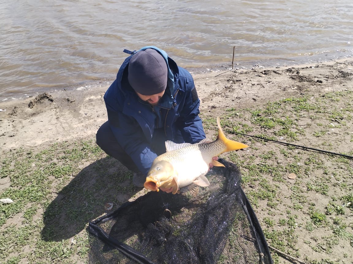 После часа, проведённого на одном месте, и угасшего клёва, решили немного разбрестись по водоёму. Я двинул в самый конец, к переливным трубам, Саня пошёл к скучившимся в одном месте рыбакам, ну а Серёга двинул на самый центр. Придя в конец пруда обнаружил, что лёд здесь уже не такой толстый, вверху 5 см каши из мокрого снега и под ней всего 5 см нормального льда, так что уж совсем близко в мегаперспективным кустам в воде приближаться не стал. Забурился в 3 метрах от берега, на глубине около 2-2,5 м. Ряд лунок, в каждую по горсти прикормки. На первой лунке подряд попадаются 5-6 карасиков, потом только холостые поклёвки. Перемещаюсь дальше. Тишина. Ещё одна лунка. Один карась. Новая точка. Опять глухо. Подтянулись мои компаньоны, у них на новых местах дела не очень, опять же в основном "подергунчики". Время 12. Провал в клёве - на лицо. Уже совсем без настроения бурю новую лунку, всыпаю остатки прикормки и начинаю всё с начала. Ну и постепенно дела пошли на лад. А может быть карась просто решил зашевелиться. Робкие, по началу, поклёвки сменились уверенными "хватами" рыбы. Размерчик правда весьма скромный, что у карася, что у карпа (один вообще какой-то чёрный попался).
