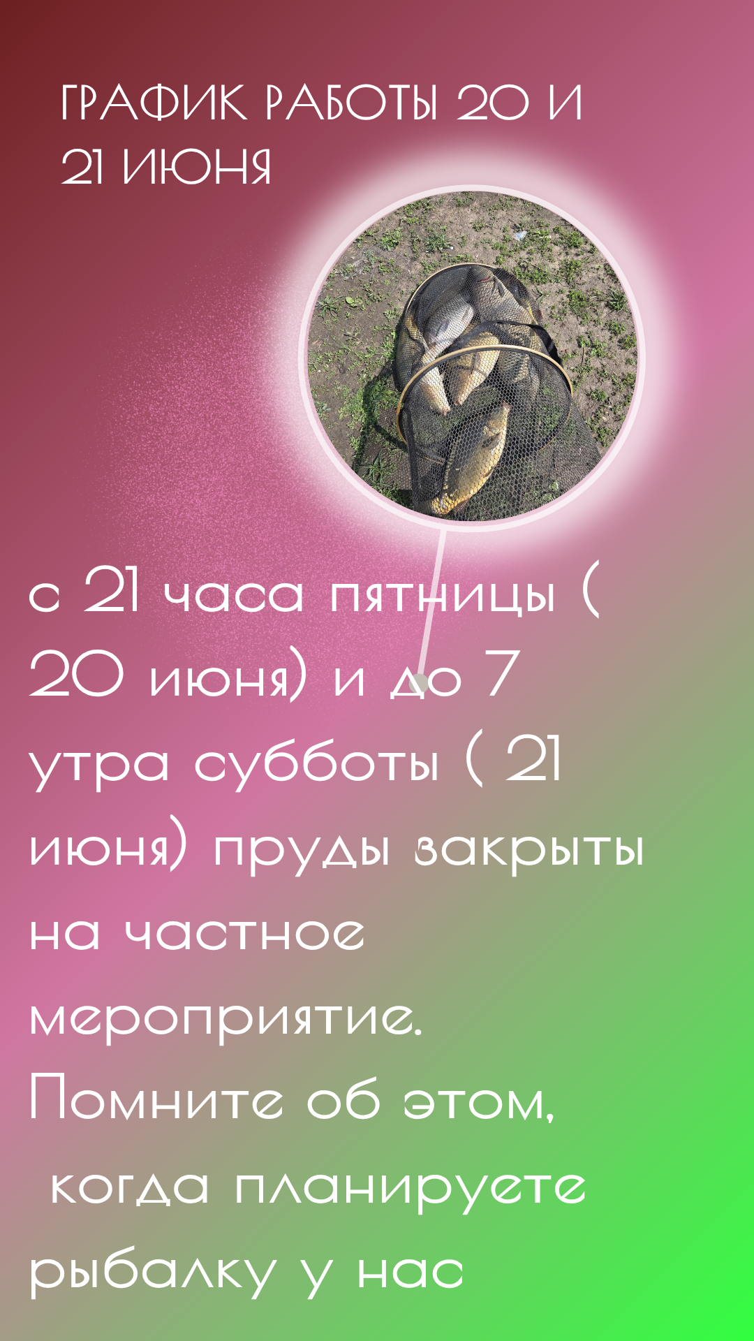 Если вы планируете приезжать на рыбалку в пятницу, помните , что в 21 час мы попросим вас освободить территорию пруда. И в субботу ждём вас на рыбалку с 7 утра .