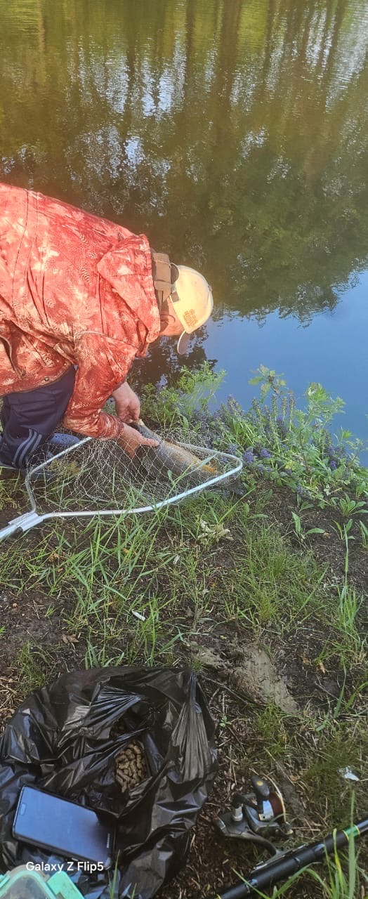 Доброе утро! Это вчера ловил наш постоянный рыбак- спортсмен на третьем, маленьком пруду. Напомню, что у нас каскад из трех прудов: первый, самый дальний, второй, рядом со зданием администрации и третий, маленький, мы его между собой называем «в дубах». Рыбу ловить можно на любом из них. Плотность рыбы на всех прудах большая .