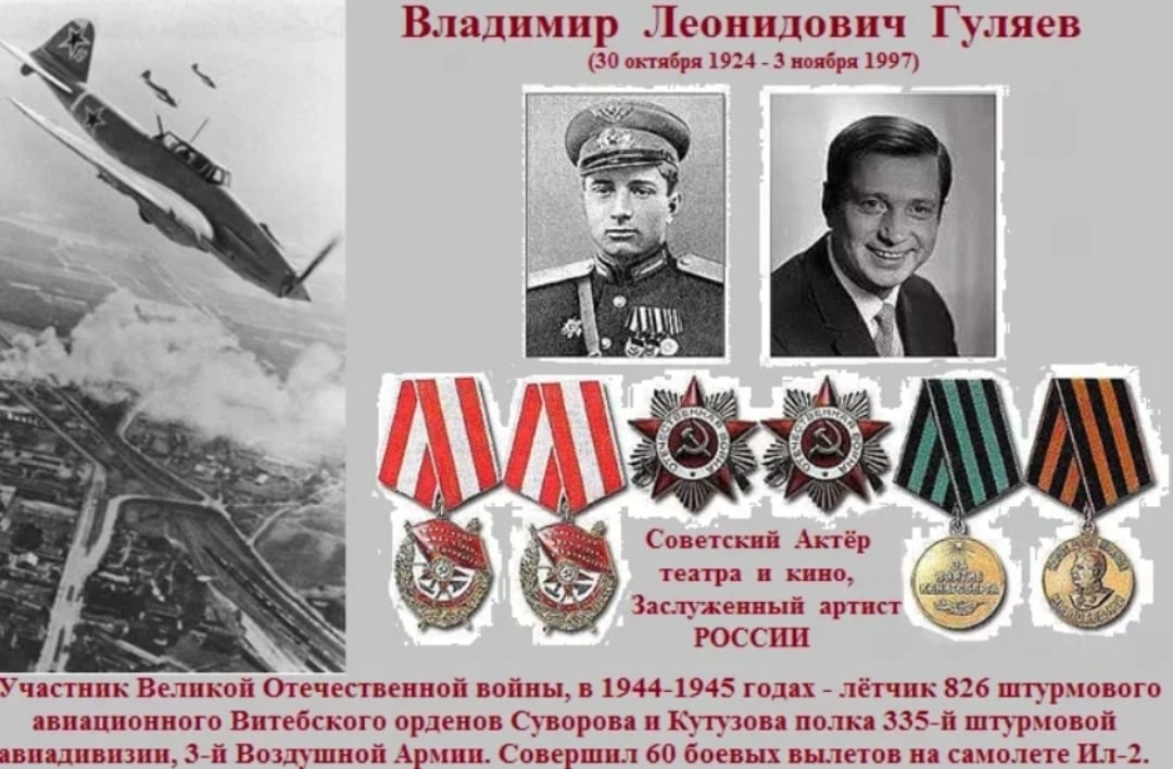 Главных ролей ему не предлагали – типаж был «негероическим», а вот за кадром он был настоящим героем, ведь, прежде чем стать актером, Владимир Гуляев прошел войну, был летчиком-штурмовиком, совершал ежедневно по несколько боевых вылетов, а во ВГИК пришел только после того, как понял, что больше не сможет летать – его комиссовали из-за многочисленных ранений.