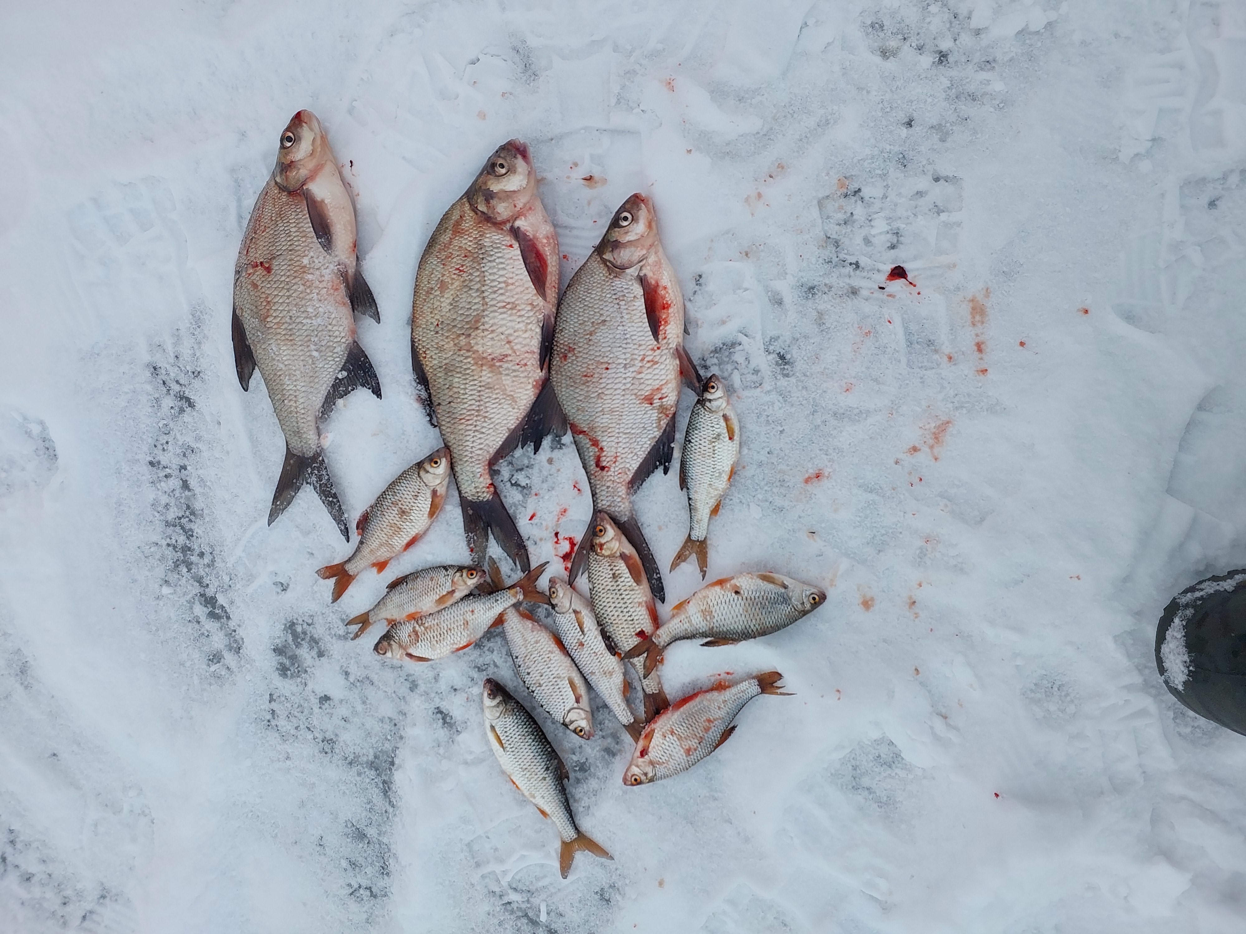 Сегодня половил с 9 00 до 13 00. 6 шт плотвы , 2 на стоячку и 4 шт на игру у дна на уралку. Плотва грамм 150-200.Передо мной ночники в палатке три десятка плотвы, подлещ с вечера на их точку подошёл, но не клевал, просто стоял, кормили они мелким мотылем.. У соседа ближе к плотине( он сел чуть раньше меня) пара подлещиков , один грамм на 500, второй ближе к кг и два десятка плотвы, он тоже ловил в палатке, кормил черной сыпухой без мотыля. Без палатки очень не комфортно, мороз, позёмка, лунки минут за пять присыпает и прихватывает, руки колеют на ветру. Лед 10-12 см.Как то так.