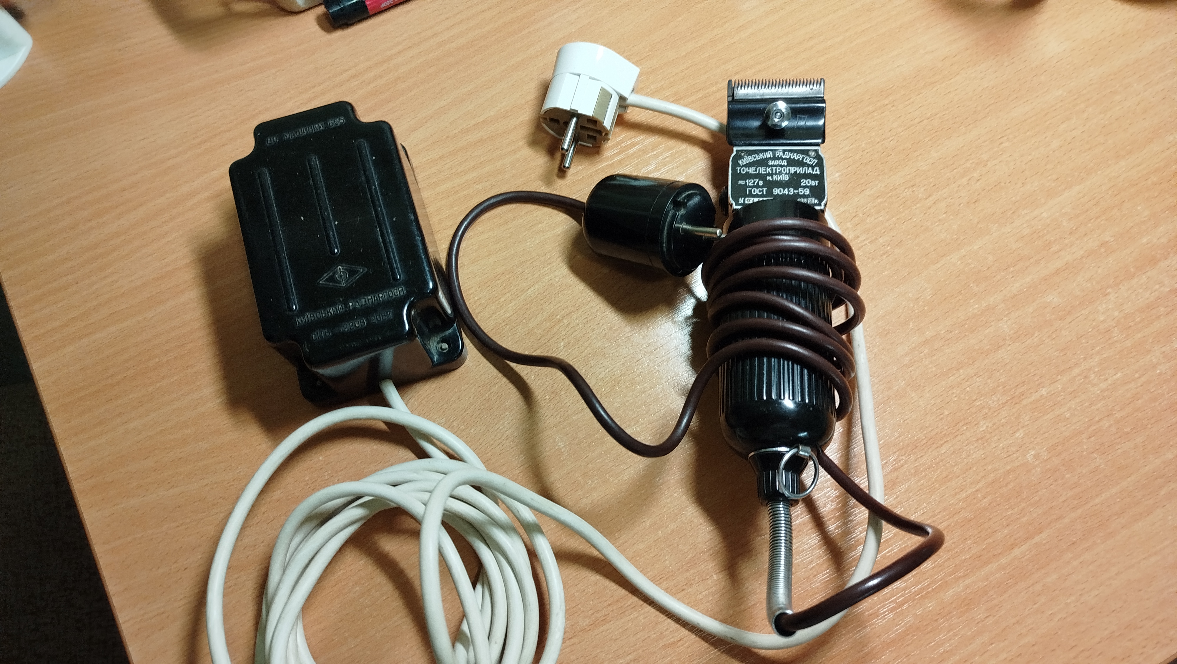 У жены бабушка была парикмахером. На пенсии своих сама подстригала. Нам досталась по наследству. Всë работает. Год выпуска 1961. Тогда ещё с заводским номером выпускалась такая мелочëвка. Рядом лежит трансформатор 220/127. Выполнен на одной катушке с отводом на 127 В. Я такую схему в юности изучал когда профессию электрика получал. Но в жизни такую схему встретил только на этом трансформаторе.