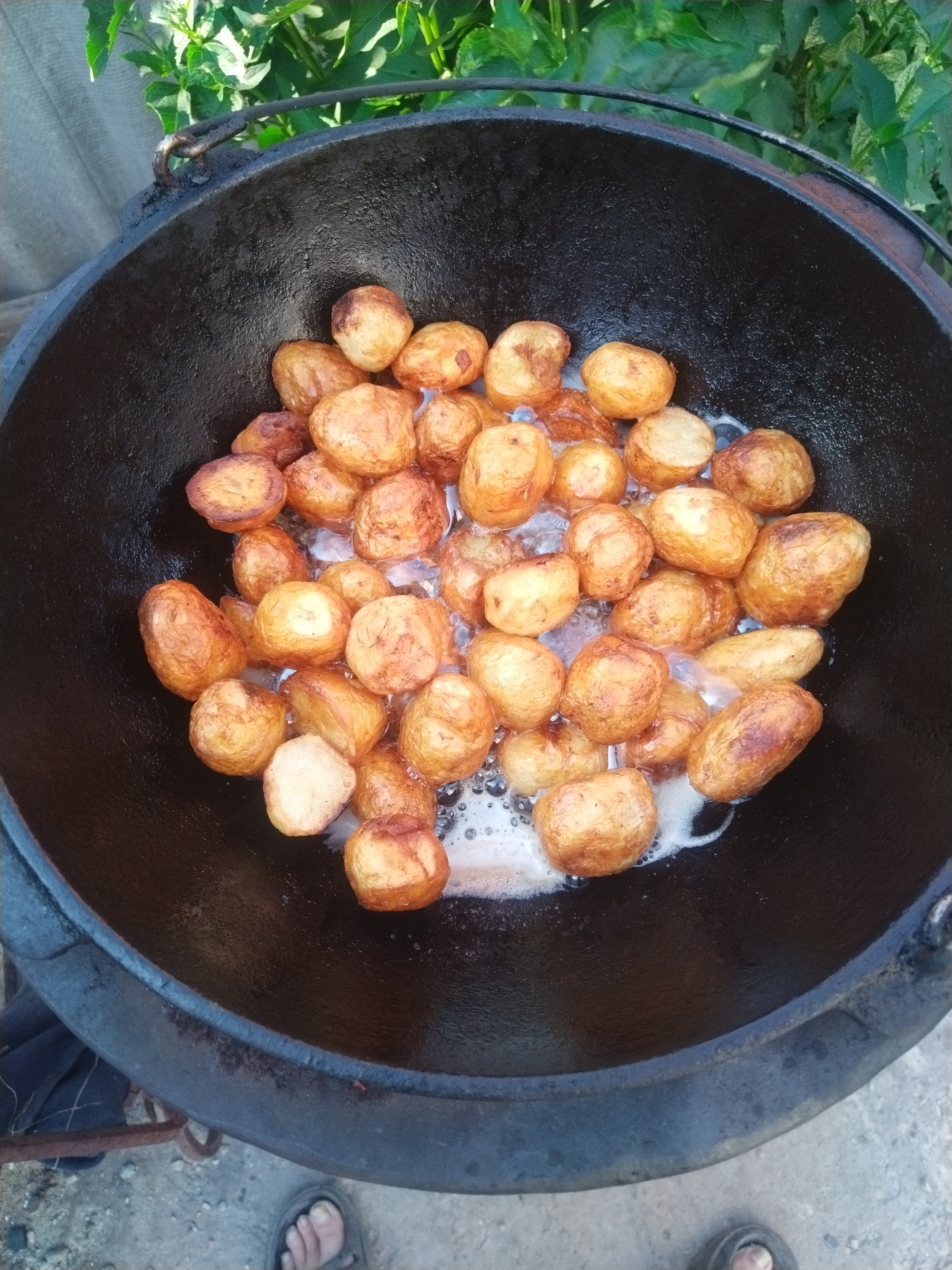 А разве картоха не должна готовиться вместе с мясом? вроде ее закладывают на середине готовности мяса и далее она пропитывается маясным соком/духом...