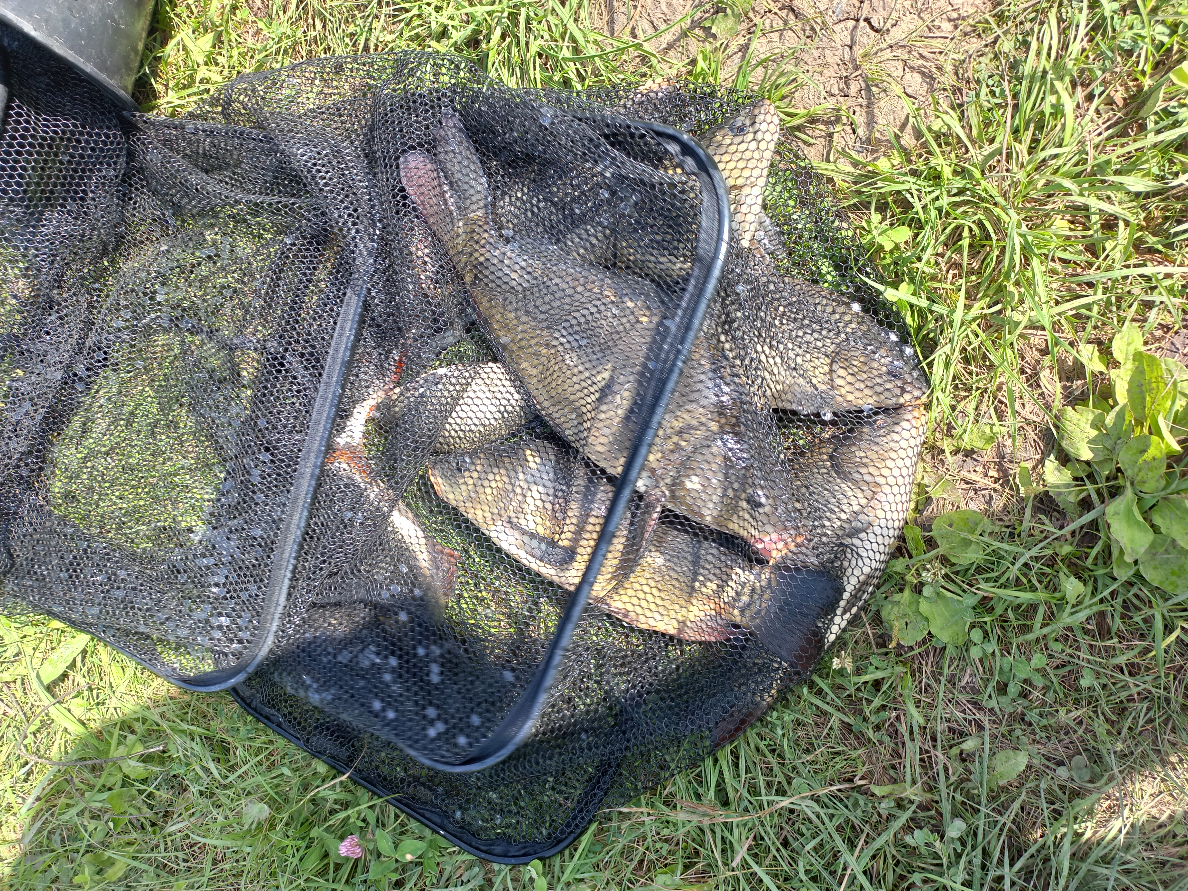 Удивило то, что открытие было всего месяц назад, а берег утоптан прилично и попадается довольно крупная чешуя на местах ловли. Сам водоём небольшой, в хвосте посредине стоят сухие деревья. Чисто, мусора нет. Теперь что касается рыбалки. Ловили на две поплавочки, насаживали кукурузу, перловку, опарыша. Краснопёрка приличных размеров с ладонь и больше начала клевать на первых забросах. Причём даже на кукурузу с крючком №9 по овнеру и постоянно приходилось пользоваться экстрактором, так как заглатывала глубоко. Видя такую картину прикормкой пользоваться не стал совсем. Через часок подошли и карпята на эту точку. Совсем маленькие, грамм по 200-300. Но радости внука не было предела! Поймал первого в жизни карпа! Горд и счастлив! Причём доставали подсаком, всё как положено.