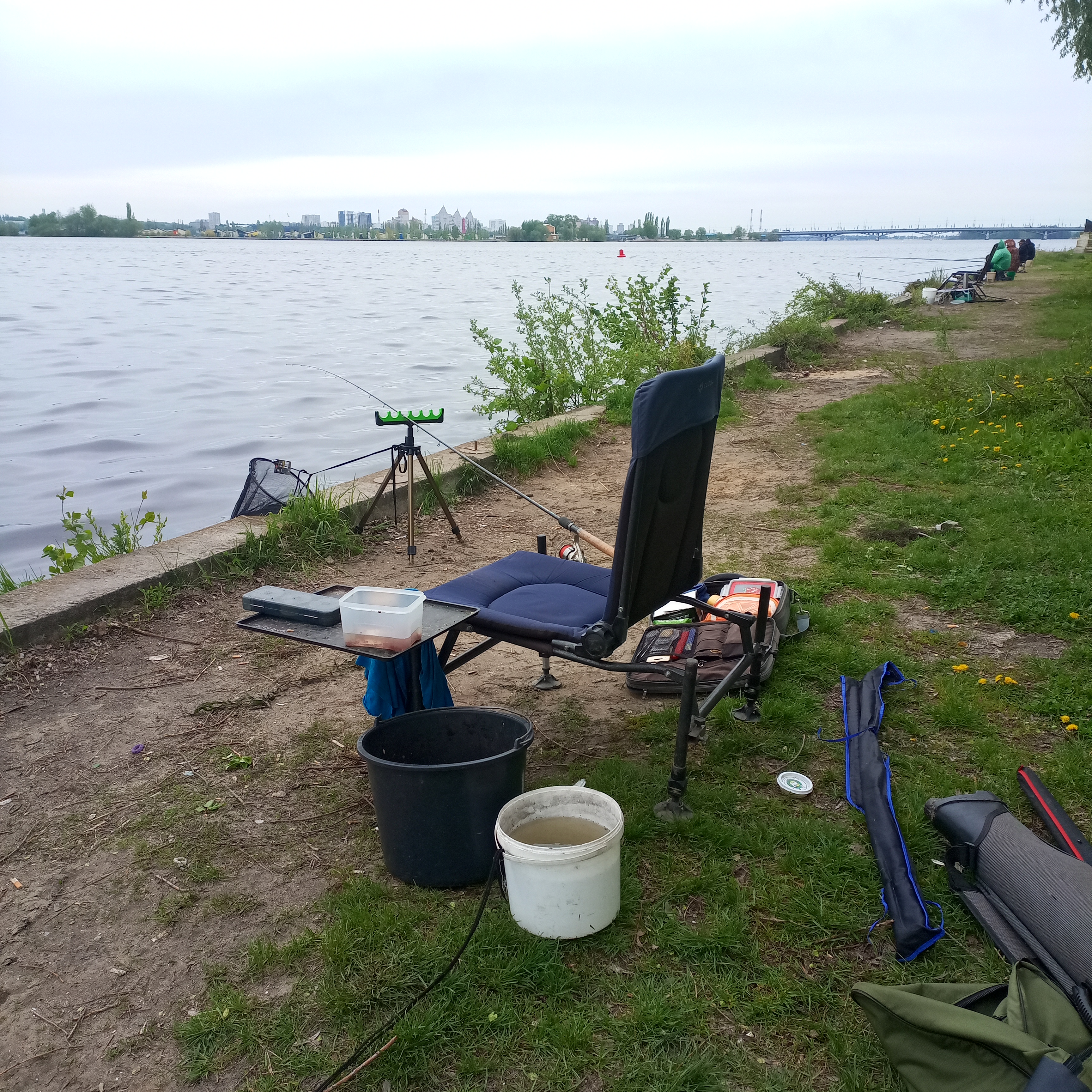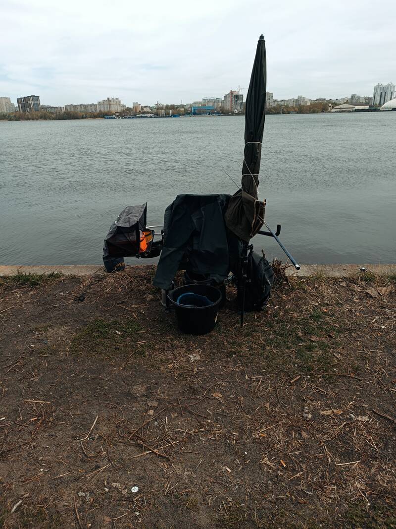Разложил на берегу вещи и приступил к самому главному – выбору точки ловли. На расстоянии 20 метров от берега глубина практически не менялась (около 2-х метров), ну, по крайней мере, как я смог это определить с помощью поплавка. Остановился метрах на 13-15. Слепил шары из прикормки, с расчётом перекидать сразу около 70% всей смеси. В шарах пальцем делал углубления и засыпал в них опарыша и кукурузу. Забросил поплавок и быстро перекидал всё что налепил.