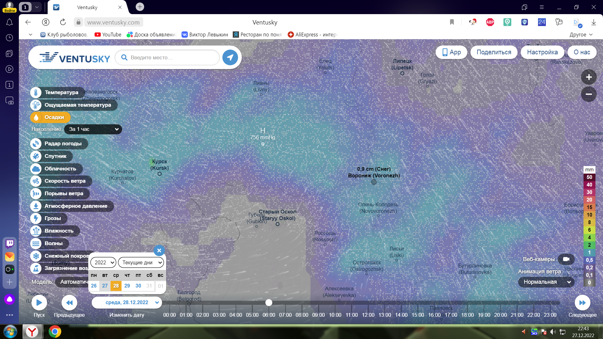 показывают что  снег закончится завтра в 18:00 и какой плотности он будет идти