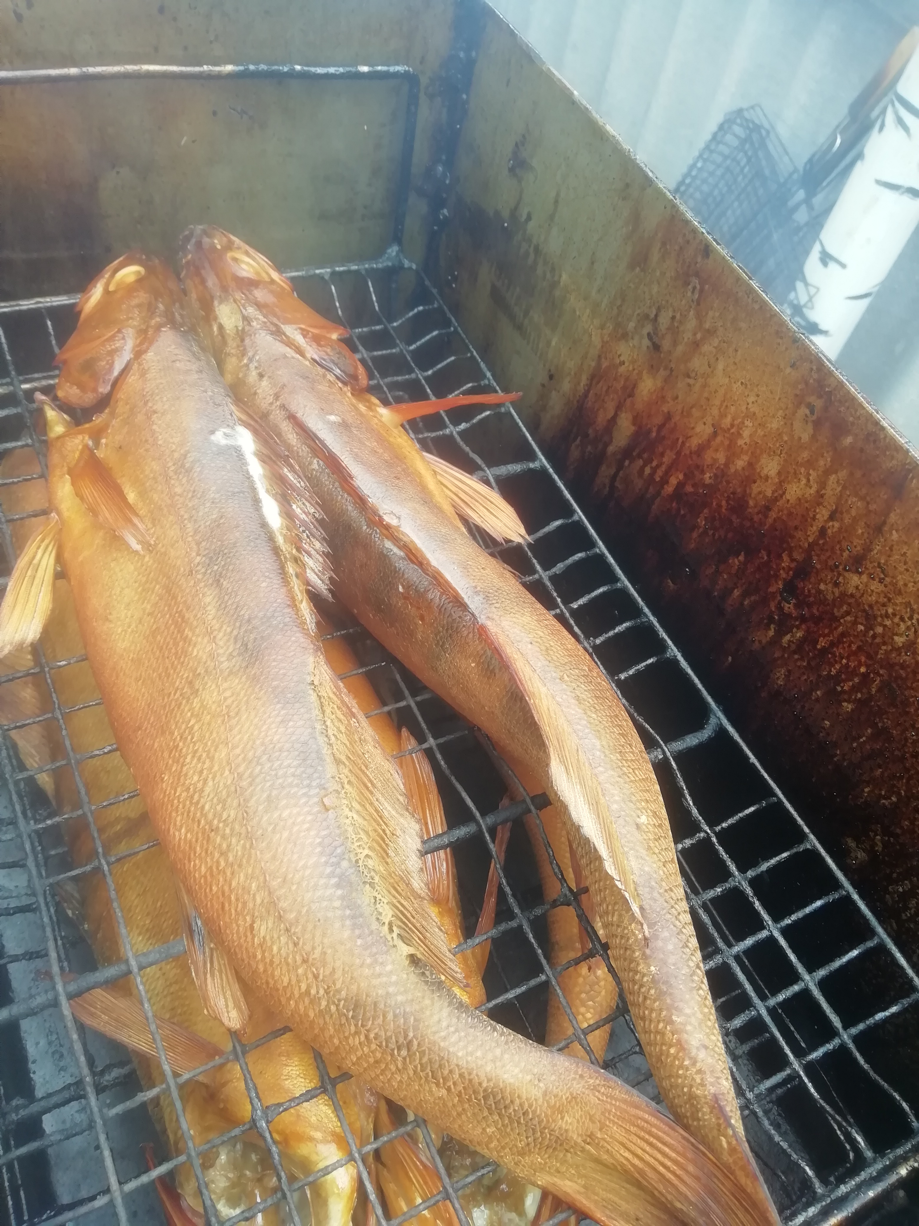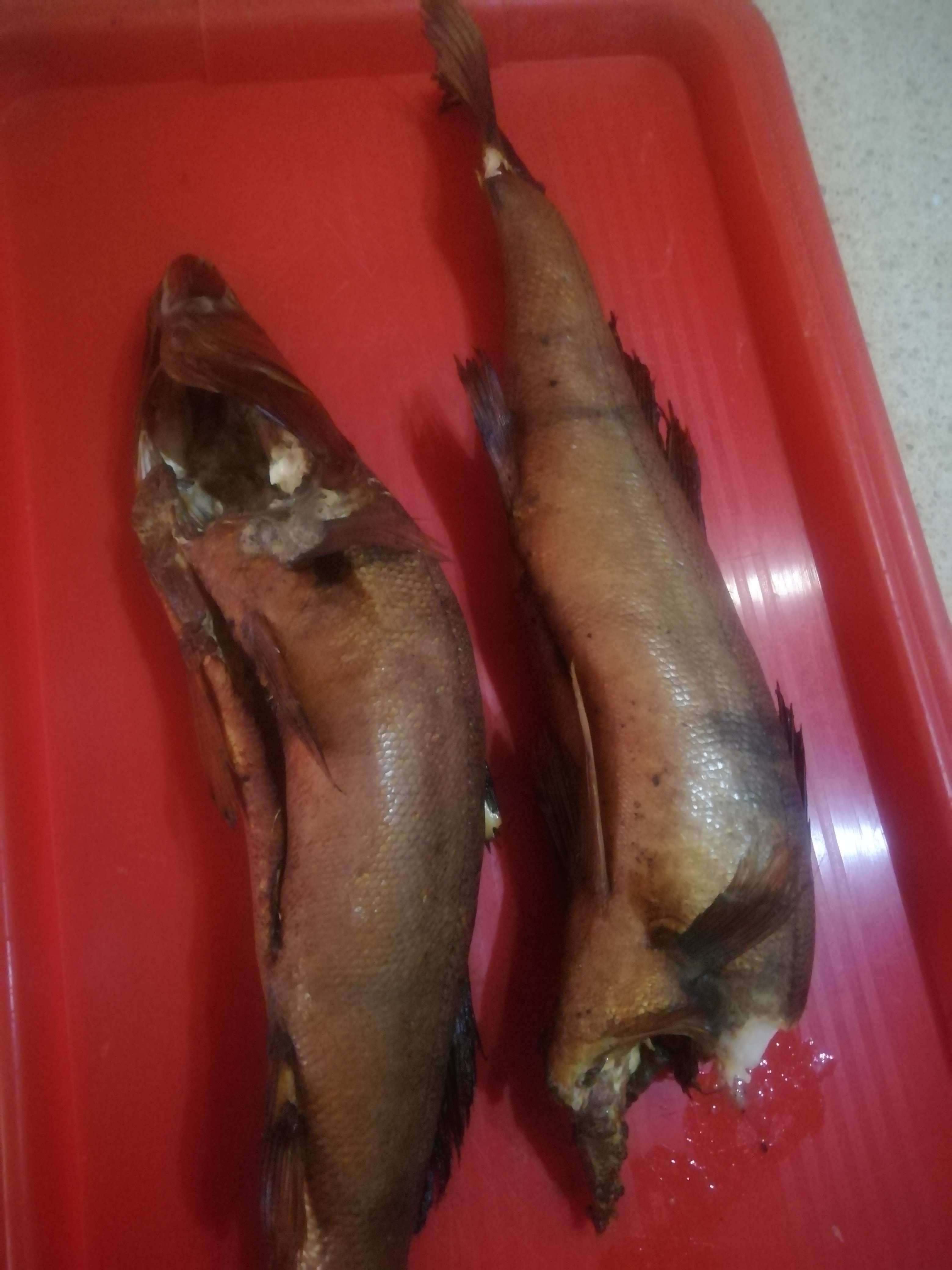Это после коптильни, почему то на дальнем куске темные пятна, в реале нет.