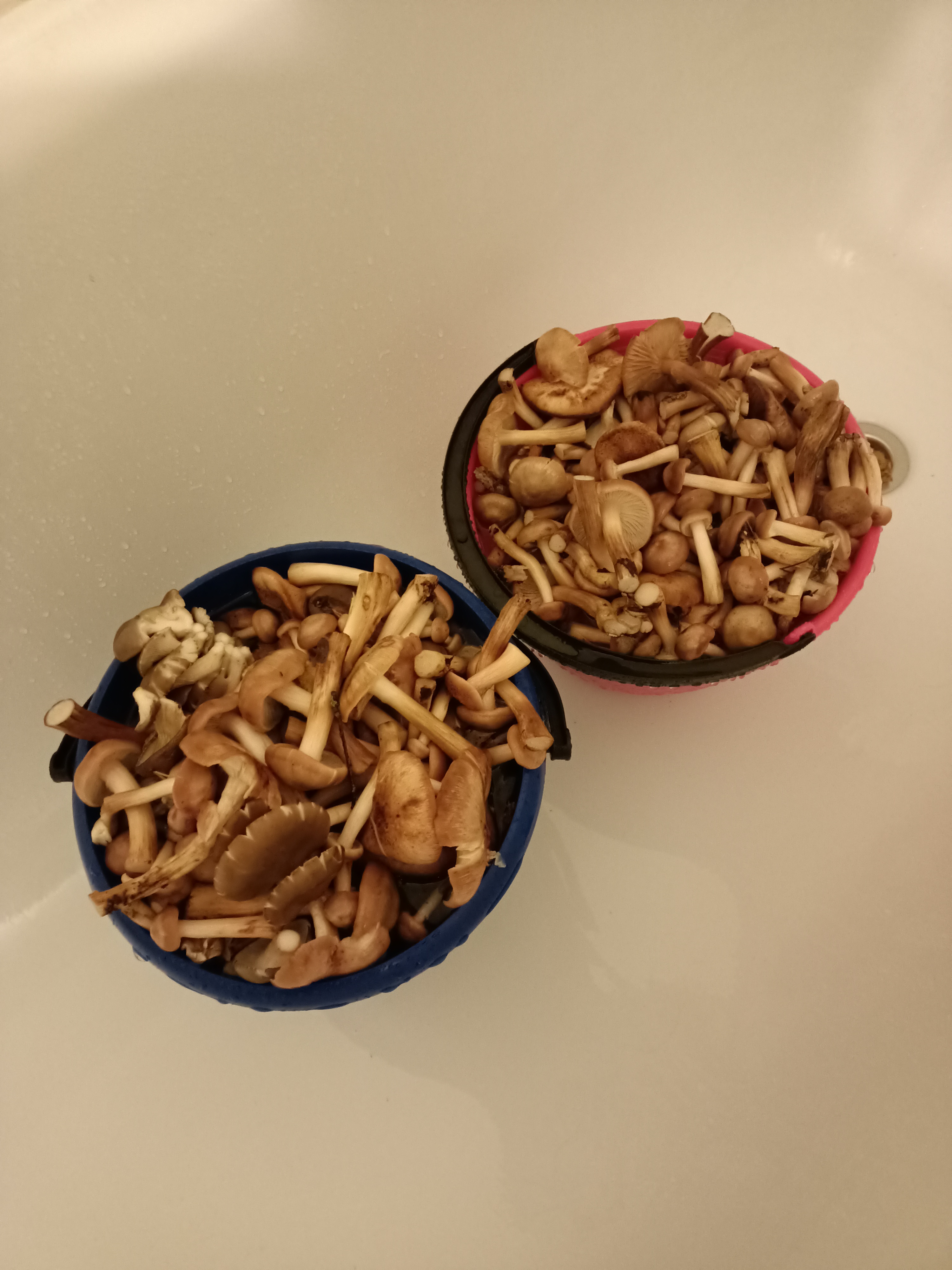 Получив полный облом от Водяного (смотри отчёт Дмитрыча в "Спиннинге"), на обратном пути заехал в знакомый лес проведать Лешего. Бродить начал уже перед закатом и светлого времени было чуть-чуть. Осенние опята, причем как одиночные, так и довольно большим семьями, попадаются локально, но если увидел один-два, то в округе обязательно попадутся ещё несколько. Практически все грибы в листве, под сухой травой. Нарезал с полведра. Деду Лешему спасибо, а Водяной - жадина!
