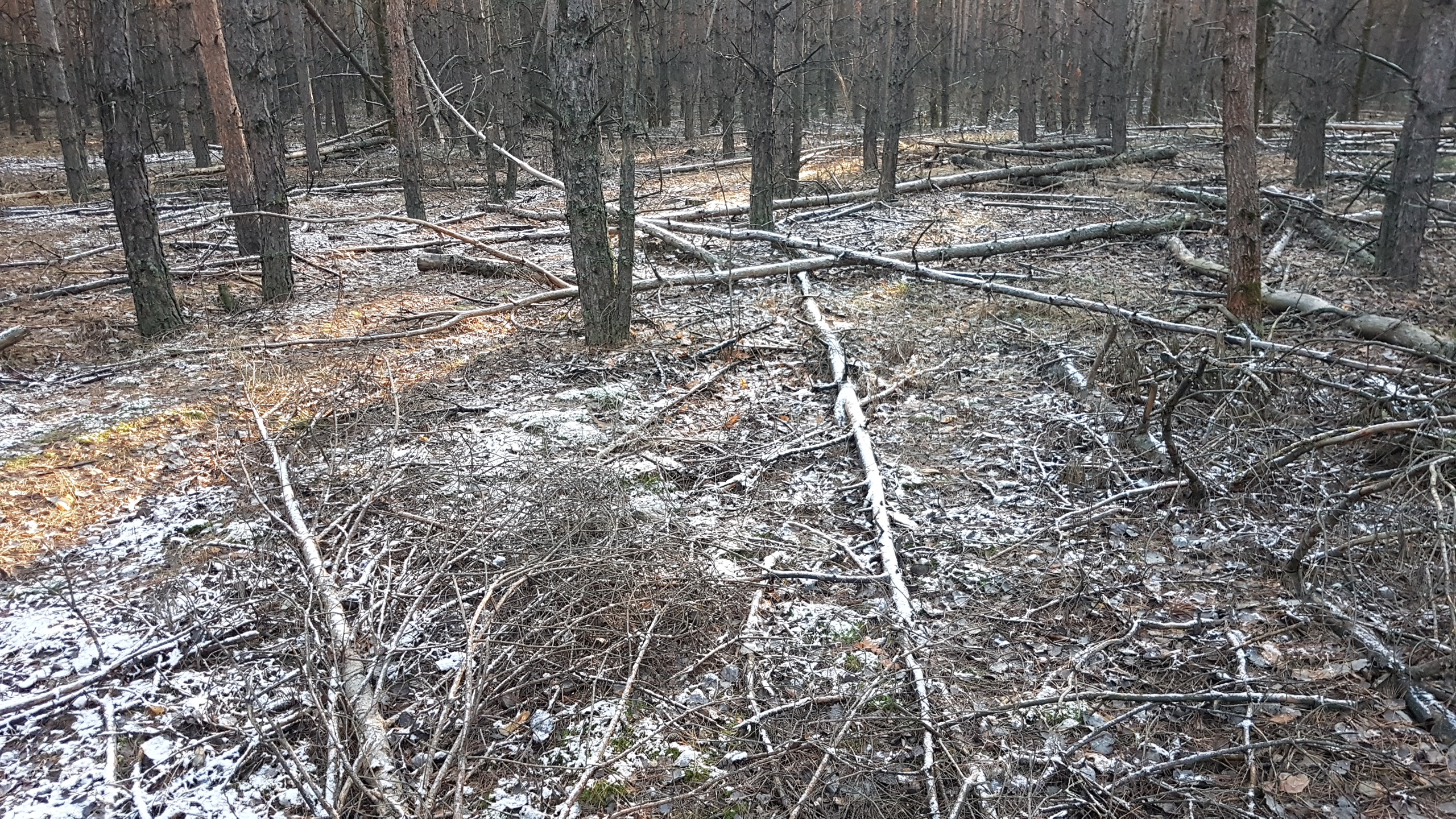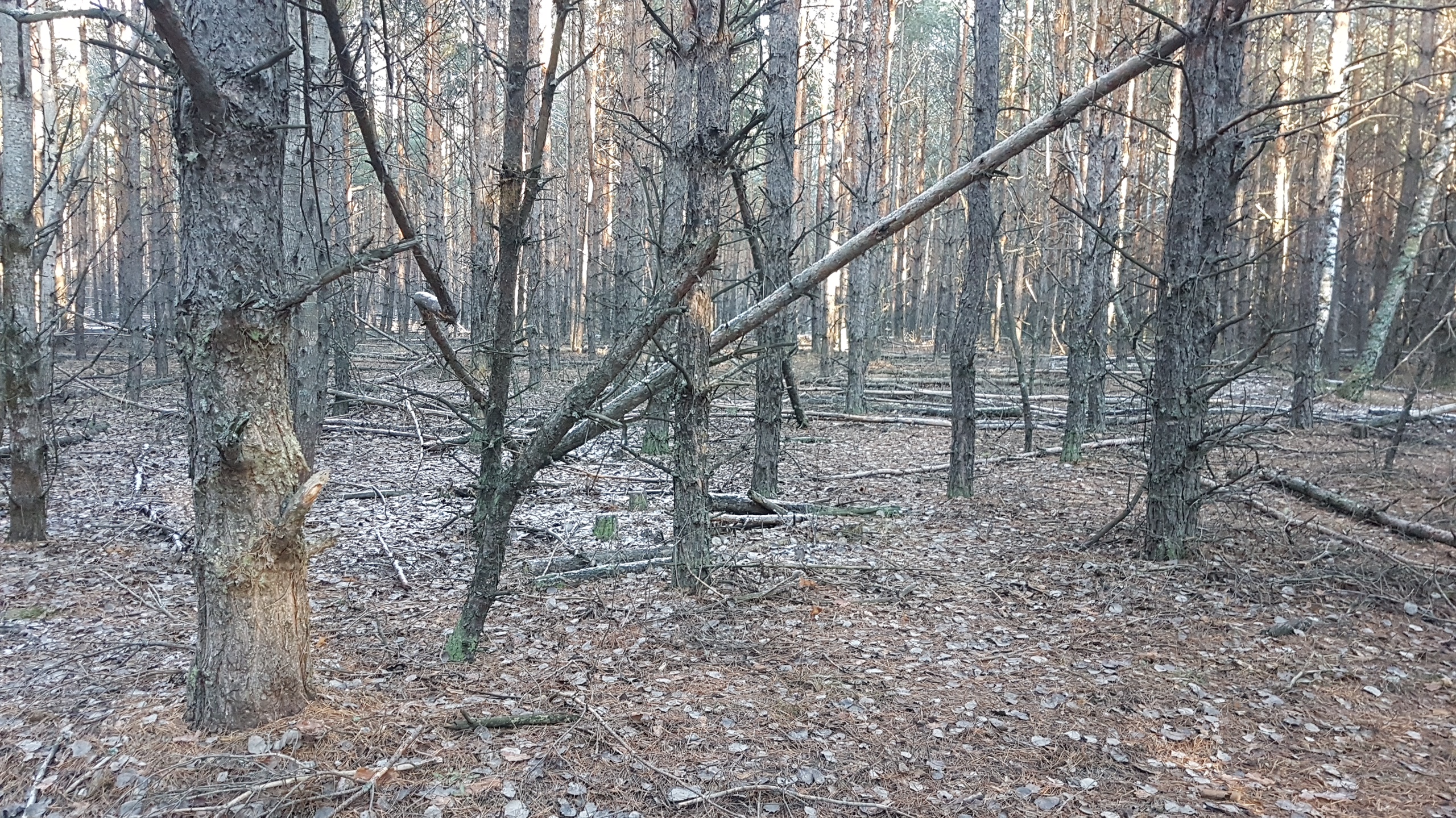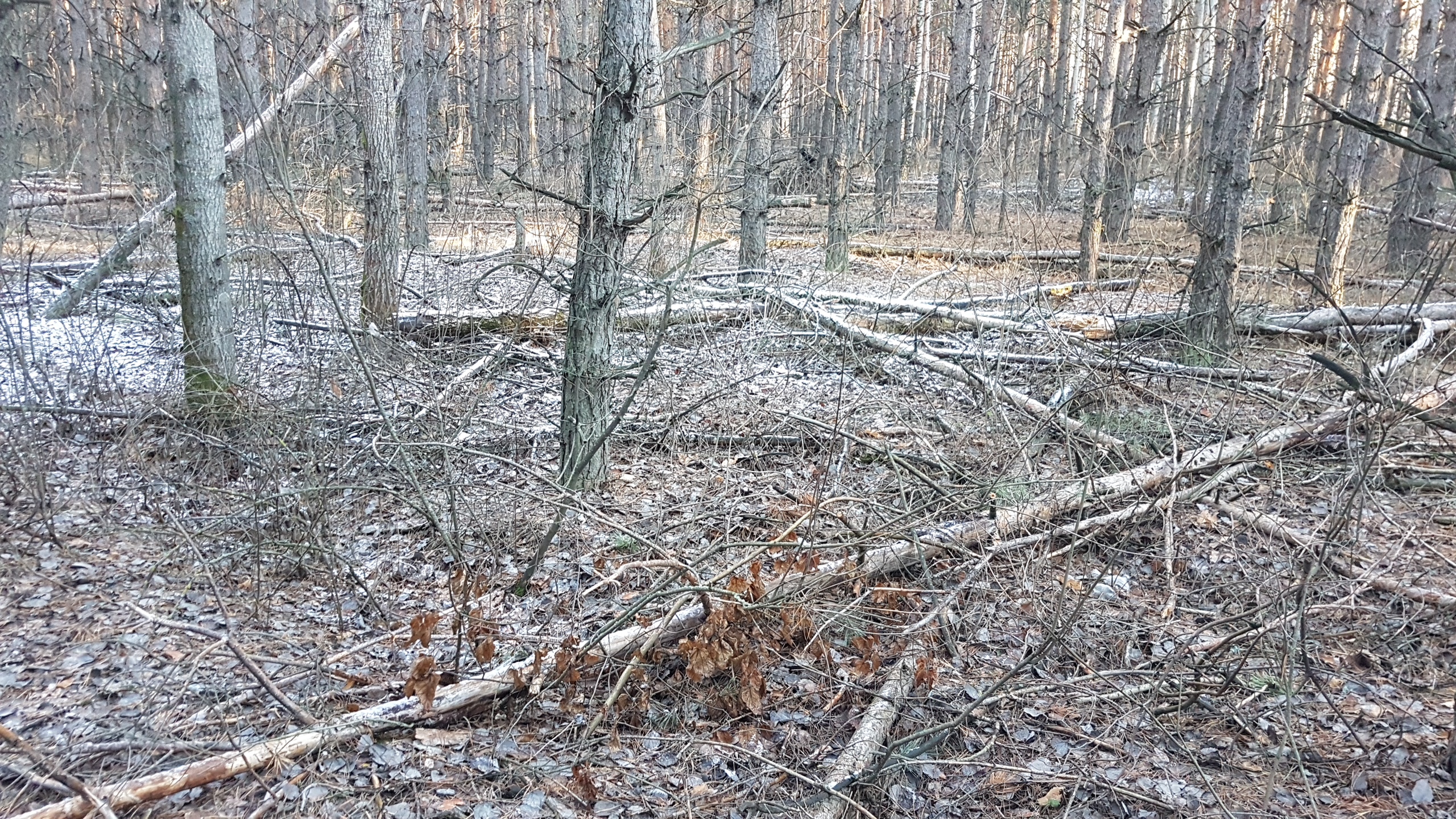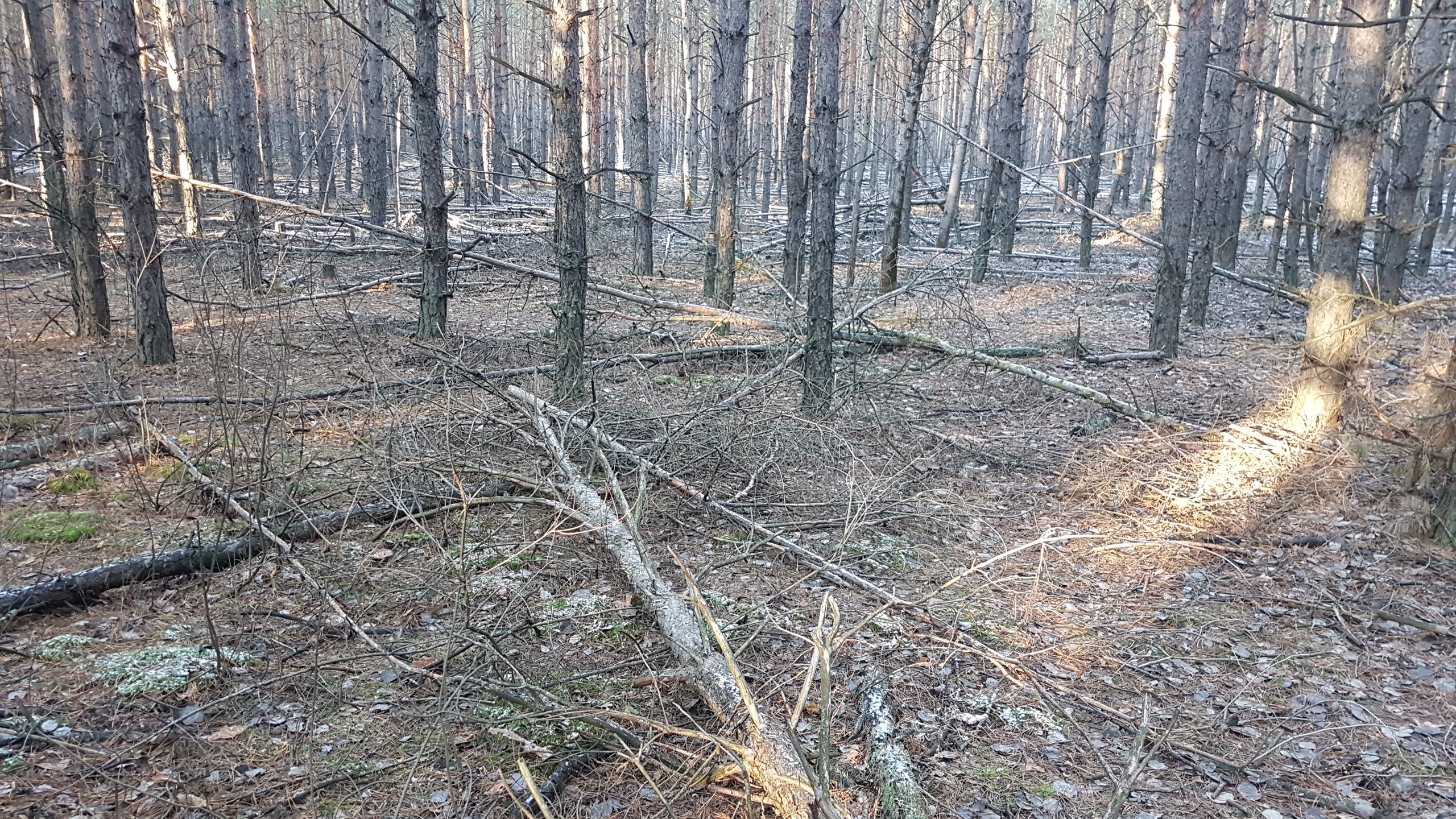 Вообще-то лес который год выглядит удручающе. Кругом густо поваленные деревья. И этого валежника с каждым годом становится всё больше. Ходить по лесу становится ужасно не удобно. Если ещё раз заеду туда, то наверное сфоткаю. Раньше был аккуратно посаженный лес. Ходили по рядам его,  искали грибы...