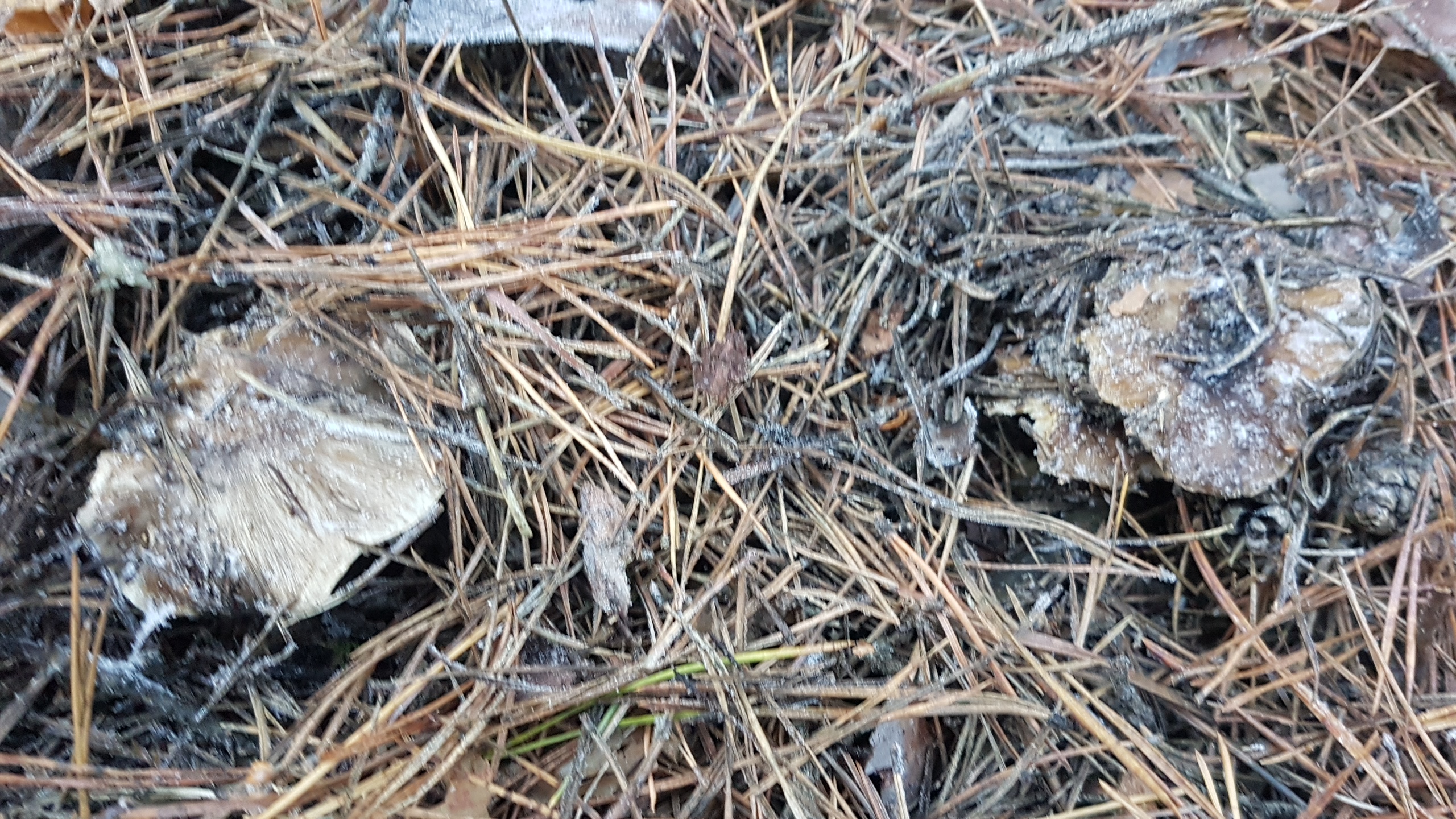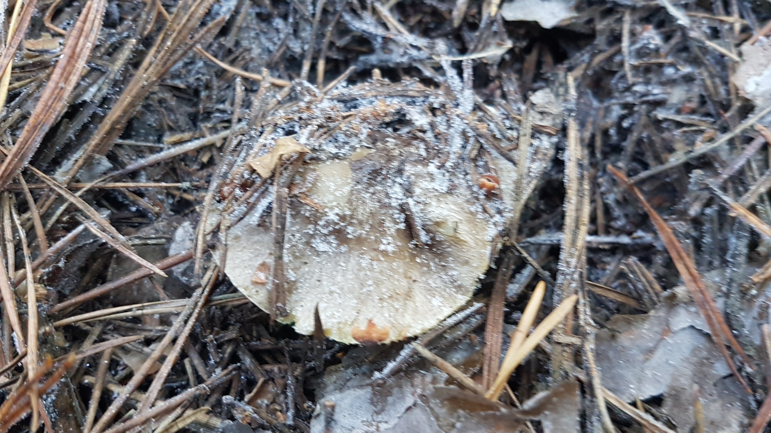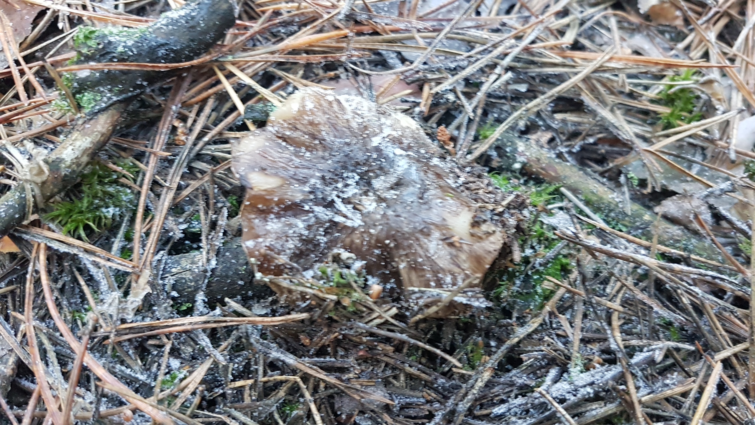 Грибы мы всётаки нашли, но брать их не стали. Вернее сказать взять их не возможно. Они смёрзлись с лесной подстилкой. Отделить от них веточки и иголочки нет возможности. Отламываются кусочки шляпки. Так и остались стоять в лесу твердые звенящие. Хотя нижний слой подстилки мягкий влажный и сама земля мягкая влажная, не замёрзшая.