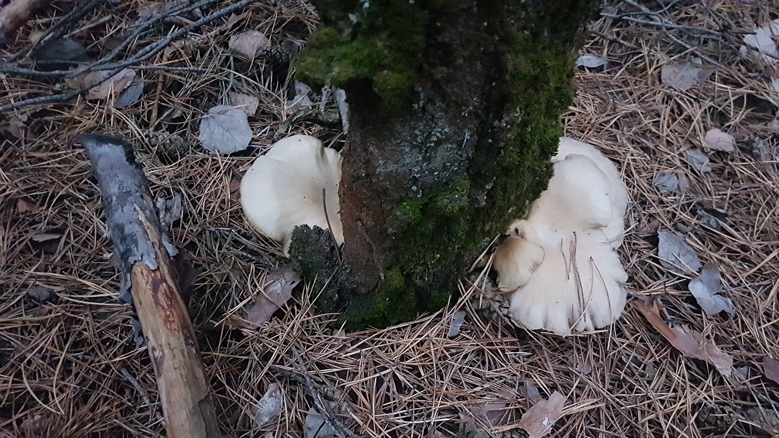Пока ехал в сосняк, по полям вдоль тополевых посадок, заприметил с колес пару семеек вешенки, не особо большие, где-то на пол ведра в обоих.