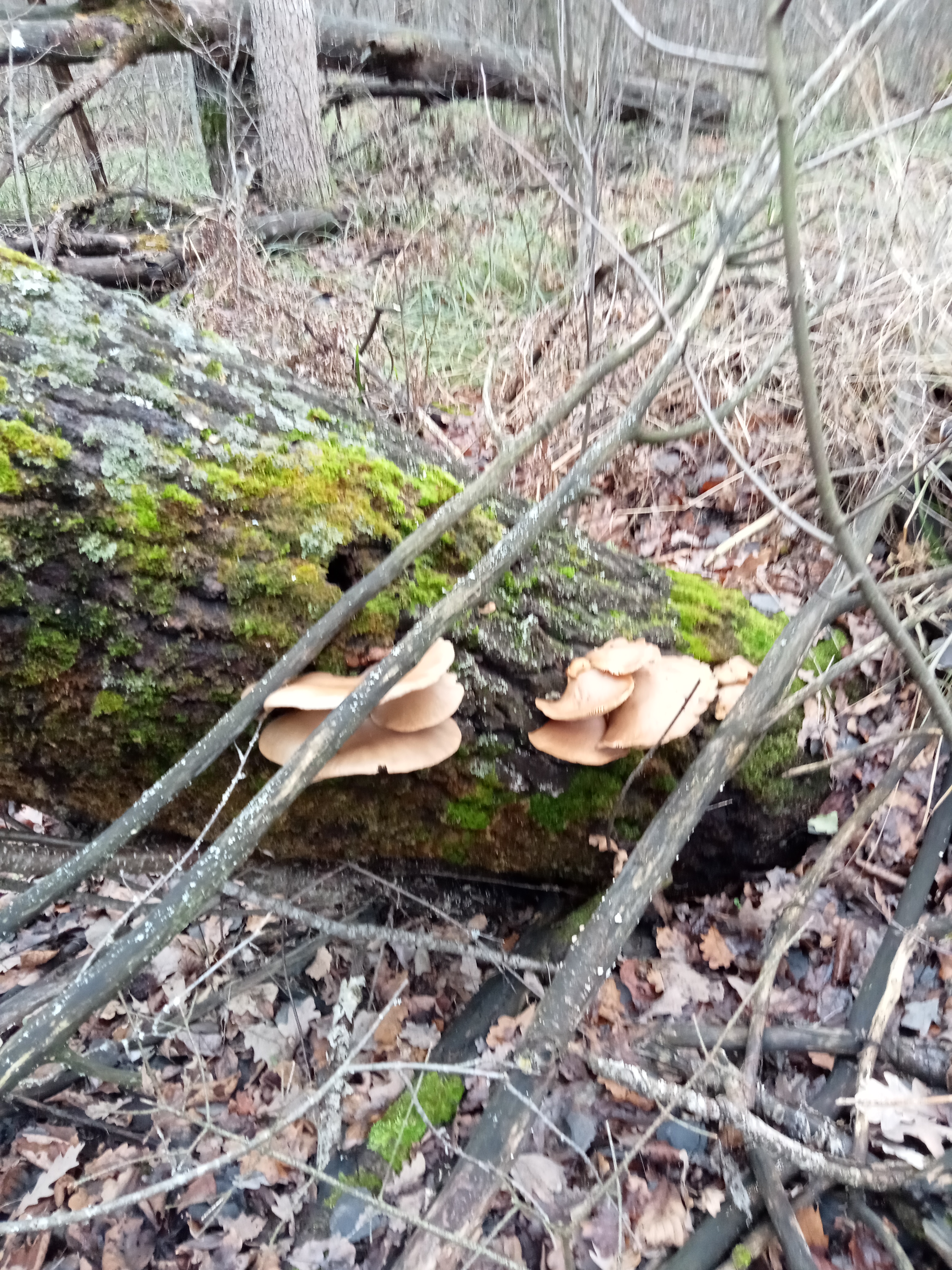Вешенки мы целенаправленно ни когда не собирали. Ну просто всегда других грибов хватало. Поэтому к качеству лесополос вдоль дорог на предмет произрастания вешенок ни когда не приглядывались. А тут, почитав ЕвгенияВРН, решили, что это повод выйти из дома на свежий воздух. С чего начать поиск грибов? С мест их произрастания. А вот этих мест мы и не знаем. Решили обследовать правый берег Дона вдоль асфальтовых дорог. Каталки свои подробно описывать не чего. Всё стандартно. Подъезжали, останавливались, проходили посадку и дальше ехали. Проще сказать выехали по курскому мосту, вернулись через семилукский мост. Побывали в семилукском, рамонском районах. Удалось отломить (мерзлые) всего несколько старых вешенок. Но гвоздём программы у нас оказался тёрн. Небольшой лесок был весь заросший тёрном. В лесу ягода была крупная сочная, слегка побитая морозцем. Поэтому ужасно сладкая. Ели, ели, ели. Уже 'от пуза' наелись, а всё ещё хочется и хочется. Это безумие продолжалось каких-то 30-40 минут. Потом стало темнеть. Успели ещё набрать пакет для родственников любителей тёрна. Фоток сделать не получилось. С грибами не было красивых грибных мест. С тёрном не думали, что скоро потемнеет.