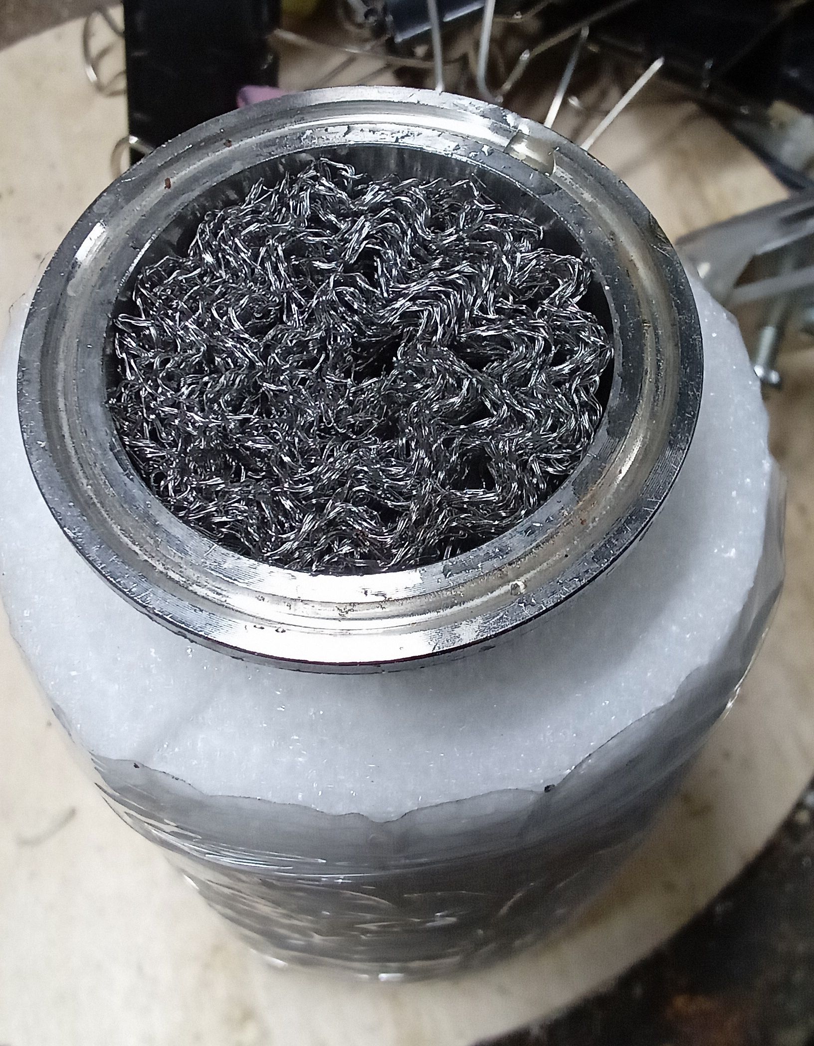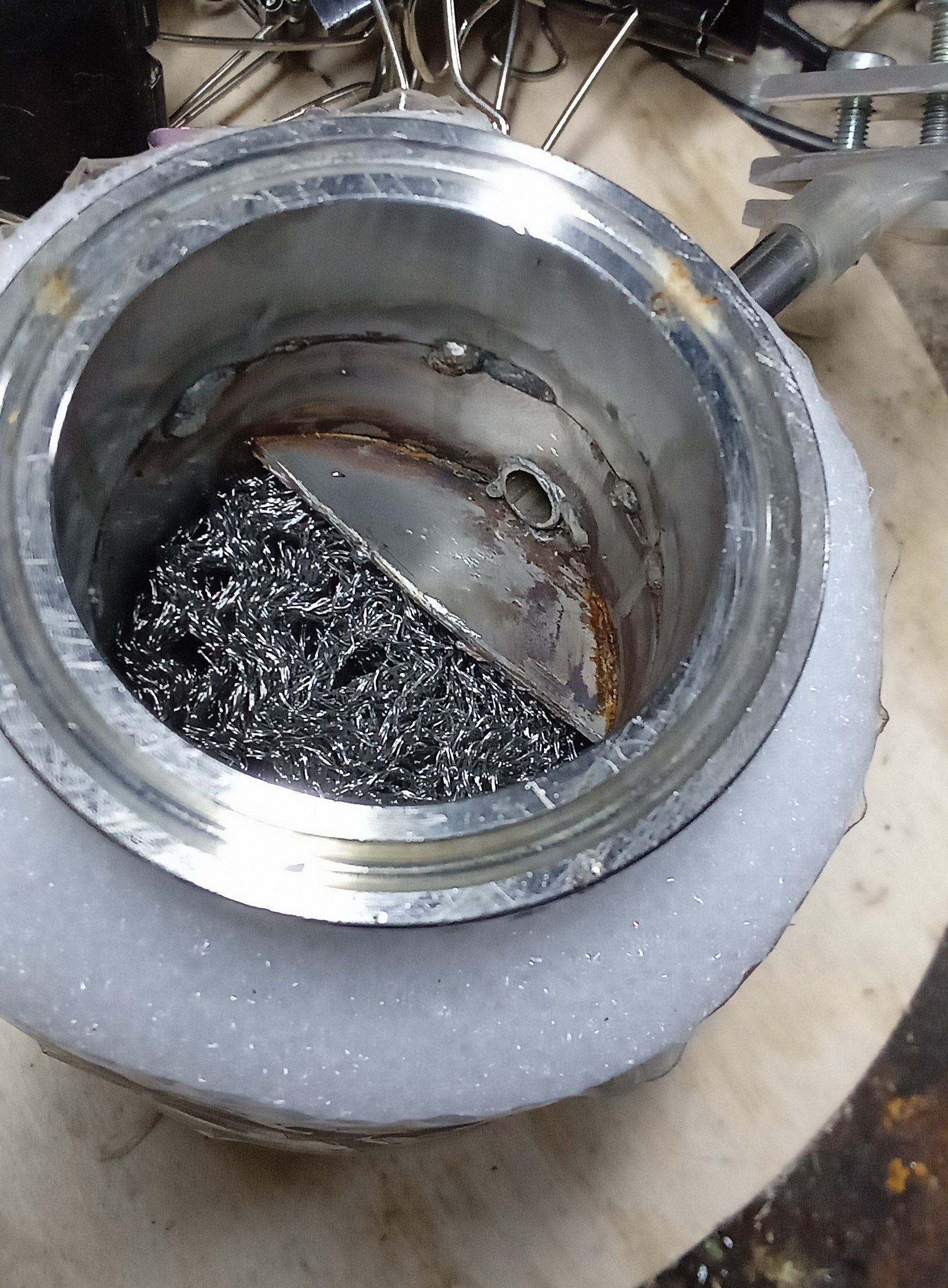 Потом собираю колонну под прямоток. Внутрь медная насадка, 20см колец Рашига 8х10мм. Отбор на средней мощности до 87С в кубе или 70-75% в струе. Это тело №1.