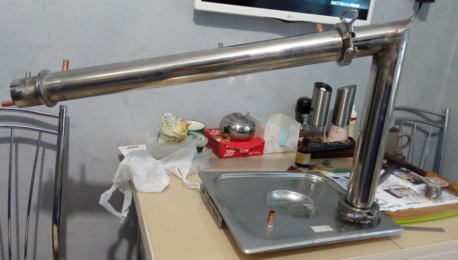 Со временем я пришел к тому, что для перегонки браги, перегонки зерновых и фруктовых напитков мне нужен нормальный прямоток. Прима, в том виде, который у меня сейчас, больше подходит для укрепляющих перегонов. Проблема в том, что 2" труба колонны заканчивается длинной трубочкой 12мм в холодильнике. Это создает сопротивление пару и снижает скорость перегонки.