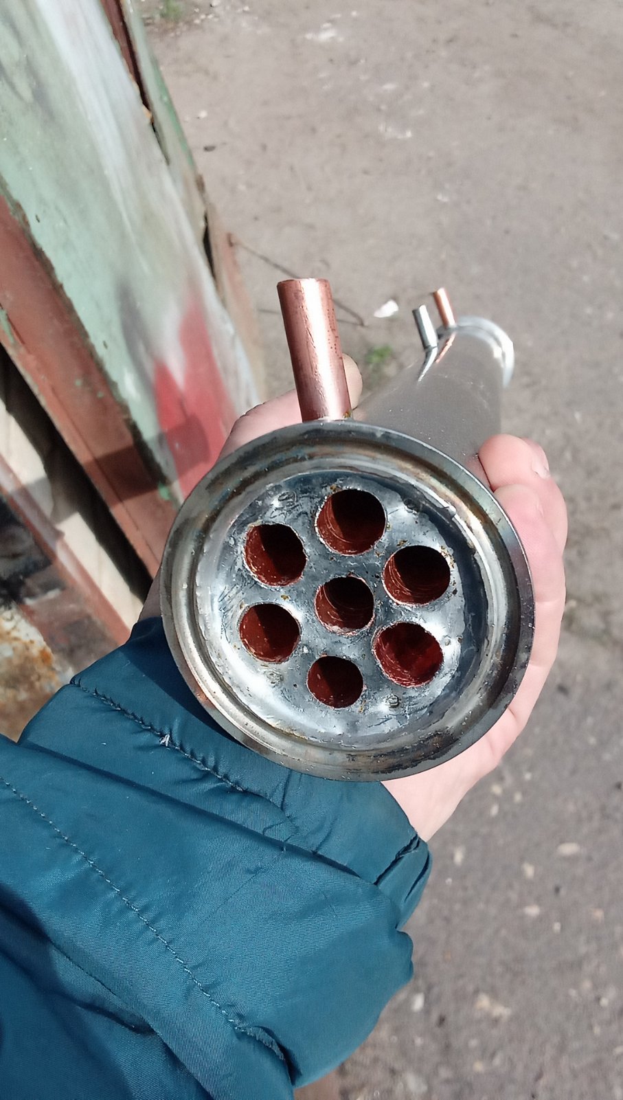 Я взял валяющуюся без дела царгу 500мм, впаял в нее по всем правилам (с перегородками) 7 медных тонкостеных трубочек даметром 12мм каждая. Получился мощный холодильник!
