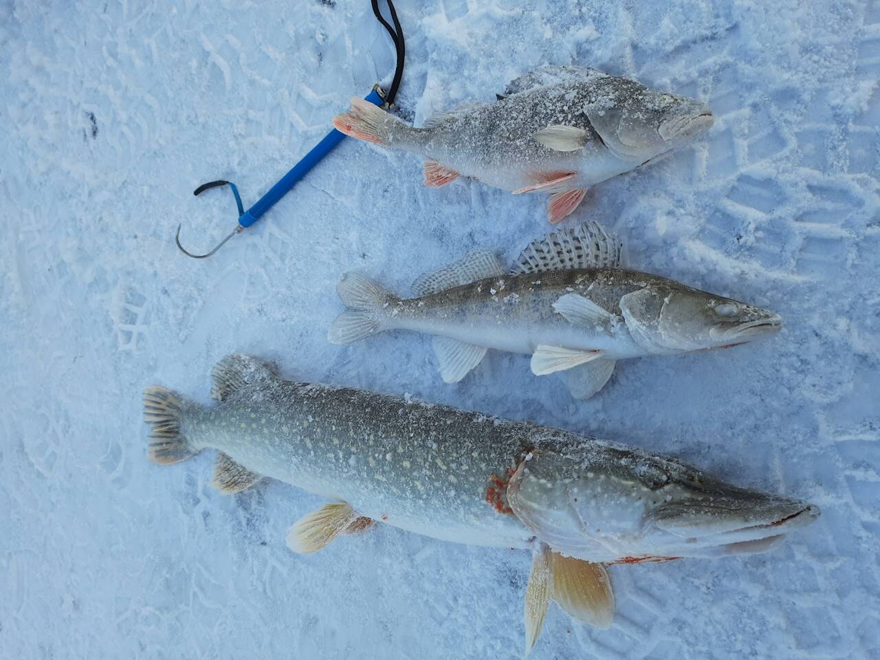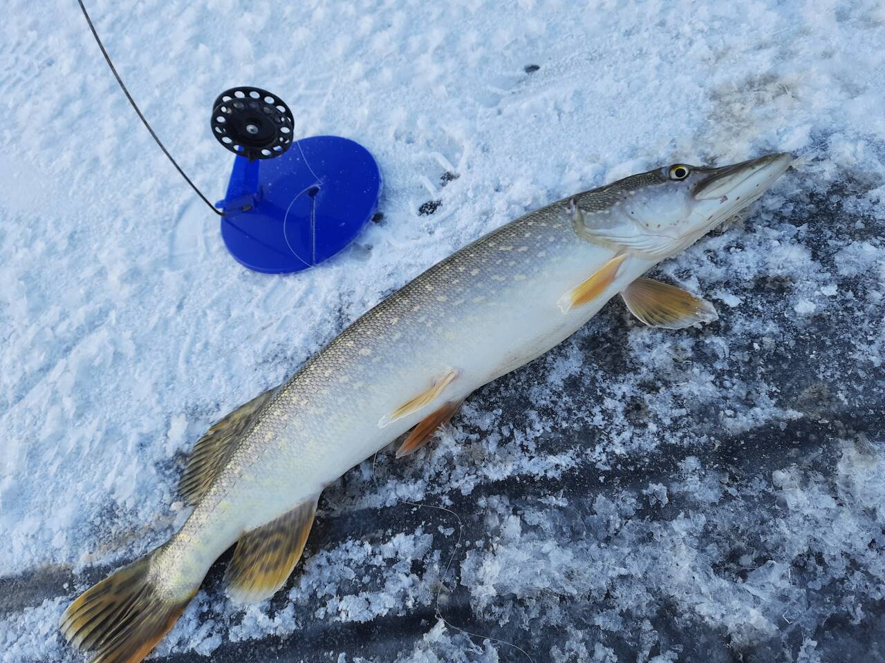 Буквально на следующей лунке, со второго взмаха опять поклевка и щучка потолще оказалась рядом с первой.