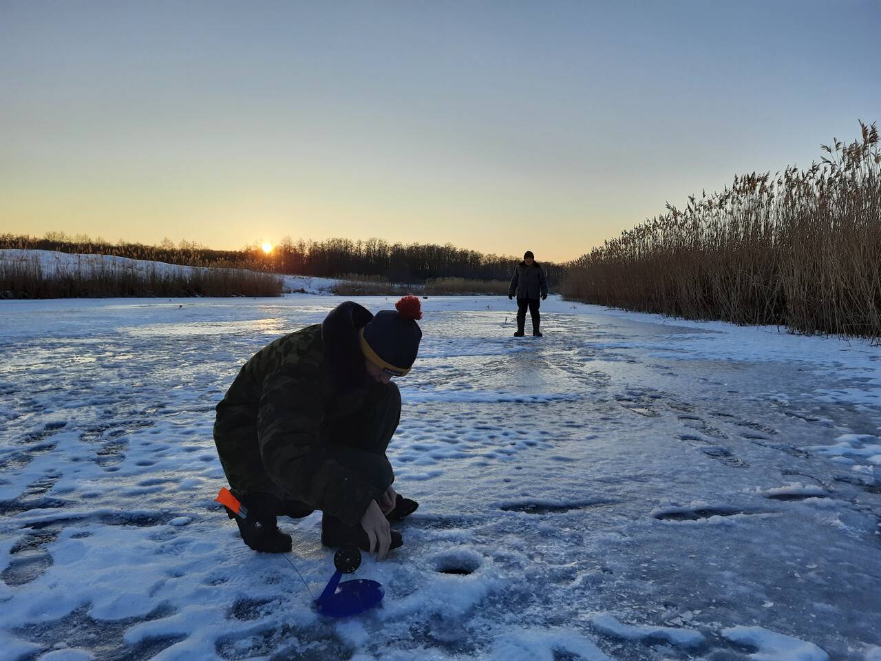 Сегодня открыл свой сезон твердой воды. Приехали на пруд на рассвете, -22 Решили чуть посидеть в машине, чтобы совсем светло стало, лед видно было, какой он)). Лед не толстый, 7-8 см не больше, бурить легко)). Разошлись в разные стороны, искать зубастую, балансиры естественно тоже разные повесили. Мороз и ветер прям совсем не шутили, руки даже в перчатках замерзали. Первые несколько десятков лунок не принесли ни одной поклевки, а мороз продолжал давить(((