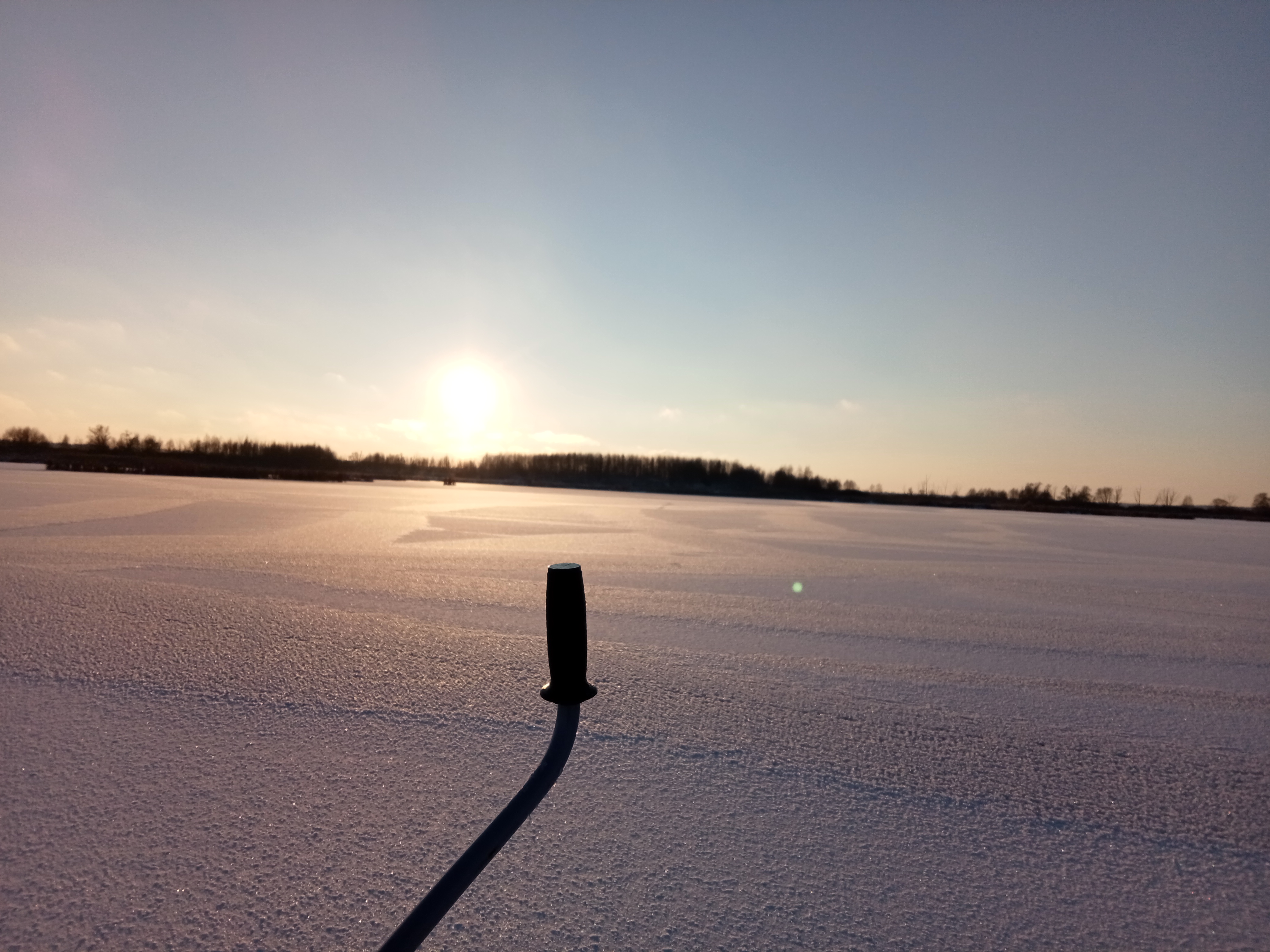 Сегодня после ночной смены в обед помчал на Тихую сосну. За час до заката неспешно втроем с отцом и старшим сыном расставили 20 жерлиц. Лед хороший, даже на самых засадных местах 10+ см. Отцу "шуриком" орудовать понравилось. Минус, только в том, что погреться не получается.