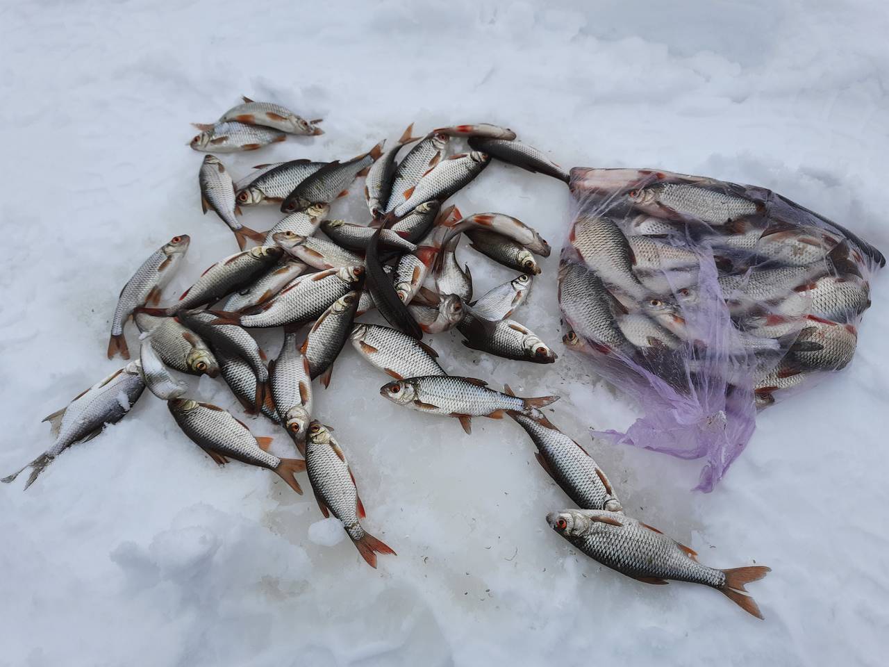 Пытаюсь подловить живца,как в коллдце,ни поклевки,закормил две лунки,пообедал и часочек придавил ,,на массу,,. Помогло,плотвичка собралась на прикорм.
