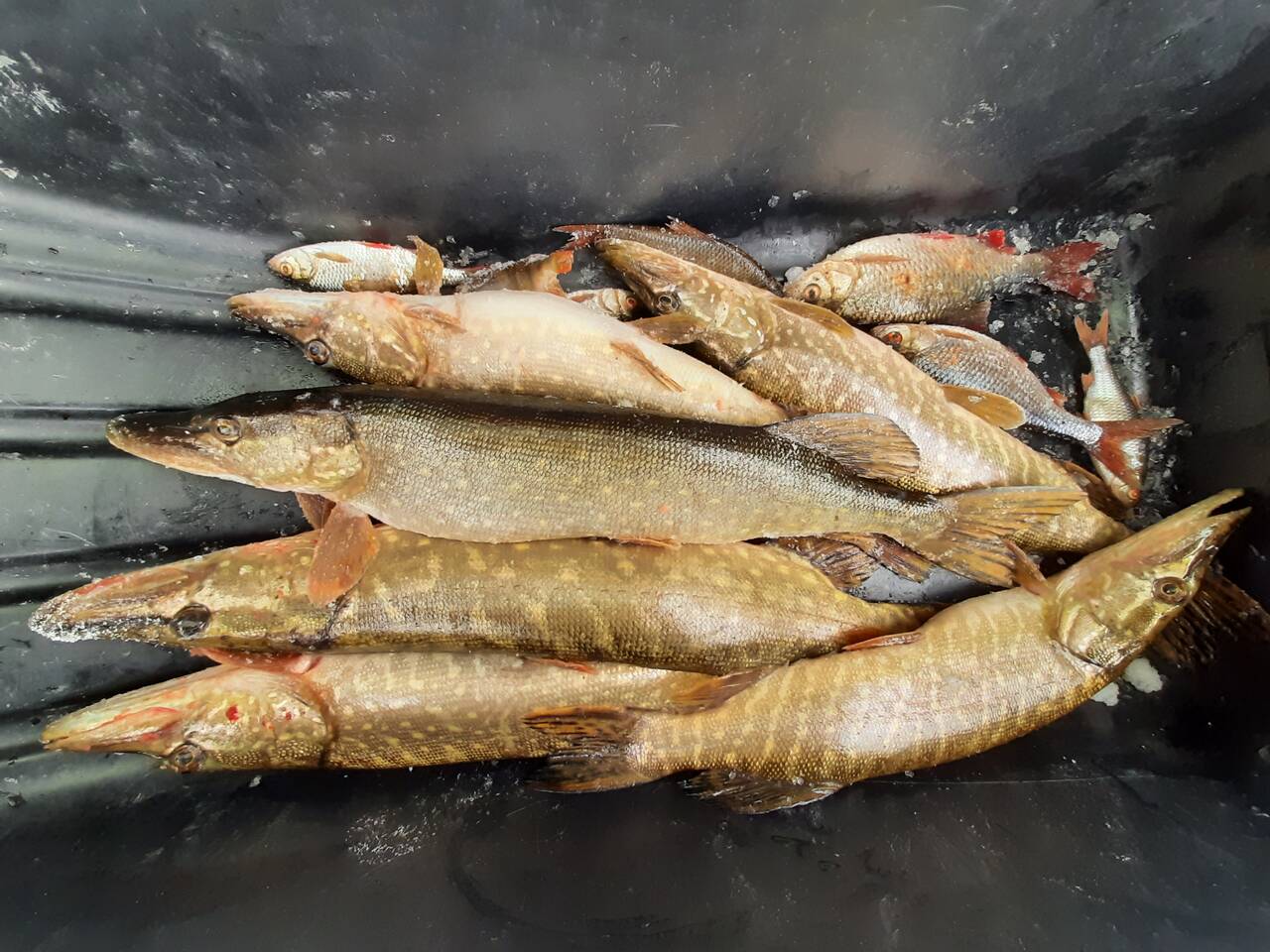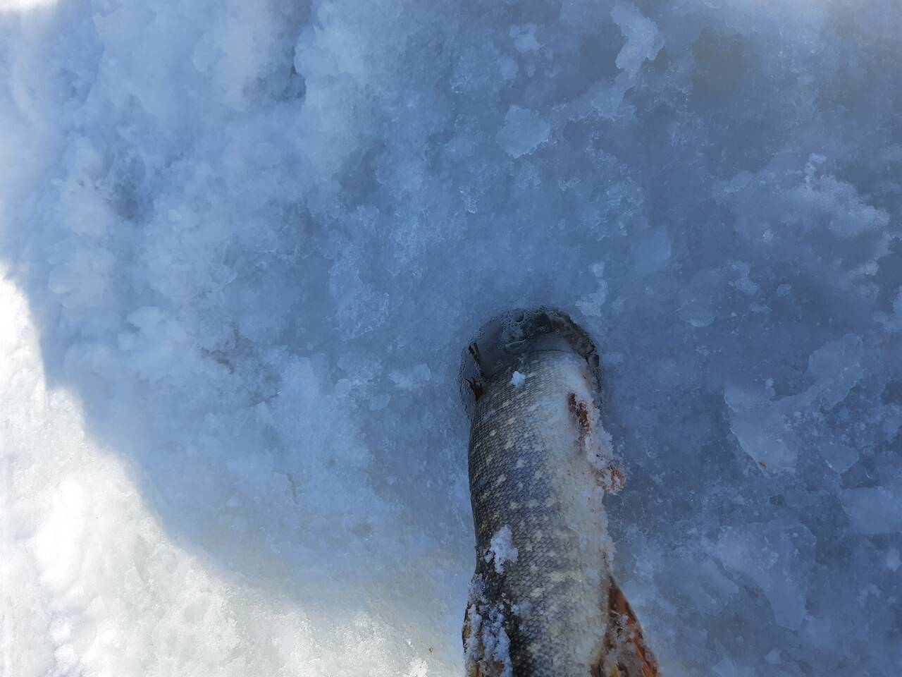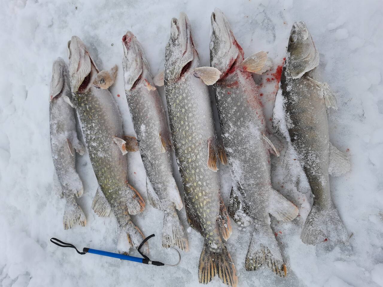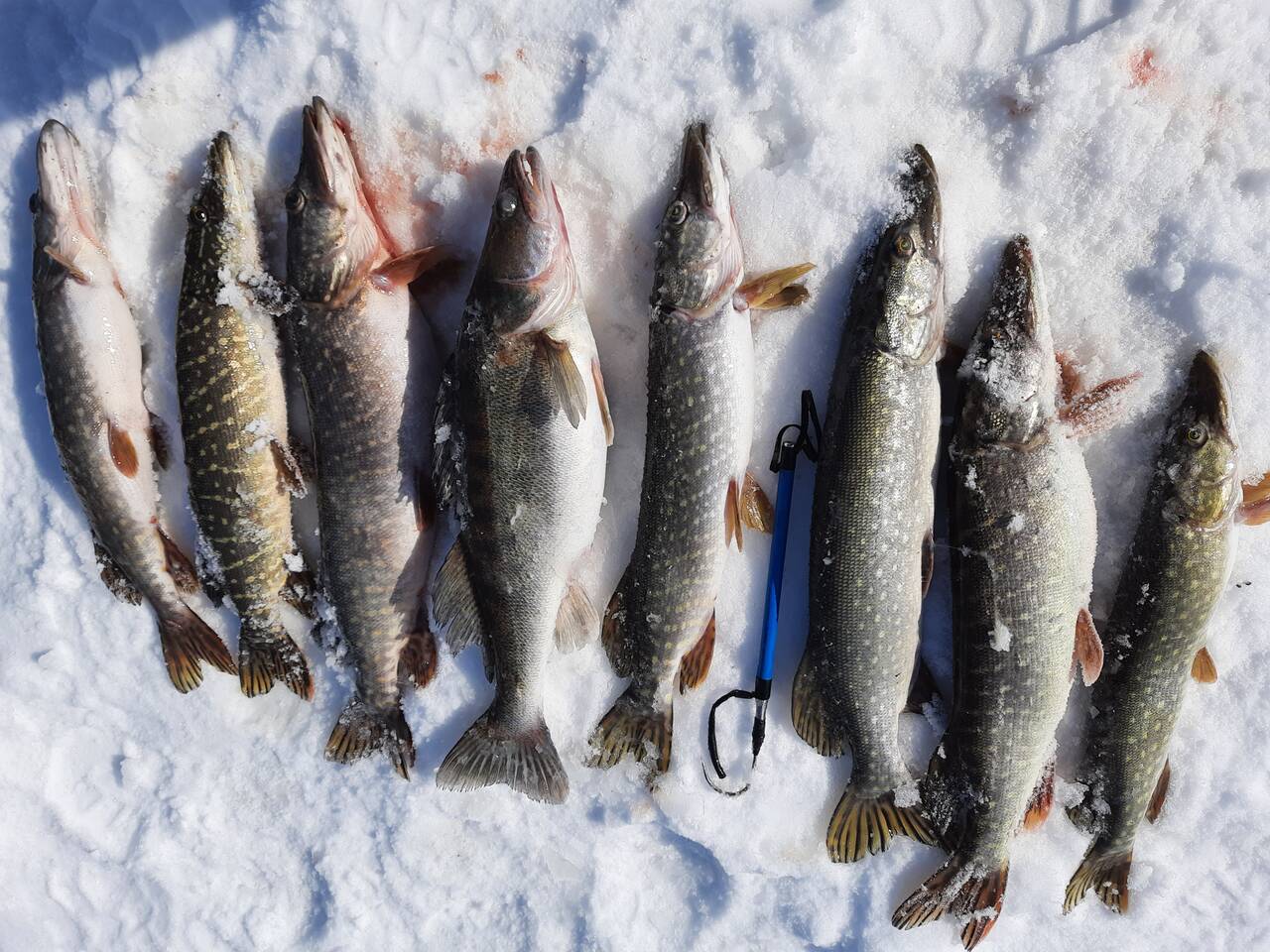 До места ловли 2 км в одну сторону по льду. В 4 утра -13, снега по щиколотки, местами больше, полные сани скарба, язык на плече вместо шарфа. В процессе расстановки клюнул поддвушечный клыкастый. Попал под нос. На рассвете был хороший выход щуки, размер от кило до двух с копейками. Затем до 11-00 по одной в час. На 1 жерлицу поймал 4 щуки. Итого 10-8. Трех удалось реанимировать и амнистировать.