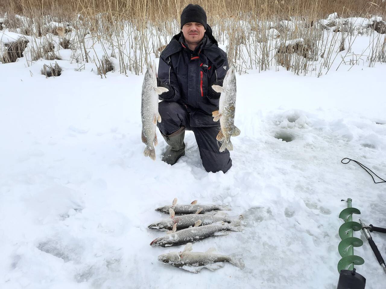 Сегодня с Денисом и Женьком, наверное,закрывали зимний сезон!!! В этом году кроме Воронежского Водохранилища ни куда не ездили, на крайний лёд тоже решили остаться сдесь, тем более места шикарные и от дома не далеко!!! Прибыли 5-30, мороз -12, ветерок приличный, северный, по темну расставились, а с рассветом по ощущениям ещё похолодало градусов на 5-ть наверное, ветерок вносил свои минысы. У меня первый флажок около 7-ми, щука вообще не мотала, подождал ,покурил, начал потихоньку выбирать леску, что то зашевелилось на том конце и пошла леска в лунку!!! Щупарик стандартный для этого места, около полторашки, второй подъем уже около 10-ти, такая же хрень, вообще не мотала, зато проглотила до самой Ж. В 11 начали мотать снасти, сезон думаю закрыл, пескаря отпустил!!!