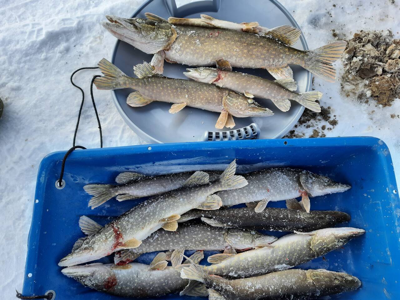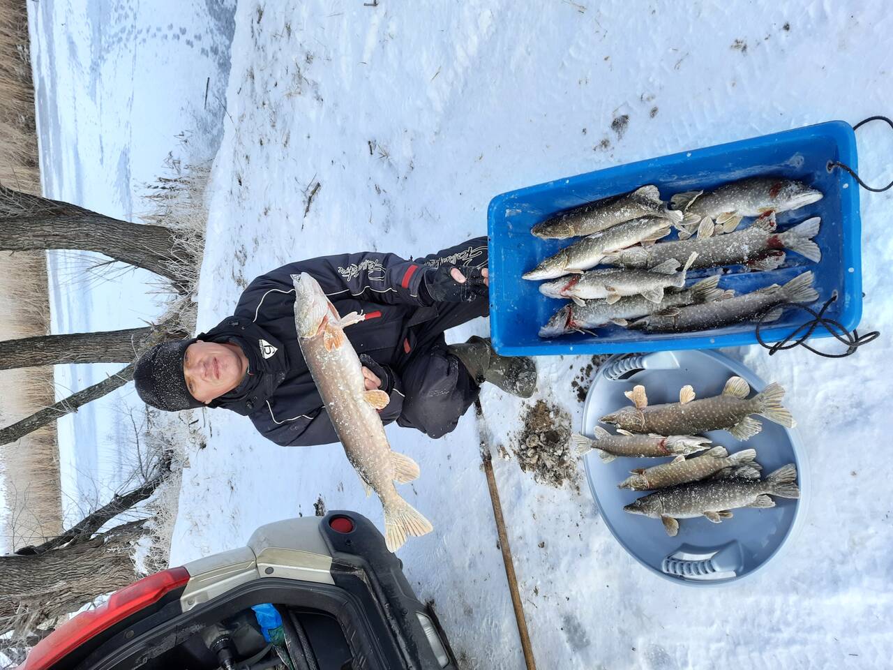 Продолжу. Утром в области мороз -25. За ночь из 20 жерлиц ровно 10 флагов. 4 щучки сняли. Одна на 2,6 остальные докилошки. Освежили, точнее перебурили лунки, проверили живцов. И с рассветом понеслось! Забегались. Но в основно баловались и переводили драгоценных живцов щукины дети. Отпустили с десяток недощук. Немного забрали. На ледянке ночной улов, в санях- утренний.