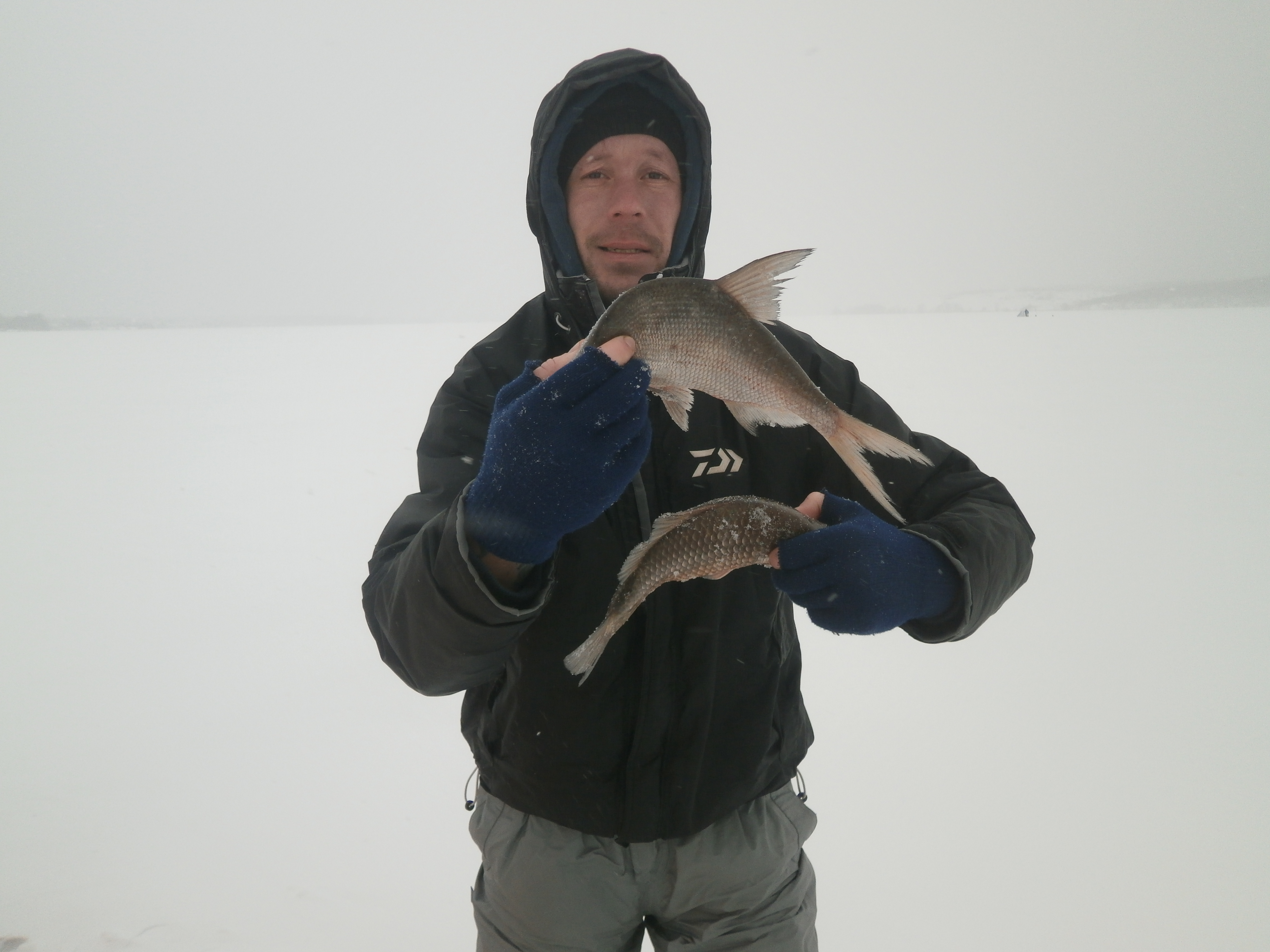 К 7-ми примерно были на месте, пока дошли до точки, забурились, тишина, но кстати не ветра ни снега не было. Как только рассвело, все поменялось, подул ветер и пошел снег, ни скажу ,что было холодно, но неприятно, короче решил разложить палатку, совсем другое дело.