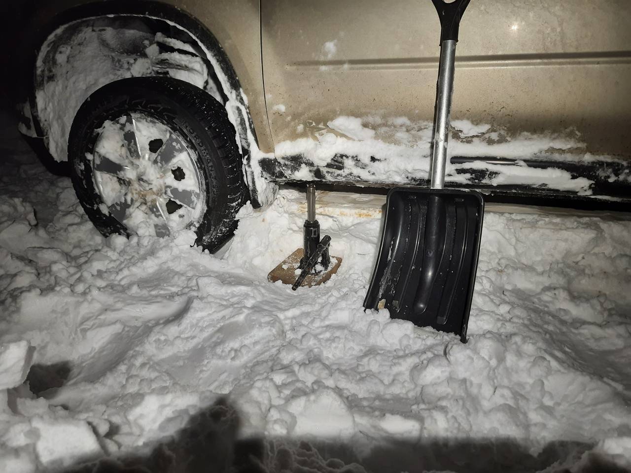Не учел, что при таком ветре поземок ставит нехилые сугробы. Когда снег был по номер, машинка еще справлялась, бодро ехала, но когда до фар, на полпути повис на брюхе. Снег сырой, тяжелый. Дверь еле открыл, думал уже придется через окно вылазить.Часок упражнений с домкратом и лопатой и я снова на асфальте.