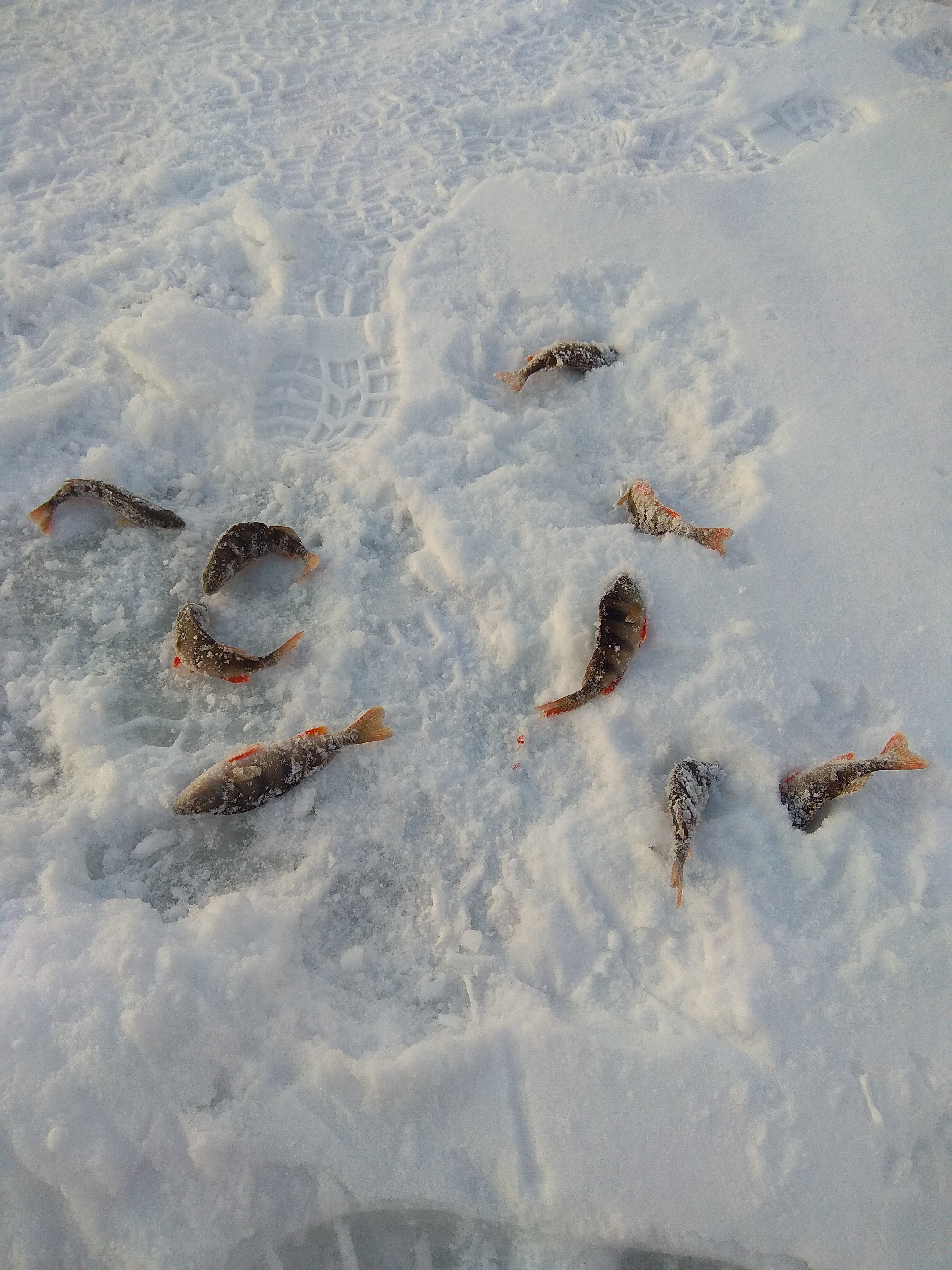 По рыбе у нас очень грустно, на троих десять окуней, при том, что лунок пробурили как никогда много.