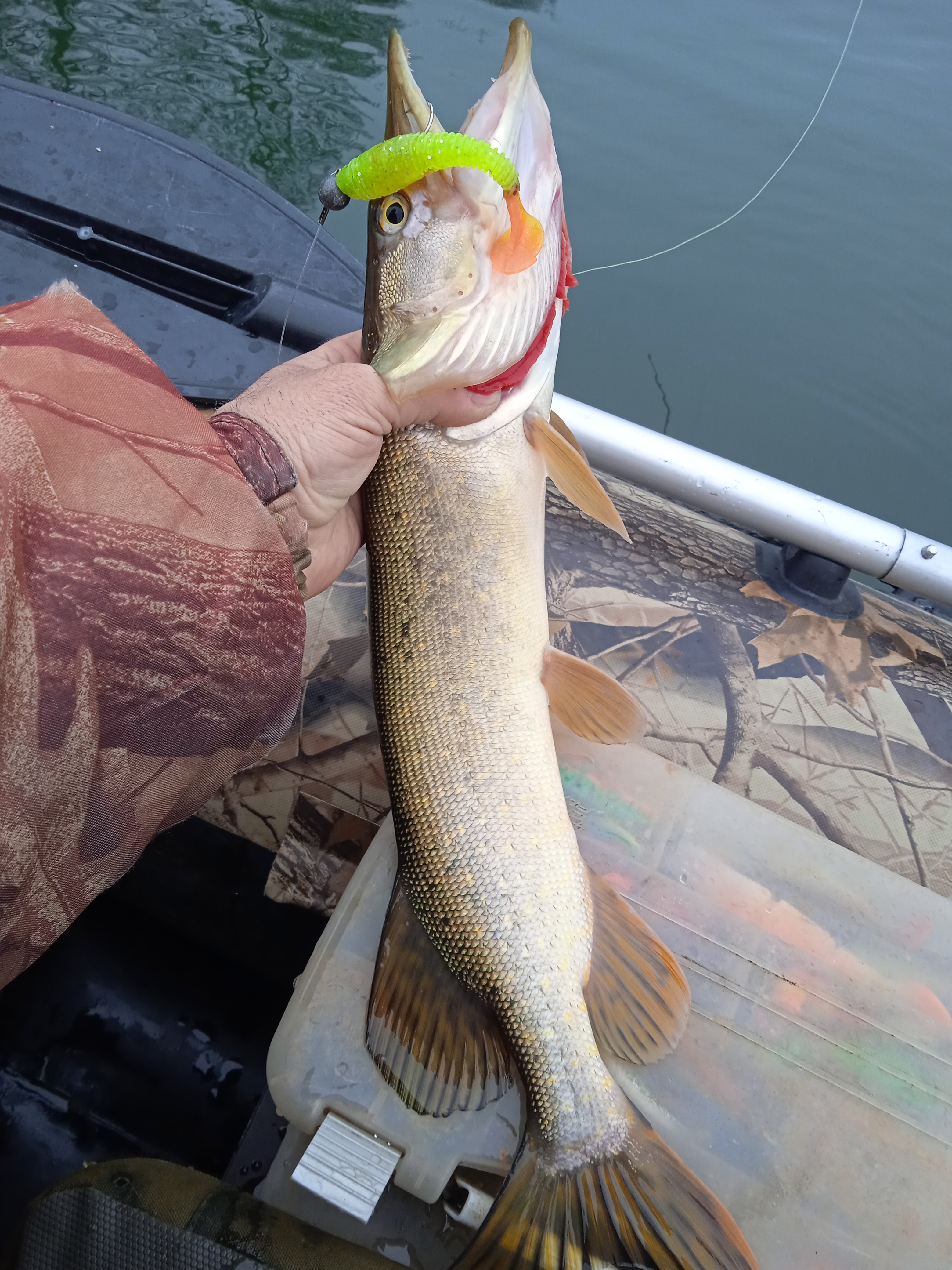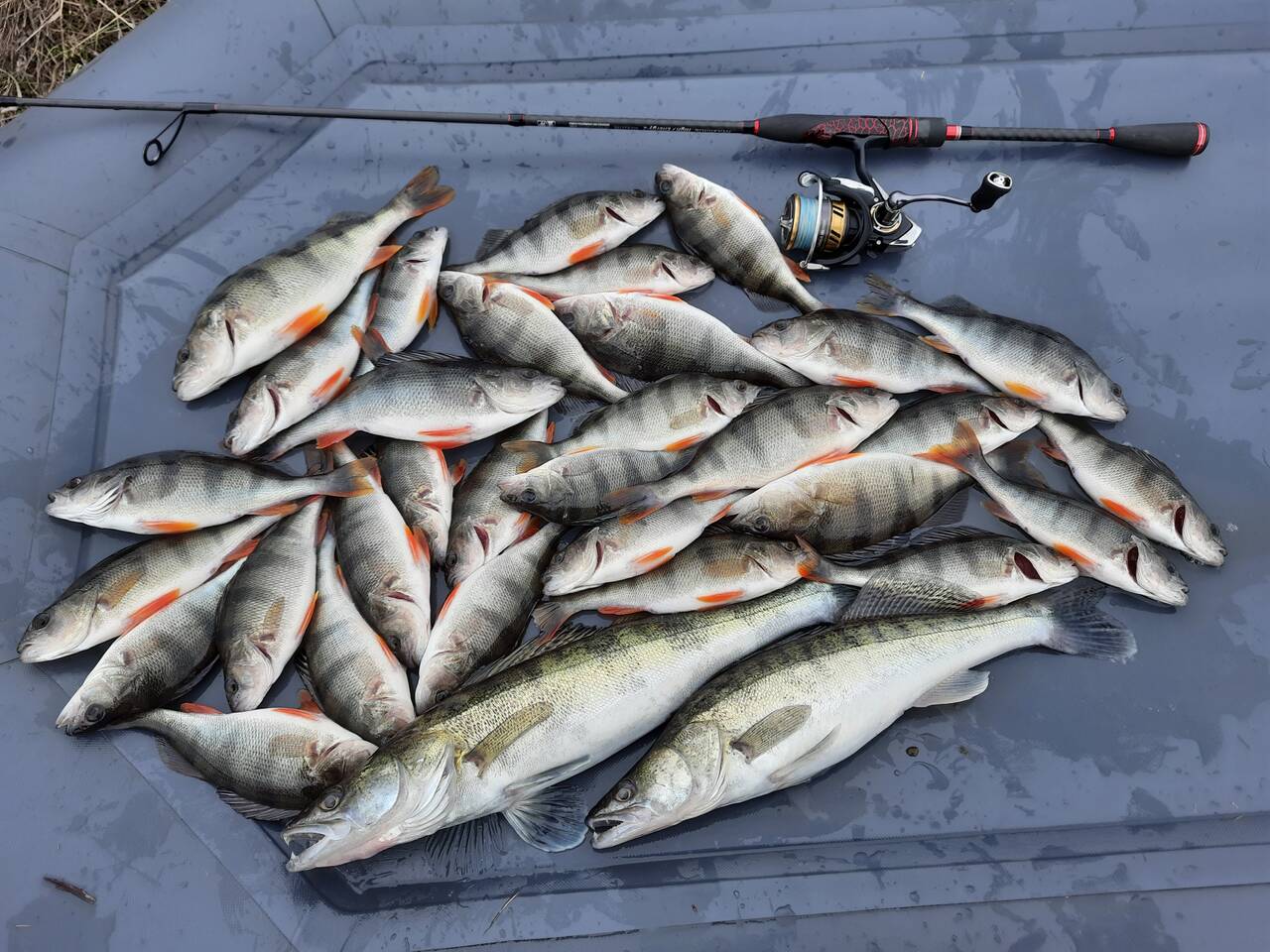 Я занял свободное место и стал ловить. Ну как, ловить - забрасывать и наблюдать как рядом стоящий мужик (слева) достает судаков почти на каждом забросе. А справа в это время вытащили небольшую щучку.