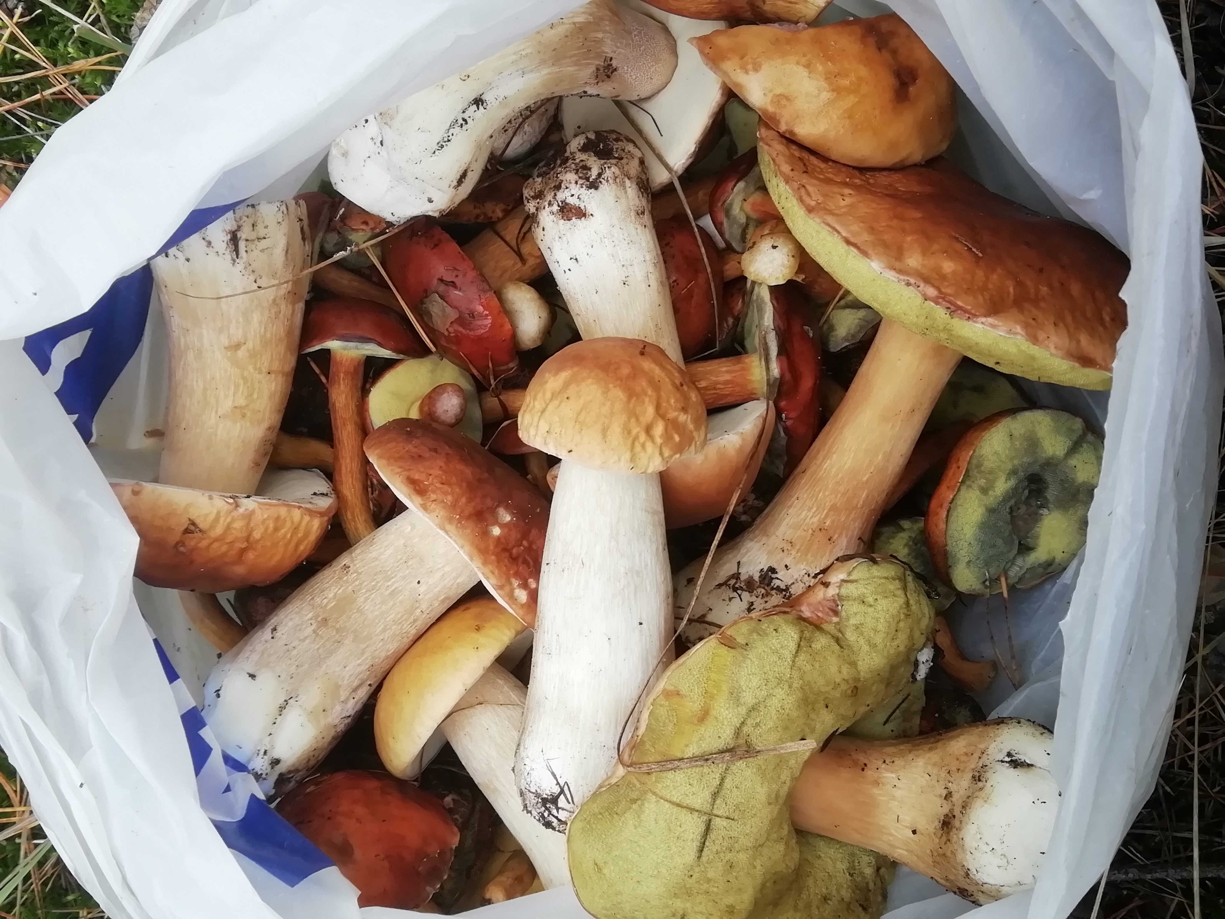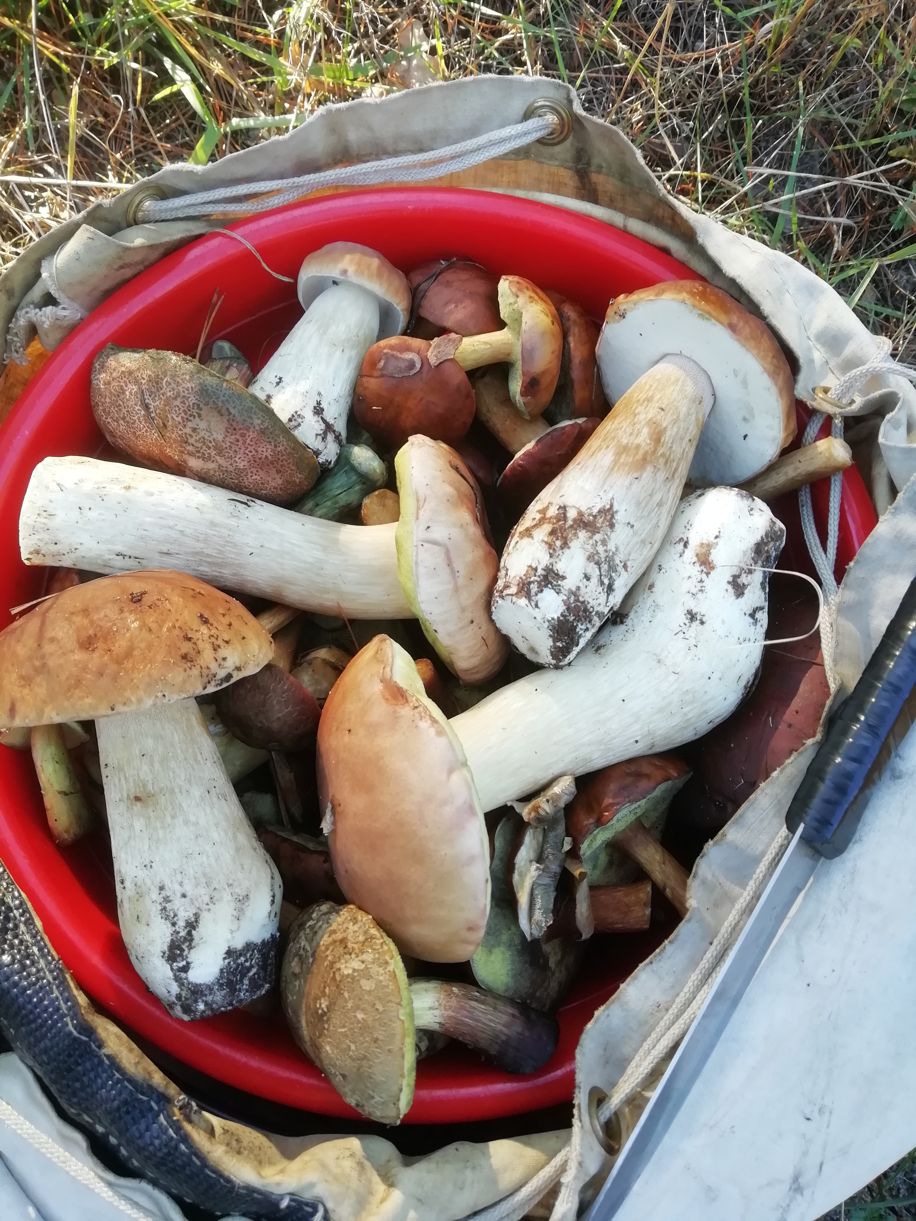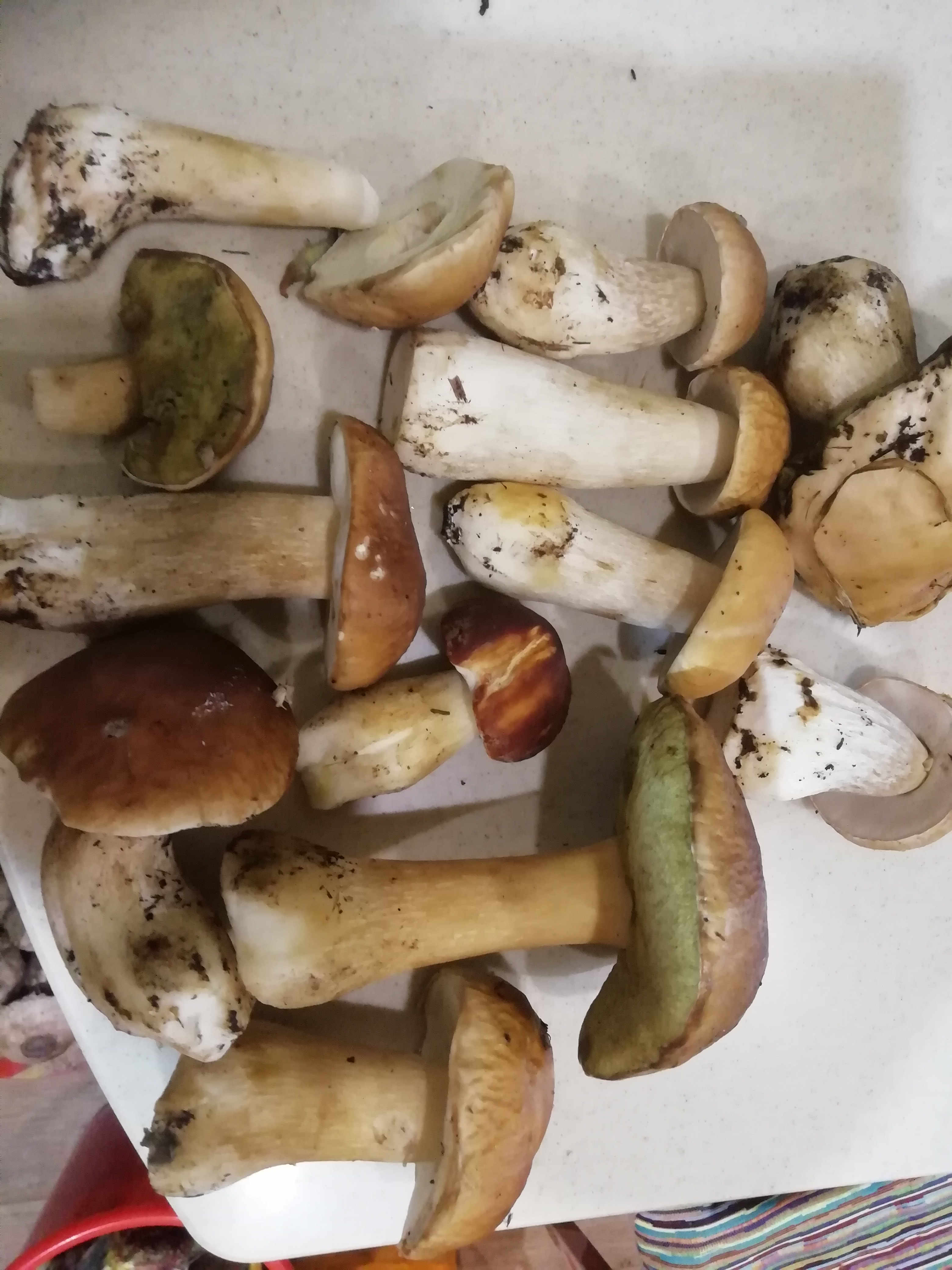 Ну а в четверый поход (3 дня назад) белых уже не нашел....Пару-тройку срезов увидел....значит не мои...Польских ведро насобирал, но уже тяжеловато... И многие суховаты... Пятаками .По факту с трех мест ведро собрал, а так много участков в лесу пустых... Пару видов моховиков,опята в прилове...