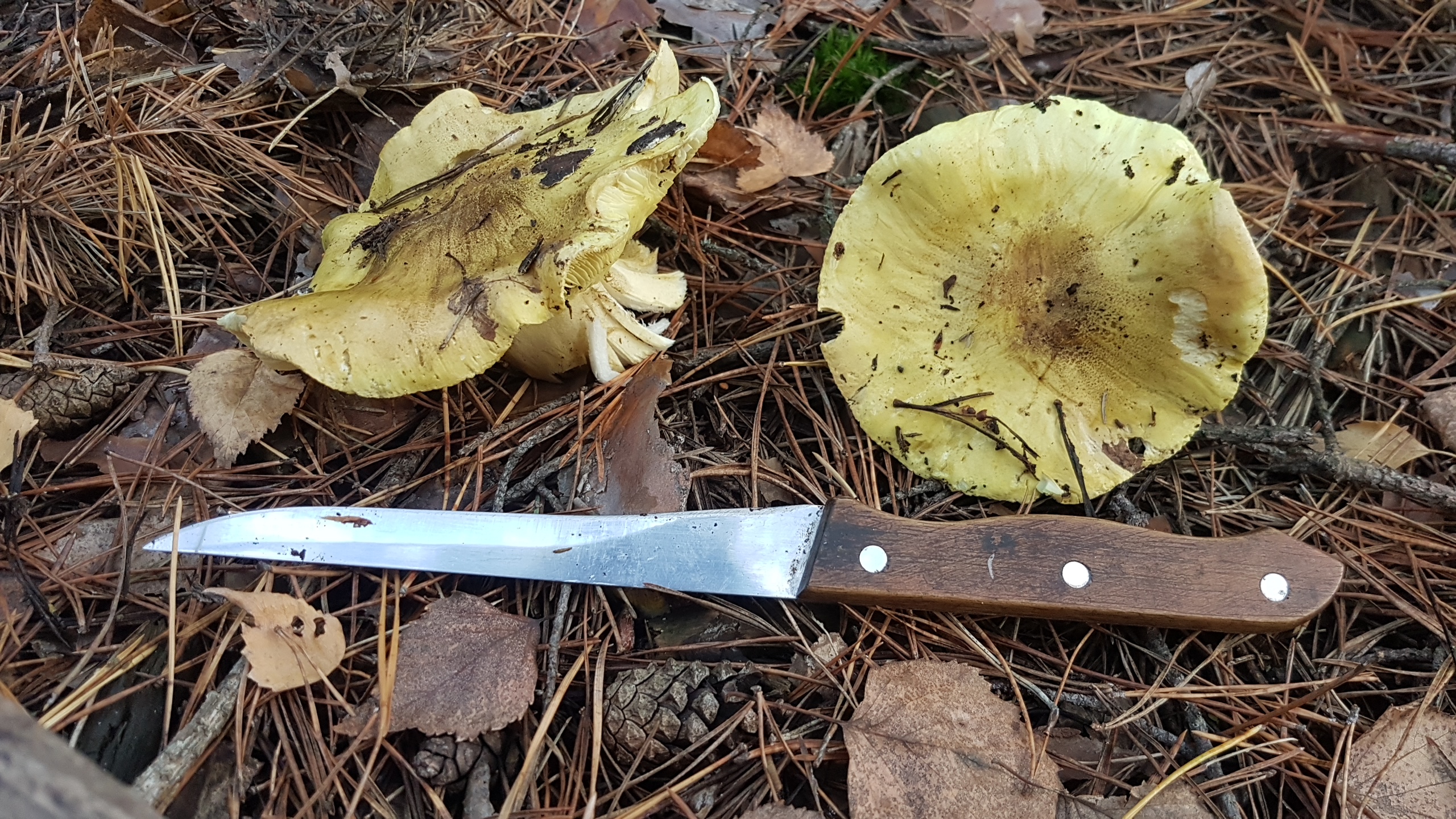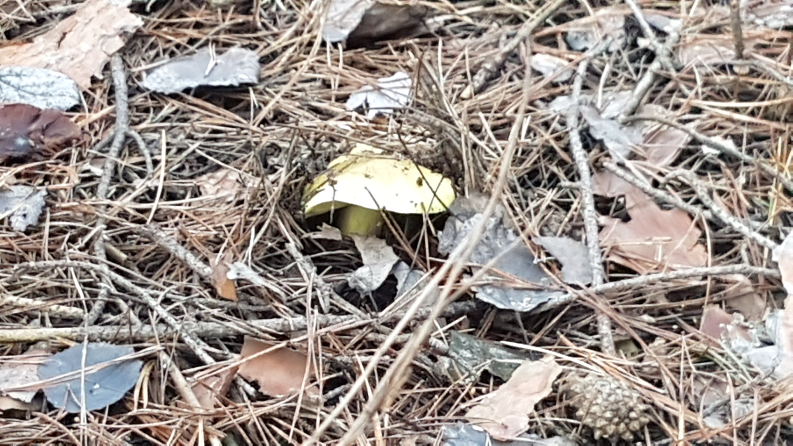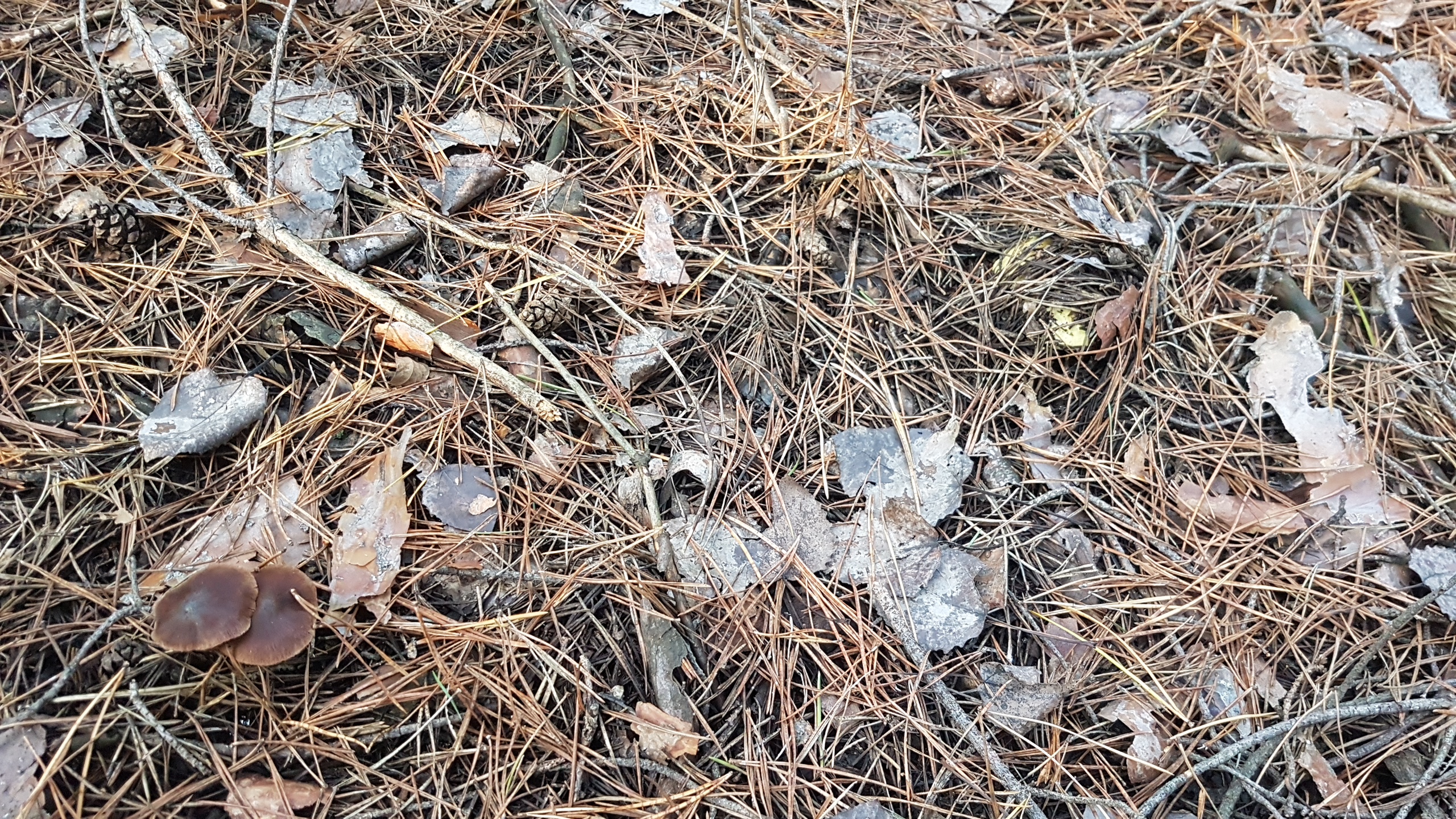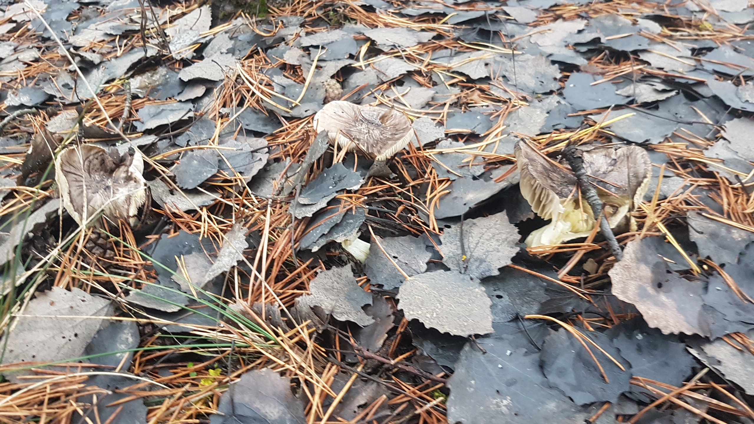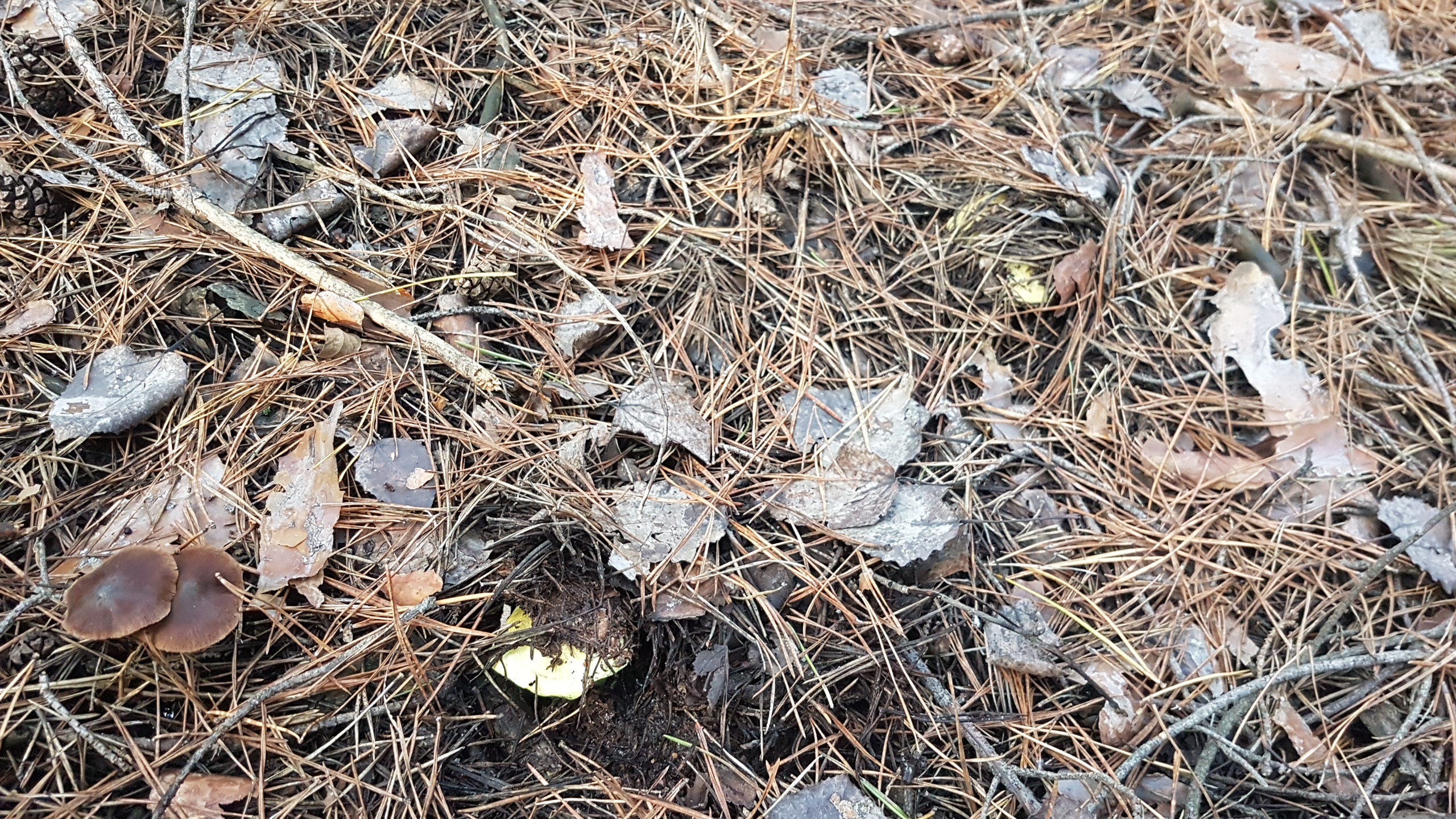 Зеленушки перестали рости в листве. Там стоят очень старые экземпляры с лопнувшими от воды шляпками и сильно покоричневевшем верхом. Стали появляться грибы в сосновых иголках. Но всё равно недалеко от границы с лиственными посадками, то есть чтобы света было больше.